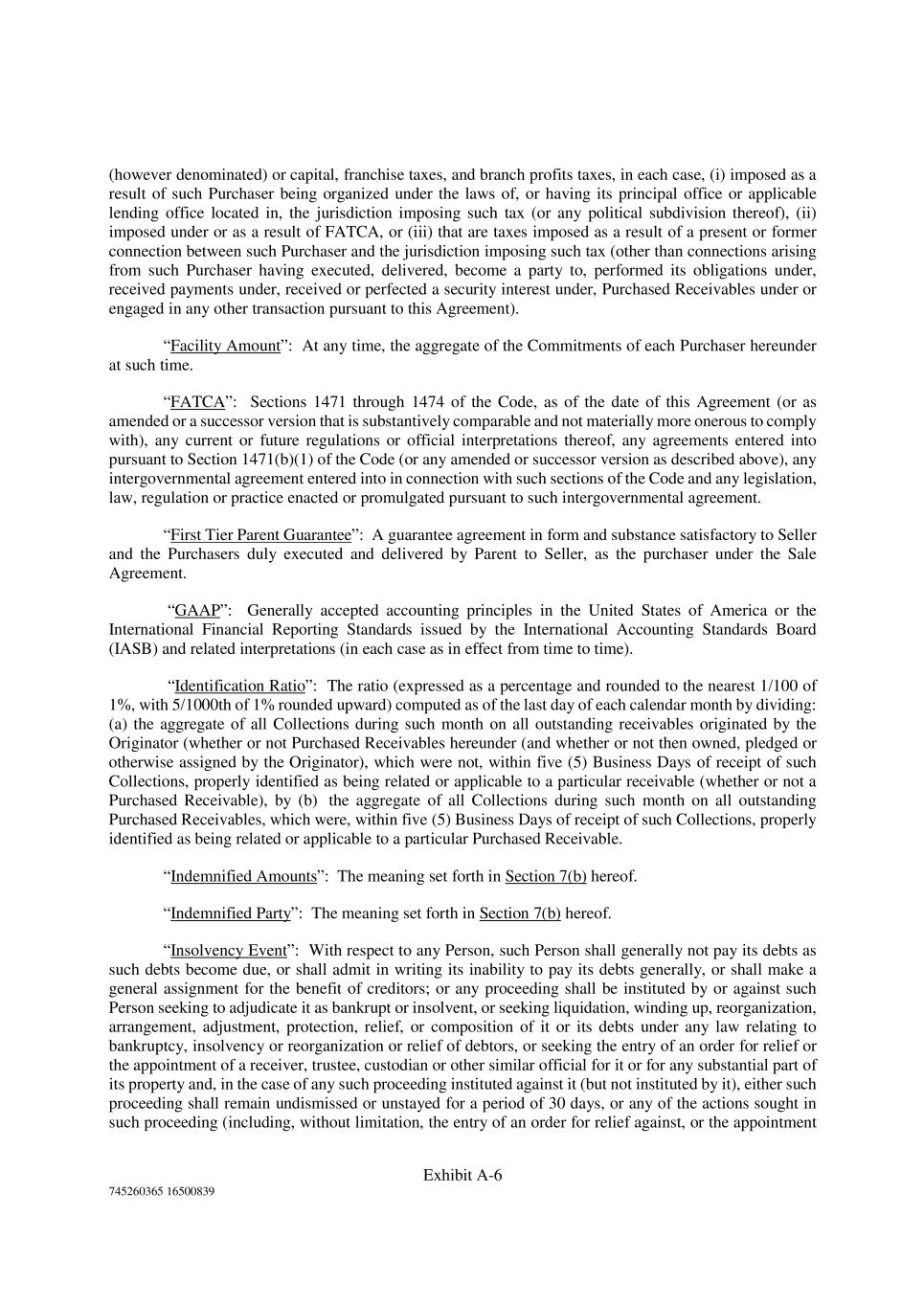 Exhibit A-6 745260365 16500839 (however denominated) or capital, franchise taxes, and branch profits taxes, in each case, (i) imposed as a result of such Purchaser being organized under the laws of, or having its principal office or applicable lending office located in, the jurisdiction imposing such tax (or any political subdivision thereof), (ii) imposed under or as a result of FATCA, or (iii) that are taxes imposed as a result of a present or former connection between such Purchaser and the jurisdiction imposing such tax (other than connections arising from such Purchaser having executed, delivered, become a party to, performed its obligations under, received payments under, received or perfected a security interest under, Purchased Receivables under or engaged in any other transaction pursuant to this Agreement). “Facility Amount”: At any time, the aggregate of the Commitments of each Purchaser hereunder at such time. “FATCA”: Sections 1471 through 1474 of the Code, as of the date of this Agreement (or as amended or a successor version that is substantively comparable and not materially more onerous to comply with), any current or future regulations or official interpretations thereof, any agreements entered into pursuant to Section 1471(b)(1) of the Code (or any amended or successor version as described above), any intergovernmental agreement entered into in connection with such sections of the Code and any legislation, law, regulation or practice enacted or promulgated pursuant to such intergovernmental agreement. “First Tier Parent Guarantee”: A guarantee agreement in form and substance satisfactory to Seller and the Purchasers duly executed and delivered by Parent to Seller, as the purchaser under the Sale Agreement. “GAAP”: Generally accepted accounting principles in the United States of America or the International Financial Reporting Standards issued by the International Accounting Standards Board (IASB) and related interpretations (in each case as in effect from time to time). “Identification Ratio”: The ratio (expressed as a percentage and rounded to the nearest 1/100 of 1%, with 5/1000th of 1% rounded upward) computed as of the last day of each calendar month by dividing: (a) the aggregate of all Collections during such month on all outstanding receivables originated by the Originator (whether or not Purchased Receivables hereunder (and whether or not then owned, pledged or otherwise assigned by the Originator), which were not, within five (5) Business Days of receipt of such Collections, properly identified as being related or applicable to a particular receivable (whether or not a Purchased Receivable), by (b) the aggregate of all Collections during such month on all outstanding Purchased Receivables, which were, within five (5) Business Days of receipt of such Collections, properly identified as being related or applicable to a particular Purchased Receivable. “Indemnified Amounts”: The meaning set forth in Section 7(b) hereof. “Indemnified Party”: The meaning set forth in Section 7(b) hereof. “Insolvency Event”: With respect to any Person, such Person shall generally not pay its debts as such debts become due, or shall admit in writing its inability to pay its debts generally, or shall make a general assignment for the benefit of creditors; or any proceeding shall be instituted by or against such Person seeking to adjudicate it as bankrupt or insolvent, or seeking liquidation, winding up, reorganization, arrangement, adjustment, protection, relief, or composition of it or its debts under any law relating to bankruptcy, insolvency or reorganization or relief of debtors, or seeking the entry of an order for relief or the appointment of a receiver, trustee, custodian or other similar official for it or for any substantial part of its property and, in the case of any such proceeding instituted against it (but not instituted by it), either such proceeding shall remain undismissed or unstayed for a period of 30 days, or any of the actions sought in such proceeding (including, without limitation, the entry of an order for relief against, or the appointment