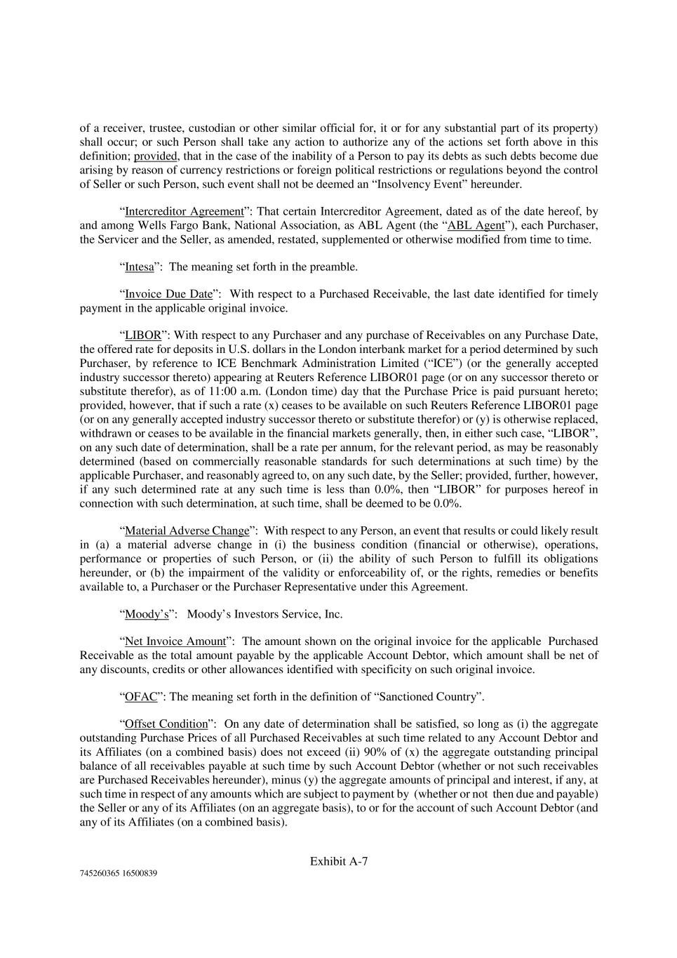 Exhibit A-7 745260365 16500839 of a receiver, trustee, custodian or other similar official for, it or for any substantial part of its property) shall occur; or such Person shall take any action to authorize any of the actions set forth above in this definition; provided, that in the case of the inability of a Person to pay its debts as such debts become due arising by reason of currency restrictions or foreign political restrictions or regulations beyond the control of Seller or such Person, such event shall not be deemed an “Insolvency Event” hereunder. “Intercreditor Agreement”: That certain Intercreditor Agreement, dated as of the date hereof, by and among Wells Fargo Bank, National Association, as ABL Agent (the “ABL Agent”), each Purchaser, the Servicer and the Seller, as amended, restated, supplemented or otherwise modified from time to time. “Intesa”: The meaning set forth in the preamble. “Invoice Due Date”: With respect to a Purchased Receivable, the last date identified for timely payment in the applicable original invoice. “LIBOR”: With respect to any Purchaser and any purchase of Receivables on any Purchase Date, the offered rate for deposits in U.S. dollars in the London interbank market for a period determined by such Purchaser, by reference to ICE Benchmark Administration Limited (“ICE”) (or the generally accepted industry successor thereto) appearing at Reuters Reference LIBOR01 page (or on any successor thereto or substitute therefor), as of 11:00 a.m. (London time) day that the Purchase Price is paid pursuant hereto; provided, however, that if such a rate (x) ceases to be available on such Reuters Reference LIBOR01 page (or on any generally accepted industry successor thereto or substitute therefor) or (y) is otherwise replaced, withdrawn or ceases to be available in the financial markets generally, then, in either such case, “LIBOR”, on any such date of determination, shall be a rate per annum, for the relevant period, as may be reasonably determined (based on commercially reasonable standards for such determinations at such time) by the applicable Purchaser, and reasonably agreed to, on any such date, by the Seller; provided, further, however, if any such determined rate at any such time is less than 0.0%, then “LIBOR” for purposes hereof in connection with such determination, at such time, shall be deemed to be 0.0%. “Material Adverse Change”: With respect to any Person, an event that results or could likely result in (a) a material adverse change in (i) the business condition (financial or otherwise), operations, performance or properties of such Person, or (ii) the ability of such Person to fulfill its obligations hereunder, or (b) the impairment of the validity or enforceability of, or the rights, remedies or benefits available to, a Purchaser or the Purchaser Representative under this Agreement. “Moody’s”: Moody’s Investors Service, Inc. “Net Invoice Amount”: The amount shown on the original invoice for the applicable Purchased Receivable as the total amount payable by the applicable Account Debtor, which amount shall be net of any discounts, credits or other allowances identified with specificity on such original invoice. “OFAC”: The meaning set forth in the definition of “Sanctioned Country”. “Offset Condition”: On any date of determination shall be satisfied, so long as (i) the aggregate outstanding Purchase Prices of all Purchased Receivables at such time related to any Account Debtor and its Affiliates (on a combined basis) does not exceed (ii) 90% of (x) the aggregate outstanding principal balance of all receivables payable at such time by such Account Debtor (whether or not such receivables are Purchased Receivables hereunder), minus (y) the aggregate amounts of principal and interest, if any, at such time in respect of any amounts which are subject to payment by (whether or not then due and payable) the Seller or any of its Affiliates (on an aggregate basis), to or for the account of such Account Debtor (and any of its Affiliates (on a combined basis).
