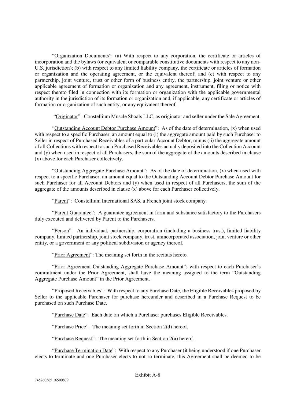 Exhibit A-8 745260365 16500839 “Organization Documents”: (a) With respect to any corporation, the certificate or articles of incorporation and the bylaws (or equivalent or comparable constitutive documents with respect to any non- U.S. jurisdiction); (b) with respect to any limited liability company, the certificate or articles of formation or organization and the operating agreement, or the equivalent thereof; and (c) with respect to any partnership, joint venture, trust or other form of business entity, the partnership, joint venture or other applicable agreement of formation or organization and any agreement, instrument, filing or notice with respect thereto filed in connection with its formation or organization with the applicable governmental authority in the jurisdiction of its formation or organization and, if applicable, any certificate or articles of formation or organization of such entity, or any equivalent thereof. “Originator”: Constellium Muscle Shoals LLC, as originator and seller under the Sale Agreement. “Outstanding Account Debtor Purchase Amount”: As of the date of determination, (x) when used with respect to a specific Purchaser, an amount equal to (i) the aggregate amount paid by such Purchaser to Seller in respect of Purchased Receivables of a particular Account Debtor, minus (ii) the aggregate amount of all Collections with respect to such Purchased Receivables actually deposited into the Collection Account and (y) when used in respect of all Purchasers, the sum of the aggregate of the amounts described in clause (x) above for each Purchaser collectively. “Outstanding Aggregate Purchase Amount”: As of the date of determination, (x) when used with respect to a specific Purchaser, an amount equal to the Outstanding Account Debtor Purchase Amount for such Purchaser for all Account Debtors and (y) when used in respect of all Purchasers, the sum of the aggregate of the amounts described in clause (x) above for each Purchaser collectively. “Parent”: Constellium International SAS, a French joint stock company. “Parent Guarantee”: A guarantee agreement in form and substance satisfactory to the Purchasers duly executed and delivered by Parent to the Purchasers. “Person”: An individual, partnership, corporation (including a business trust), limited liability company, limited partnership, joint stock company, trust, unincorporated association, joint venture or other entity, or a government or any political subdivision or agency thereof. “Prior Agreement”: The meaning set forth in the recitals hereto. “Prior Agreement Outstanding Aggregate Purchase Amount”: with respect to each Purchaser’s commitment under the Prior Agreement, shall have the meaning assigned to the term “Outstanding Aggregate Purchase Amount” in the Prior Agreement. “Proposed Receivables”: With respect to any Purchase Date, the Eligible Receivables proposed by Seller to the applicable Purchaser for purchase hereunder and described in a Purchase Request to be purchased on such Purchase Date. “Purchase Date”: Each date on which a Purchaser purchases Eligible Receivables. “Purchase Price”: The meaning set forth in Section 2(d) hereof. “Purchase Request”: The meaning set forth in Section 2(a) hereof. “Purchase Termination Date”: With respect to any Purchaser (it being understood if one Purchaser elects to terminate and one Purchaser elects to not so terminate, this Agreement shall be deemed to be
