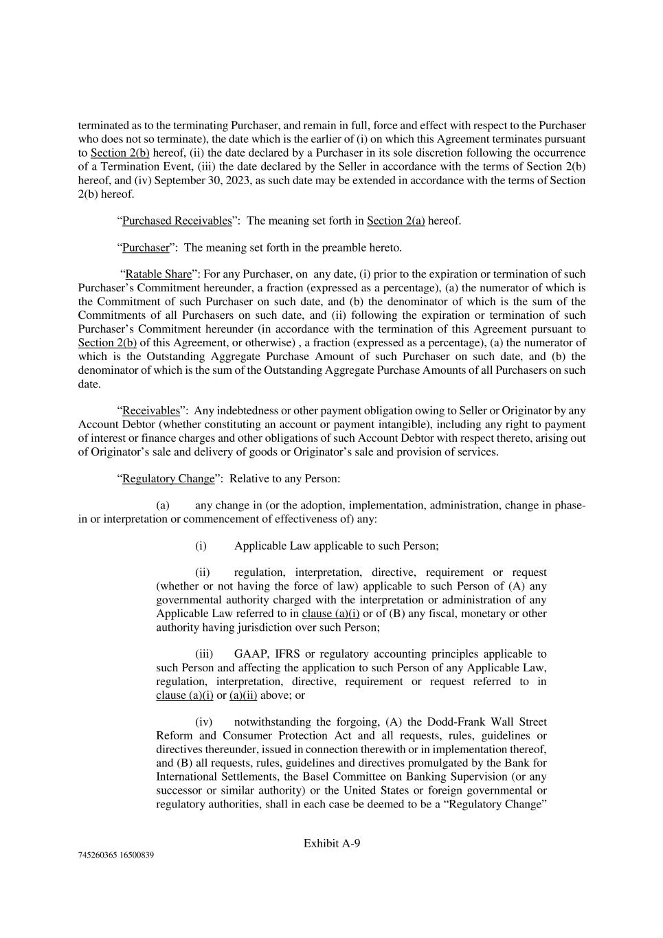 Exhibit A-9 745260365 16500839 terminated as to the terminating Purchaser, and remain in full, force and effect with respect to the Purchaser who does not so terminate), the date which is the earlier of (i) on which this Agreement terminates pursuant to Section 2(b) hereof, (ii) the date declared by a Purchaser in its sole discretion following the occurrence of a Termination Event, (iii) the date declared by the Seller in accordance with the terms of Section 2(b) hereof, and (iv) September 30, 2023, as such date may be extended in accordance with the terms of Section 2(b) hereof. “Purchased Receivables”: The meaning set forth in Section 2(a) hereof. “Purchaser”: The meaning set forth in the preamble hereto. “Ratable Share”: For any Purchaser, on any date, (i) prior to the expiration or termination of such Purchaser’s Commitment hereunder, a fraction (expressed as a percentage), (a) the numerator of which is the Commitment of such Purchaser on such date, and (b) the denominator of which is the sum of the Commitments of all Purchasers on such date, and (ii) following the expiration or termination of such Purchaser’s Commitment hereunder (in accordance with the termination of this Agreement pursuant to Section 2(b) of this Agreement, or otherwise) , a fraction (expressed as a percentage), (a) the numerator of which is the Outstanding Aggregate Purchase Amount of such Purchaser on such date, and (b) the denominator of which is the sum of the Outstanding Aggregate Purchase Amounts of all Purchasers on such date. “Receivables”: Any indebtedness or other payment obligation owing to Seller or Originator by any Account Debtor (whether constituting an account or payment intangible), including any right to payment of interest or finance charges and other obligations of such Account Debtor with respect thereto, arising out of Originator’s sale and delivery of goods or Originator’s sale and provision of services. “Regulatory Change”: Relative to any Person: (a) any change in (or the adoption, implementation, administration, change in phase- in or interpretation or commencement of effectiveness of) any: (i) Applicable Law applicable to such Person; (ii) regulation, interpretation, directive, requirement or request (whether or not having the force of law) applicable to such Person of (A) any governmental authority charged with the interpretation or administration of any Applicable Law referred to in clause (a)(i) or of (B) any fiscal, monetary or other authority having jurisdiction over such Person; (iii) GAAP, IFRS or regulatory accounting principles applicable to such Person and affecting the application to such Person of any Applicable Law, regulation, interpretation, directive, requirement or request referred to in clause (a)(i) or (a)(ii) above; or (iv) notwithstanding the forgoing, (A) the Dodd-Frank Wall Street Reform and Consumer Protection Act and all requests, rules, guidelines or directives thereunder, issued in connection therewith or in implementation thereof, and (B) all requests, rules, guidelines and directives promulgated by the Bank for International Settlements, the Basel Committee on Banking Supervision (or any successor or similar authority) or the United States or foreign governmental or regulatory authorities, shall in each case be deemed to be a “Regulatory Change”