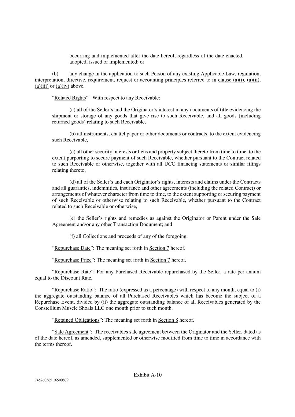 Exhibit A-10 745260365 16500839 occurring and implemented after the date hereof, regardless of the date enacted, adopted, issued or implemented; or (b) any change in the application to such Person of any existing Applicable Law, regulation, interpretation, directive, requirement, request or accounting principles referred to in clause (a)(i), (a)(ii), (a)(iii) or (a)(iv) above. “Related Rights”: With respect to any Receivable: (a) all of the Seller’s and the Originator’s interest in any documents of title evidencing the shipment or storage of any goods that give rise to such Receivable, and all goods (including returned goods) relating to such Receivable, (b) all instruments, chattel paper or other documents or contracts, to the extent evidencing such Receivable, (c) all other security interests or liens and property subject thereto from time to time, to the extent purporting to secure payment of such Receivable, whether pursuant to the Contract related to such Receivable or otherwise, together with all UCC financing statements or similar filings relating thereto, (d) all of the Seller’s and each Originator’s rights, interests and claims under the Contracts and all guaranties, indemnities, insurance and other agreements (including the related Contract) or arrangements of whatever character from time to time, to the extent supporting or securing payment of such Receivable or otherwise relating to such Receivable, whether pursuant to the Contract related to such Receivable or otherwise, (e) the Seller’s rights and remedies as against the Originator or Parent under the Sale Agreement and/or any other Transaction Document; and (f) all Collections and proceeds of any of the foregoing. “Repurchase Date”: The meaning set forth in Section 7 hereof. “Repurchase Price”: The meaning set forth in Section 7 hereof. “Repurchase Rate”: For any Purchased Receivable repurchased by the Seller, a rate per annum equal to the Discount Rate. “Repurchase Ratio”: The ratio (expressed as a percentage) with respect to any month, equal to (i) the aggregate outstanding balance of all Purchased Receivables which has become the subject of a Repurchase Event, divided by (ii) the aggregate outstanding balance of all Receivables generated by the Constellium Muscle Shoals LLC one month prior to such month. “Retained Obligations”: The meaning set forth in Section 8 hereof. “Sale Agreement”: The receivables sale agreement between the Originator and the Seller, dated as of the date hereof, as amended, supplemented or otherwise modified from time to time in accordance with the terms thereof.