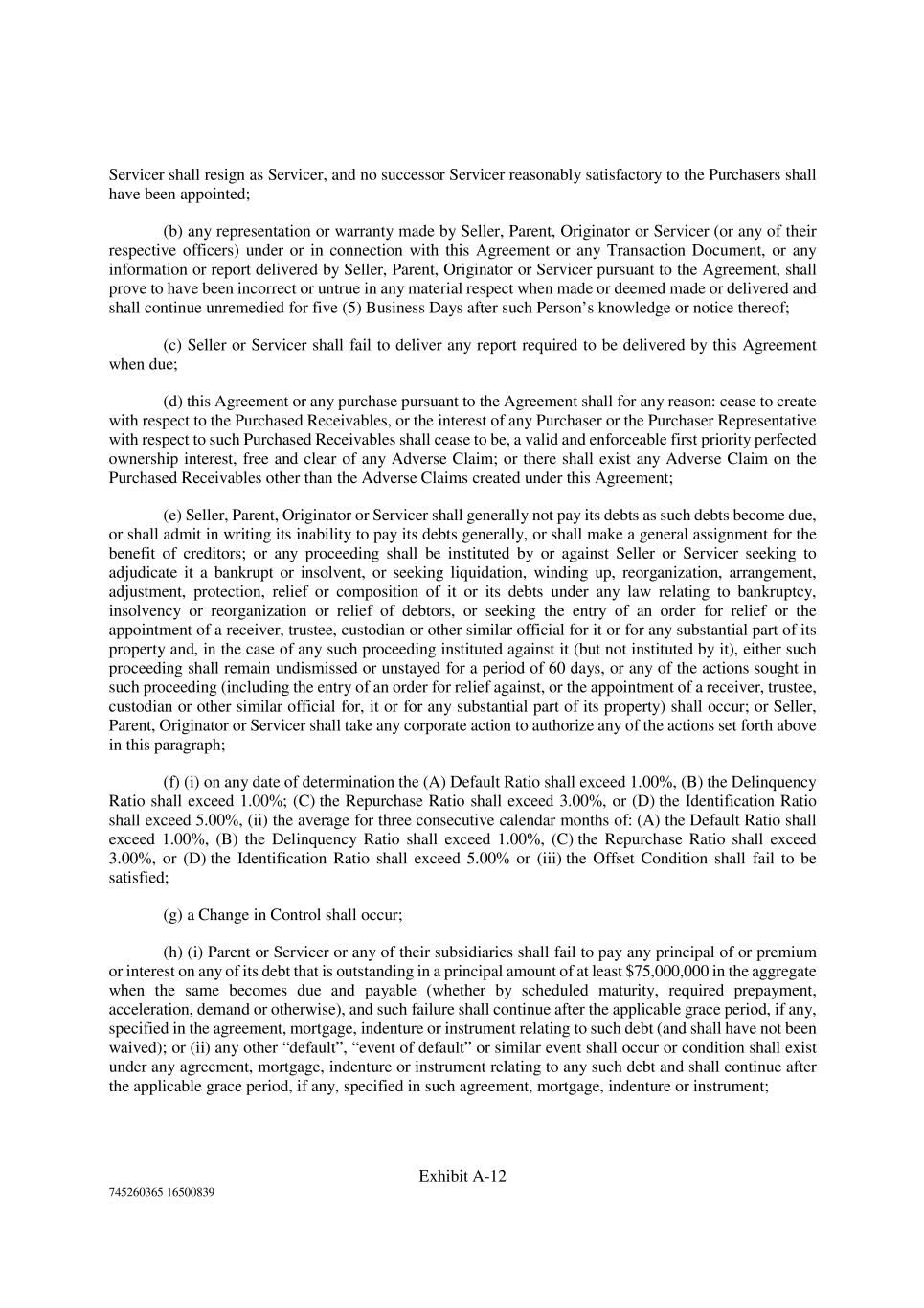 Exhibit A-12 745260365 16500839 Servicer shall resign as Servicer, and no successor Servicer reasonably satisfactory to the Purchasers shall have been appointed; (b) any representation or warranty made by Seller, Parent, Originator or Servicer (or any of their respective officers) under or in connection with this Agreement or any Transaction Document, or any information or report delivered by Seller, Parent, Originator or Servicer pursuant to the Agreement, shall prove to have been incorrect or untrue in any material respect when made or deemed made or delivered and shall continue unremedied for five (5) Business Days after such Person’s knowledge or notice thereof; (c) Seller or Servicer shall fail to deliver any report required to be delivered by this Agreement when due; (d) this Agreement or any purchase pursuant to the Agreement shall for any reason: cease to create with respect to the Purchased Receivables, or the interest of any Purchaser or the Purchaser Representative with respect to such Purchased Receivables shall cease to be, a valid and enforceable first priority perfected ownership interest, free and clear of any Adverse Claim; or there shall exist any Adverse Claim on the Purchased Receivables other than the Adverse Claims created under this Agreement; (e) Seller, Parent, Originator or Servicer shall generally not pay its debts as such debts become due, or shall admit in writing its inability to pay its debts generally, or shall make a general assignment for the benefit of creditors; or any proceeding shall be instituted by or against Seller or Servicer seeking to adjudicate it a bankrupt or insolvent, or seeking liquidation, winding up, reorganization, arrangement, adjustment, protection, relief or composition of it or its debts under any law relating to bankruptcy, insolvency or reorganization or relief of debtors, or seeking the entry of an order for relief or the appointment of a receiver, trustee, custodian or other similar official for it or for any substantial part of its property and, in the case of any such proceeding instituted against it (but not instituted by it), either such proceeding shall remain undismissed or unstayed for a period of 60 days, or any of the actions sought in such proceeding (including the entry of an order for relief against, or the appointment of a receiver, trustee, custodian or other similar official for, it or for any substantial part of its property) shall occur; or Seller, Parent, Originator or Servicer shall take any corporate action to authorize any of the actions set forth above in this paragraph; (f) (i) on any date of determination the (A) Default Ratio shall exceed 1.00%, (B) the Delinquency Ratio shall exceed 1.00%; (C) the Repurchase Ratio shall exceed 3.00%, or (D) the Identification Ratio shall exceed 5.00%, (ii) the average for three consecutive calendar months of: (A) the Default Ratio shall exceed 1.00%, (B) the Delinquency Ratio shall exceed 1.00%, (C) the Repurchase Ratio shall exceed 3.00%, or (D) the Identification Ratio shall exceed 5.00% or (iii) the Offset Condition shall fail to be satisfied; (g) a Change in Control shall occur; (h) (i) Parent or Servicer or any of their subsidiaries shall fail to pay any principal of or premium or interest on any of its debt that is outstanding in a principal amount of at least $75,000,000 in the aggregate when the same becomes due and payable (whether by scheduled maturity, required prepayment, acceleration, demand or otherwise), and such failure shall continue after the applicable grace period, if any, specified in the agreement, mortgage, indenture or instrument relating to such debt (and shall have not been waived); or (ii) any other “default”, “event of default” or similar event shall occur or condition shall exist under any agreement, mortgage, indenture or instrument relating to any such debt and shall continue after the applicable grace period, if any, specified in such agreement, mortgage, indenture or instrument;