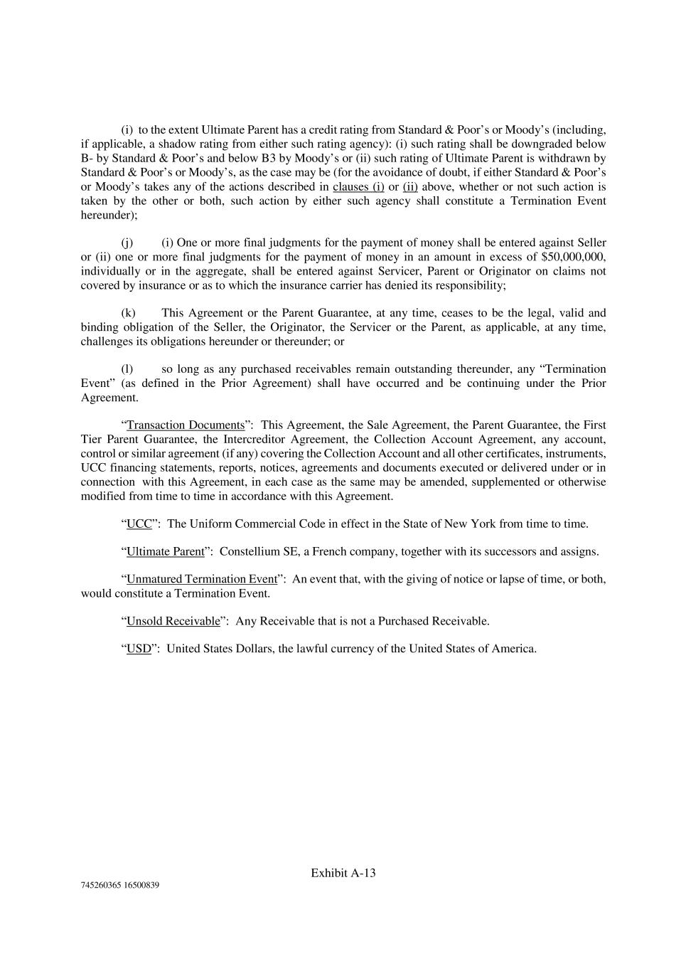 Exhibit A-13 745260365 16500839 (i) to the extent Ultimate Parent has a credit rating from Standard & Poor’s or Moody’s (including, if applicable, a shadow rating from either such rating agency): (i) such rating shall be downgraded below B- by Standard & Poor’s and below B3 by Moody’s or (ii) such rating of Ultimate Parent is withdrawn by Standard & Poor’s or Moody’s, as the case may be (for the avoidance of doubt, if either Standard & Poor’s or Moody’s takes any of the actions described in clauses (i) or (ii) above, whether or not such action is taken by the other or both, such action by either such agency shall constitute a Termination Event hereunder); (j) (i) One or more final judgments for the payment of money shall be entered against Seller or (ii) one or more final judgments for the payment of money in an amount in excess of $50,000,000, individually or in the aggregate, shall be entered against Servicer, Parent or Originator on claims not covered by insurance or as to which the insurance carrier has denied its responsibility; (k) This Agreement or the Parent Guarantee, at any time, ceases to be the legal, valid and binding obligation of the Seller, the Originator, the Servicer or the Parent, as applicable, at any time, challenges its obligations hereunder or thereunder; or (l) so long as any purchased receivables remain outstanding thereunder, any “Termination Event” (as defined in the Prior Agreement) shall have occurred and be continuing under the Prior Agreement. “Transaction Documents”: This Agreement, the Sale Agreement, the Parent Guarantee, the First Tier Parent Guarantee, the Intercreditor Agreement, the Collection Account Agreement, any account, control or similar agreement (if any) covering the Collection Account and all other certificates, instruments, UCC financing statements, reports, notices, agreements and documents executed or delivered under or in connection with this Agreement, in each case as the same may be amended, supplemented or otherwise modified from time to time in accordance with this Agreement. “UCC”: The Uniform Commercial Code in effect in the State of New York from time to time. “Ultimate Parent”: Constellium SE, a French company, together with its successors and assigns. “Unmatured Termination Event”: An event that, with the giving of notice or lapse of time, or both, would constitute a Termination Event. “Unsold Receivable”: Any Receivable that is not a Purchased Receivable. “USD”: United States Dollars, the lawful currency of the United States of America.