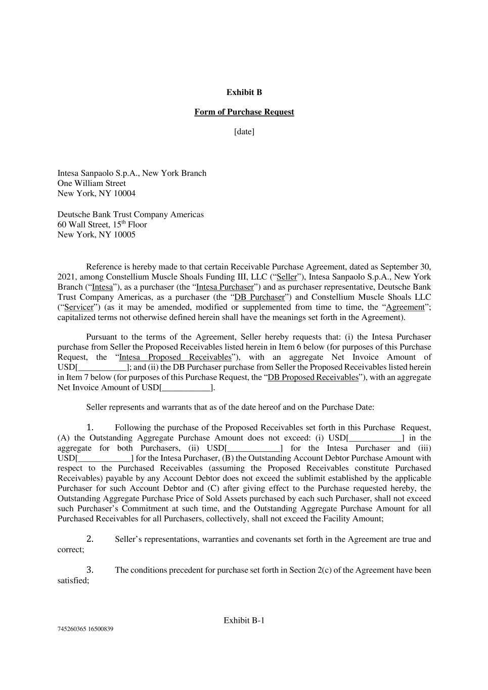 Exhibit B-1 745260365 16500839 Exhibit B Form of Purchase Request [date] Intesa Sanpaolo S.p.A., New York Branch One William Street New York, NY 10004 Deutsche Bank Trust Company Americas 60 Wall Street, 15th Floor New York, NY 10005 Reference is hereby made to that certain Receivable Purchase Agreement, dated as September 30, 2021, among Constellium Muscle Shoals Funding III, LLC (“Seller”), Intesa Sanpaolo S.p.A., New York Branch (“Intesa”), as a purchaser (the “Intesa Purchaser”) and as purchaser representative, Deutsche Bank Trust Company Americas, as a purchaser (the “DB Purchaser”) and Constellium Muscle Shoals LLC (“Servicer”) (as it may be amended, modified or supplemented from time to time, the “Agreement”; capitalized terms not otherwise defined herein shall have the meanings set forth in the Agreement). Pursuant to the terms of the Agreement, Seller hereby requests that: (i) the Intesa Purchaser purchase from Seller the Proposed Receivables listed herein in Item 6 below (for purposes of this Purchase Request, the “Intesa Proposed Receivables”), with an aggregate Net Invoice Amount of USD[___________]; and (ii) the DB Purchaser purchase from Seller the Proposed Receivables listed herein in Item 7 below (for purposes of this Purchase Request, the “DB Proposed Receivables”), with an aggregate Net Invoice Amount of USD[___________]. Seller represents and warrants that as of the date hereof and on the Purchase Date: 1. Following the purchase of the Proposed Receivables set forth in this Purchase Request, (A) the Outstanding Aggregate Purchase Amount does not exceed: (i) USD[____________] in the aggregate for both Purchasers, (ii) USD[____________] for the Intesa Purchaser and (iii) USD[____________] for the Intesa Purchaser, (B) the Outstanding Account Debtor Purchase Amount with respect to the Purchased Receivables (assuming the Proposed Receivables constitute Purchased Receivables) payable by any Account Debtor does not exceed the sublimit established by the applicable Purchaser for such Account Debtor and (C) after giving effect to the Purchase requested hereby, the Outstanding Aggregate Purchase Price of Sold Assets purchased by each such Purchaser, shall not exceed such Purchaser’s Commitment at such time, and the Outstanding Aggregate Purchase Amount for all Purchased Receivables for all Purchasers, collectively, shall not exceed the Facility Amount; 2. Seller’s representations, warranties and covenants set forth in the Agreement are true and correct; 3. The conditions precedent for purchase set forth in Section 2(c) of the Agreement have been satisfied;