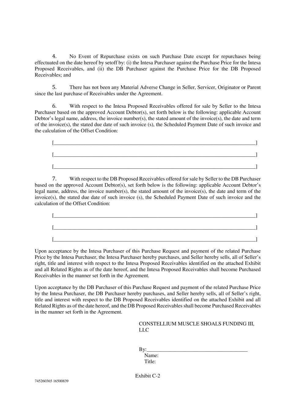 Exhibit C-2 745260365 16500839 4. No Event of Repurchase exists on such Purchase Date except for repurchases being effectuated on the date hereof by setoff by: (i) the Intesa Purchaser against the Purchase Price for the Intesa Proposed Receivables, and (ii) the DB Purchaser against the Purchase Price for the DB Proposed Receivables; and 5. There has not been any Material Adverse Change in Seller, Servicer, Originator or Parent since the last purchase of Receivables under the Agreement. 6. With respect to the Intesa Proposed Receivables offered for sale by Seller to the Intesa Purchaser based on the approved Account Debtor(s), set forth below is the following: applicable Account Debtor’s legal name, address, the invoice number(s), the stated amount of the invoice(s), the date and term of the invoice(s), the stated due date of such invoice (s), the Scheduled Payment Date of such invoice and the calculation of the Offset Condition: [____________________________________________________________________________] [____________________________________________________________________________] [____________________________________________________________________________] 7. With respect to the DB Proposed Receivables offered for sale by Seller to the DB Purchaser based on the approved Account Debtor(s), set forth below is the following: applicable Account Debtor’s legal name, address, the invoice number(s), the stated amount of the invoice(s), the date and term of the invoice(s), the stated due date of such invoice (s), the Scheduled Payment Date of such invoice and the calculation of the Offset Condition: [____________________________________________________________________________] [____________________________________________________________________________] [____________________________________________________________________________] Upon acceptance by the Intesa Purchaser of this Purchase Request and payment of the related Purchase Price by the Intesa Purchaser, the Intesa Purchaser hereby purchases, and Seller hereby sells, all of Seller’s right, title and interest with respect to the Intesa Proposed Receivables identified on the attached Exhibit and all Related Rights as of the date hereof, and the Intesa Proposed Receivables shall become Purchased Receivables in the manner set forth in the Agreement. Upon acceptance by the DB Purchaser of this Purchase Request and payment of the related Purchase Price by the Intesa Purchaser, the DB Purchaser hereby purchases, and Seller hereby sells, all of Seller’s right, title and interest with respect to the DB Proposed Receivables identified on the attached Exhibit and all Related Rights as of the date hereof, and the DB Proposed Receivables shall become Purchased Receivables in the manner set forth in the Agreement. CONSTELLIUM MUSCLE SHOALS FUNDING III, LLC By:______________________________________ Name: Title: