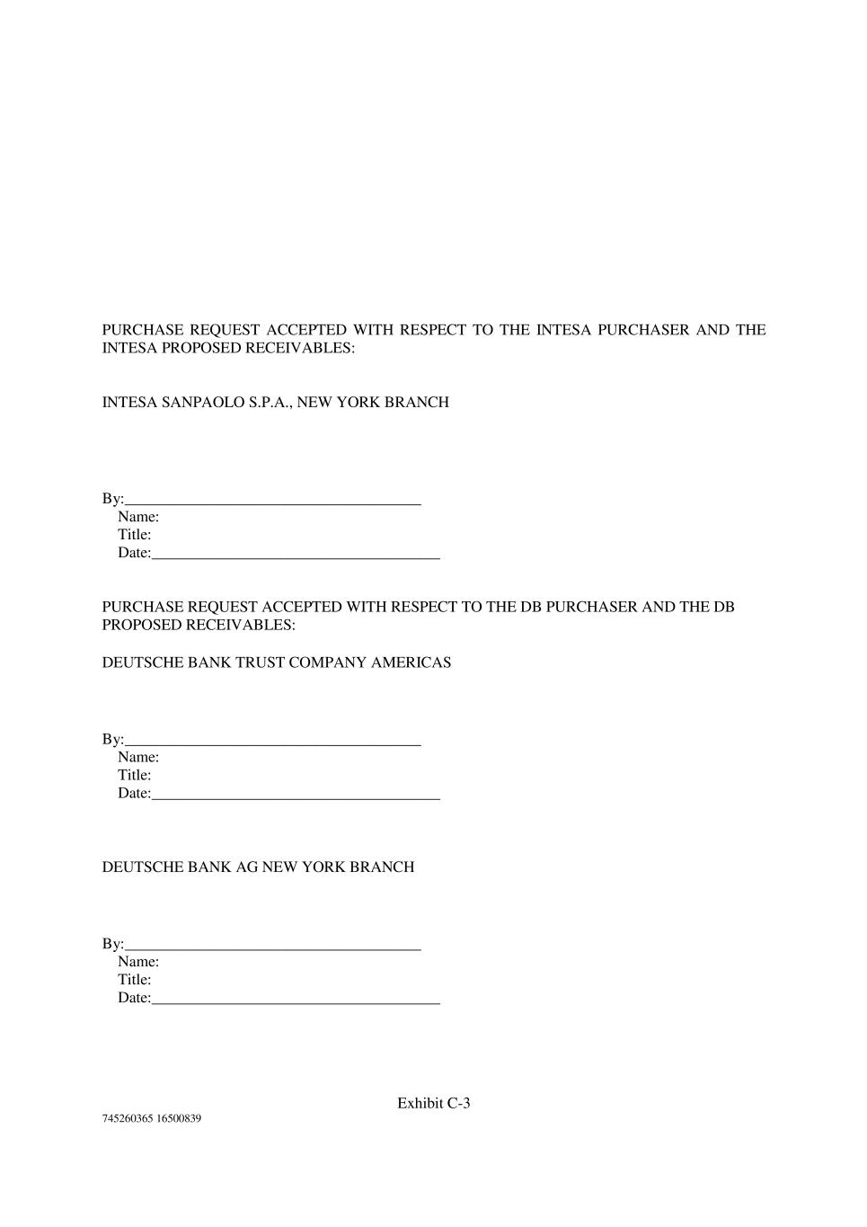 Exhibit C-3 745260365 16500839 PURCHASE REQUEST ACCEPTED WITH RESPECT TO THE INTESA PURCHASER AND THE INTESA PROPOSED RECEIVABLES: INTESA SANPAOLO S.P.A., NEW YORK BRANCH By:______________________________________ Name: Title: Date:_____________________________________ PURCHASE REQUEST ACCEPTED WITH RESPECT TO THE DB PURCHASER AND THE DB PROPOSED RECEIVABLES: DEUTSCHE BANK TRUST COMPANY AMERICAS By:______________________________________ Name: Title: Date:_____________________________________ DEUTSCHE BANK AG NEW YORK BRANCH By:______________________________________ Name: Title: Date:_____________________________________