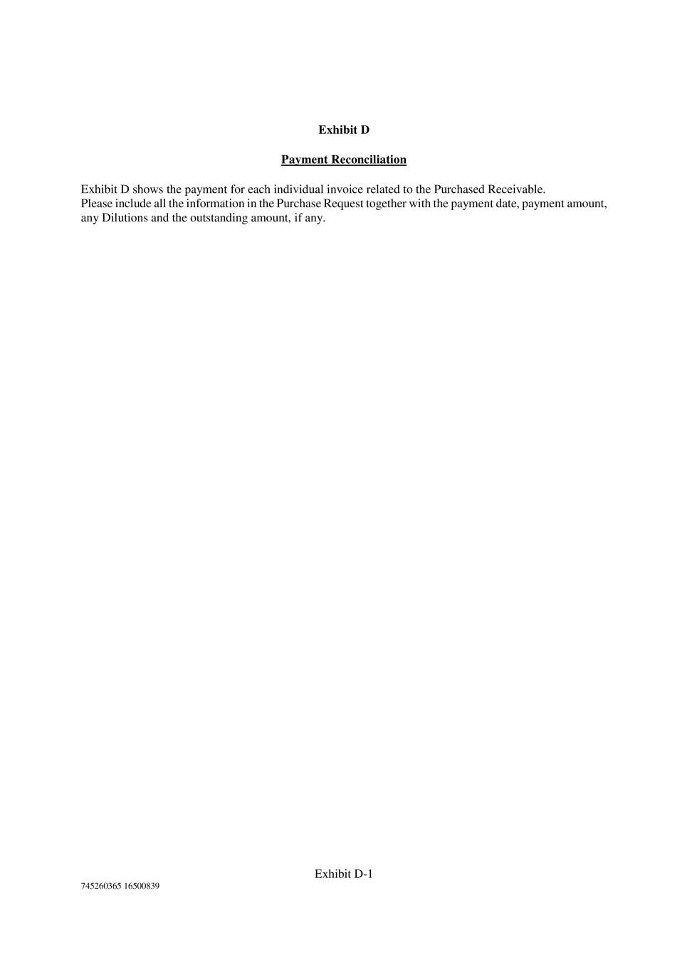 Exhibit D-1 745260365 16500839 Exhibit D Payment Reconciliation Exhibit D shows the payment for each individual invoice related to the Purchased Receivable. Please include all the information in the Purchase Request together with the payment date, payment amount, any Dilutions and the outstanding amount, if any.