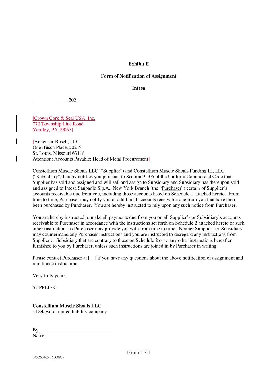 Exhibit E-1 745260365 16500839 Exhibit E Form of Notification of Assignment Intesa ___________ __, 202_ [Crown Cork & Seal USA, Inc. 770 Township Line Road Yardley, PA 19067] [Anheuser-Busch, LLC. One Busch Place, 202-5 St. Louis, Missouri 63118 Attention: Accounts Payable; Head of Metal Procurement] Constellium Muscle Shoals LLC (“Supplier”) and Constellium Muscle Shoals Funding III, LLC (“Subsidiary”) hereby notifies you pursuant to Section 9-406 of the Uniform Commercial Code that Supplier has sold and assigned and will sell and assign to Subsidiary and Subsidiary has thereupon sold and assigned to Intesa Sanpaolo S.p.A., New York Branch (the “Purchaser”) certain of Supplier’s accounts receivable due from you, including those accounts listed on Schedule 1 attached hereto. From time to time, Purchaser may notify you of additional accounts receivable due from you that have then been purchased by Purchaser. You are hereby instructed to rely upon any such notice from Purchaser. You are hereby instructed to make all payments due from you on all Supplier’s or Subsidiary’s accounts receivable to Purchaser in accordance with the instructions set forth on Schedule 2 attached hereto or such other instructions as Purchaser may provide you with from time to time. Neither Supplier nor Subsidiary may countermand any Purchaser instructions and you are instructed to disregard any instructions from Supplier or Subsidiary that are contrary to those on Schedule 2 or to any other instructions hereafter furnished to you by Purchaser, unless such instructions are joined in by Purchaser in writing. Please contact Purchaser at [__] if you have any questions about the above notification of assignment and remittance instructions. Very truly yours, SUPPLIER: Constellium Muscle Shoals LLC, a Delaware limited liability company By: Name:
