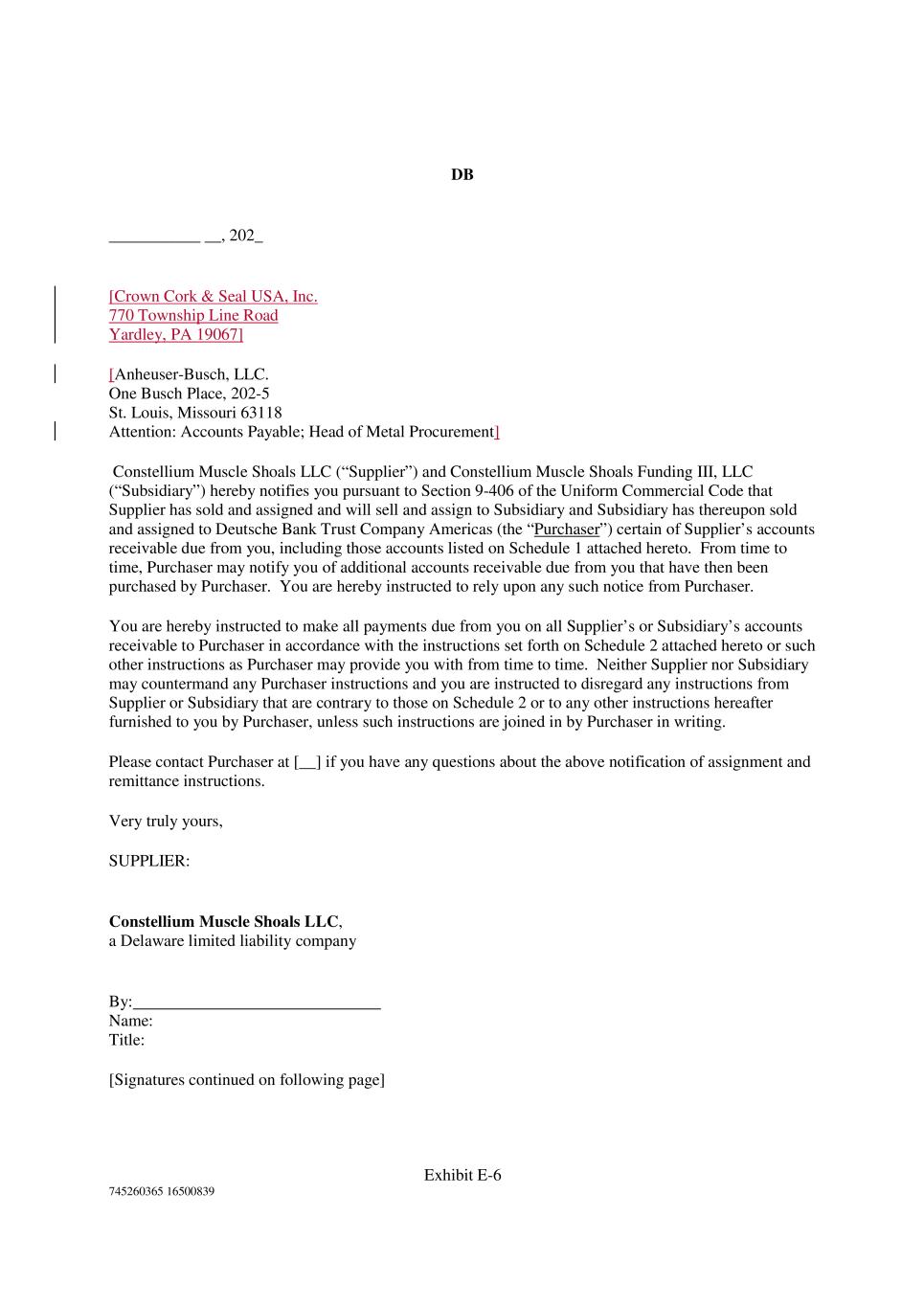 Exhibit E-6 745260365 16500839 DB ___________ __, 202_ [Crown Cork & Seal USA, Inc. 770 Township Line Road Yardley, PA 19067] [Anheuser-Busch, LLC. One Busch Place, 202-5 St. Louis, Missouri 63118 Attention: Accounts Payable; Head of Metal Procurement] Constellium Muscle Shoals LLC (“Supplier”) and Constellium Muscle Shoals Funding III, LLC (“Subsidiary”) hereby notifies you pursuant to Section 9-406 of the Uniform Commercial Code that Supplier has sold and assigned and will sell and assign to Subsidiary and Subsidiary has thereupon sold and assigned to Deutsche Bank Trust Company Americas (the “Purchaser”) certain of Supplier’s accounts receivable due from you, including those accounts listed on Schedule 1 attached hereto. From time to time, Purchaser may notify you of additional accounts receivable due from you that have then been purchased by Purchaser. You are hereby instructed to rely upon any such notice from Purchaser. You are hereby instructed to make all payments due from you on all Supplier’s or Subsidiary’s accounts receivable to Purchaser in accordance with the instructions set forth on Schedule 2 attached hereto or such other instructions as Purchaser may provide you with from time to time. Neither Supplier nor Subsidiary may countermand any Purchaser instructions and you are instructed to disregard any instructions from Supplier or Subsidiary that are contrary to those on Schedule 2 or to any other instructions hereafter furnished to you by Purchaser, unless such instructions are joined in by Purchaser in writing. Please contact Purchaser at [__] if you have any questions about the above notification of assignment and remittance instructions. Very truly yours, SUPPLIER: Constellium Muscle Shoals LLC, a Delaware limited liability company By: Name: Title: [Signatures continued on following page]