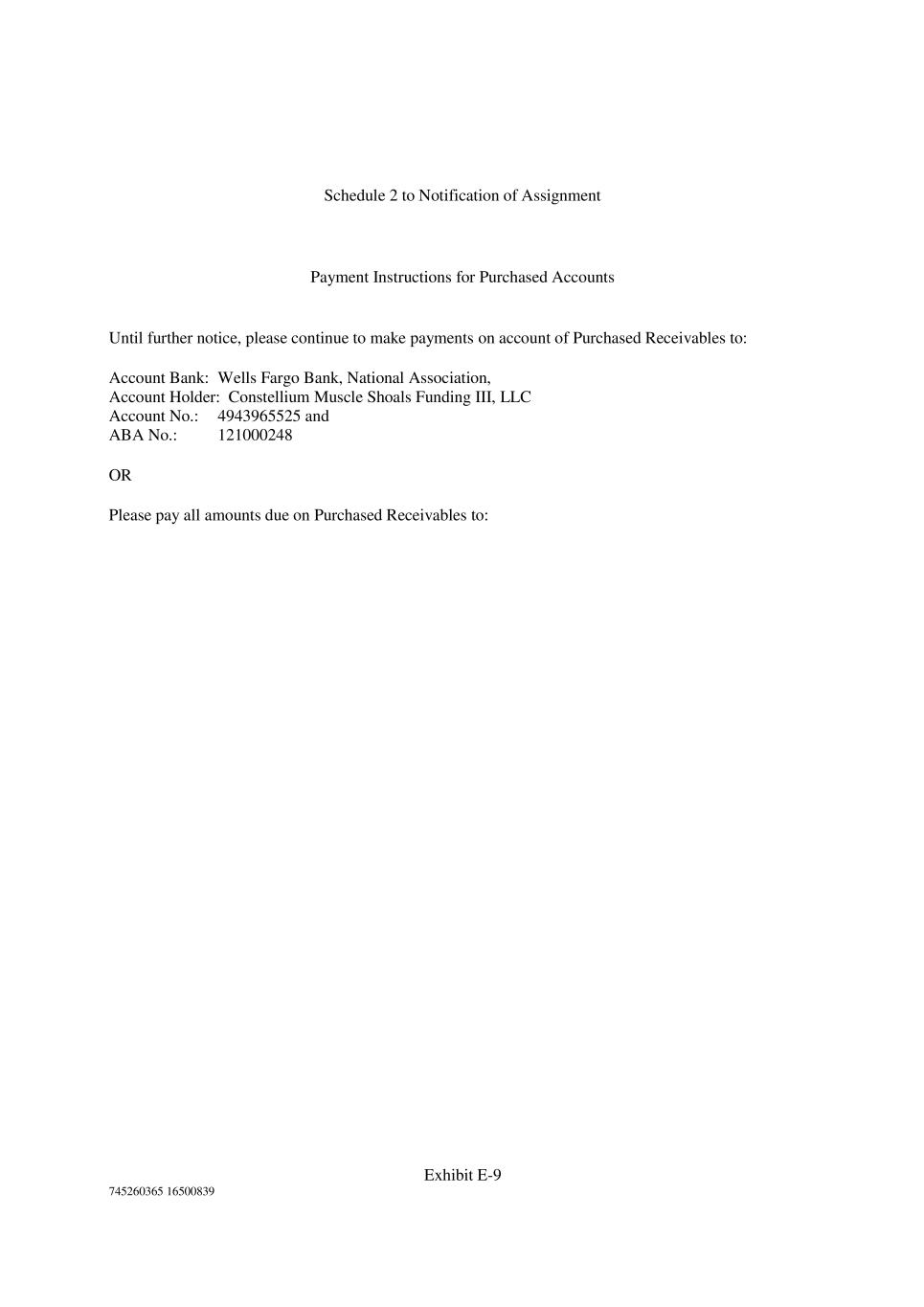 Exhibit E-9 745260365 16500839 Schedule 2 to Notification of Assignment Payment Instructions for Purchased Accounts Until further notice, please continue to make payments on account of Purchased Receivables to: Account Bank: Wells Fargo Bank, National Association, Account Holder: Constellium Muscle Shoals Funding III, LLC Account No.: 4943965525 and ABA No.: 121000248 OR Please pay all amounts due on Purchased Receivables to:
