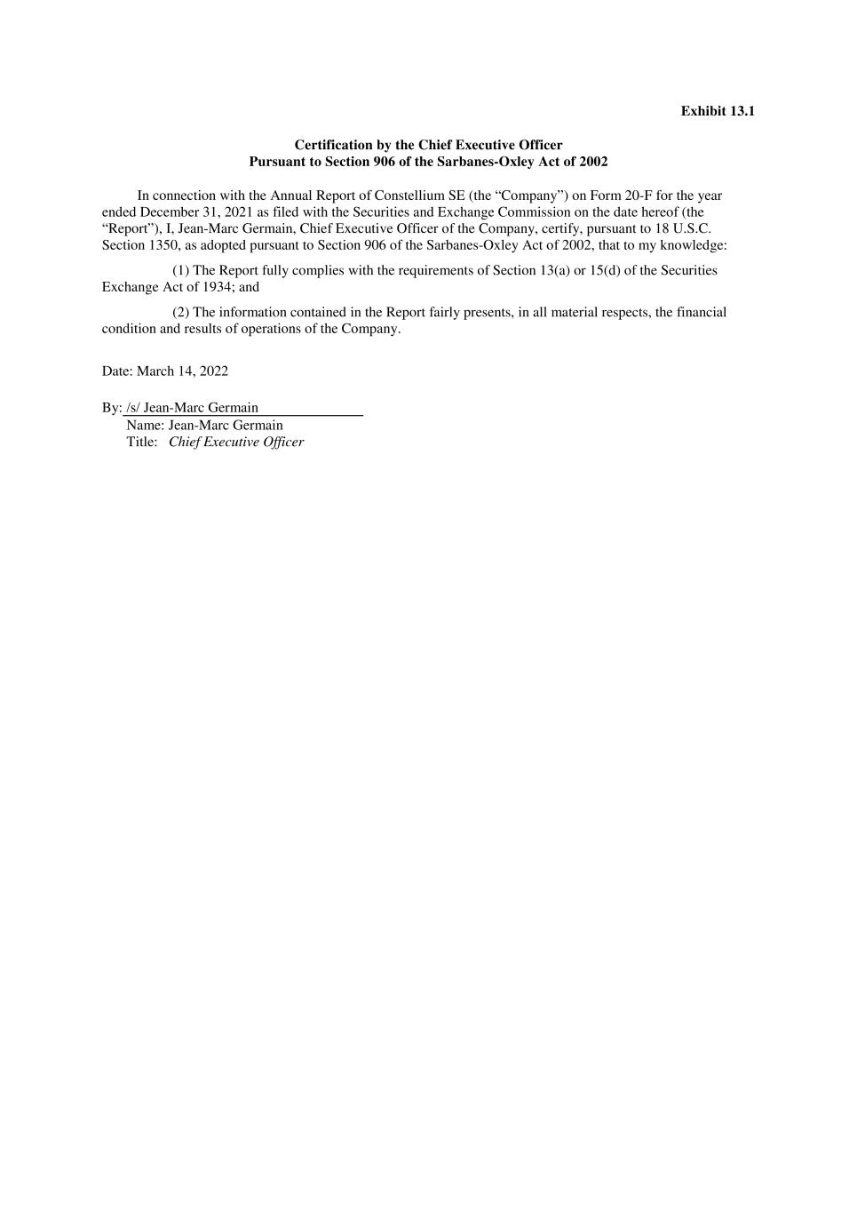 Exhibit 13.1 Certification by the Chief Executive Officer Pursuant to Section 906 of the Sarbanes-Oxley Act of 2002 In connection with the Annual Report of Constellium SE (the “Company”) on Form 20-F for the year ended December 31, 2021 as filed with the Securities and Exchange Commission on the date hereof (the “Report”), I, Jean-Marc Germain, Chief Executive Officer of the Company, certify, pursuant to 18 U.S.C. Section 1350, as adopted pursuant to Section 906 of the Sarbanes-Oxley Act of 2002, that to my knowledge: (1) The Report fully complies with the requirements of Section 13(a) or 15(d) of the Securities Exchange Act of 1934; and (2) The information contained in the Report fairly presents, in all material respects, the financial condition and results of operations of the Company. Date: March 14, 2022 By: /s/ Jean-Marc Germain Name: Jean-Marc Germain Title: Chief Executive Officer