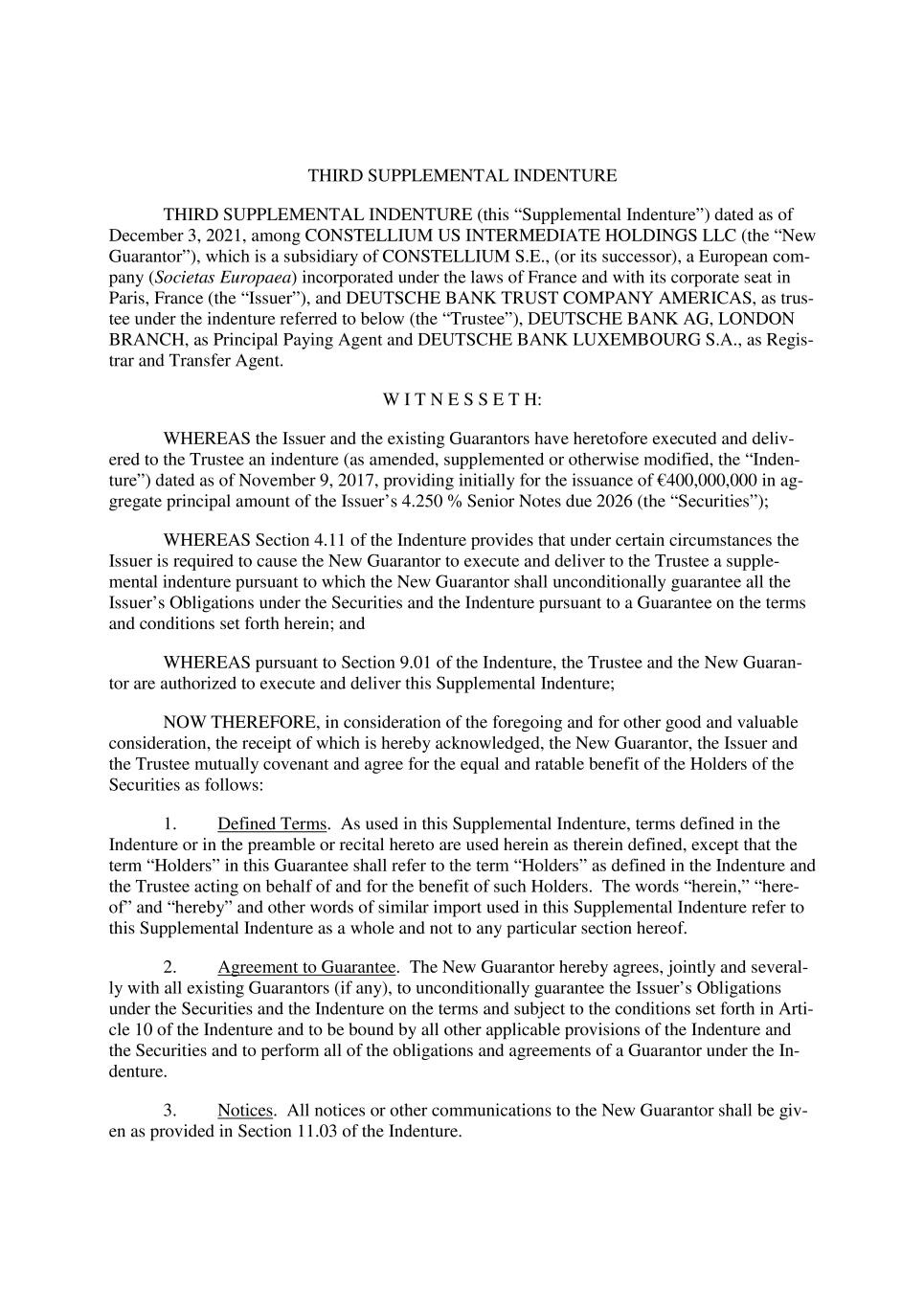 THIRD SUPPLEMENTAL INDENTURE THIRD SUPPLEMENTAL INDENTURE (this “Supplemental Indenture”) dated as of December 3, 2021, among CONSTELLIUM US INTERMEDIATE HOLDINGS LLC (the “New Guarantor”), which is a subsidiary of CONSTELLIUM S.E., (or its successor), a European com- pany (Societas Europaea) incorporated under the laws of France and with its corporate seat in Paris, France (the “Issuer”), and DEUTSCHE BANK TRUST COMPANY AMERICAS, as trus- tee under the indenture referred to below (the “Trustee”), DEUTSCHE BANK AG, LONDON BRANCH, as Principal Paying Agent and DEUTSCHE BANK LUXEMBOURG S.A., as Regis- trar and Transfer Agent. W I T N E S S E T H: WHEREAS the Issuer and the existing Guarantors have heretofore executed and deliv- ered to the Trustee an indenture (as amended, supplemented or otherwise modified, the “Inden- ture”) dated as of November 9, 2017, providing initially for the issuance of €400,000,000 in ag- gregate principal amount of the Issuer’s 4.250 % Senior Notes due 2026 (the “Securities”); WHEREAS Section 4.11 of the Indenture provides that under certain circumstances the Issuer is required to cause the New Guarantor to execute and deliver to the Trustee a supple- mental indenture pursuant to which the New Guarantor shall unconditionally guarantee all the Issuer’s Obligations under the Securities and the Indenture pursuant to a Guarantee on the terms and conditions set forth herein; and WHEREAS pursuant to Section 9.01 of the Indenture, the Trustee and the New Guaran- tor are authorized to execute and deliver this Supplemental Indenture; NOW THEREFORE, in consideration of the foregoing and for other good and valuable consideration, the receipt of which is hereby acknowledged, the New Guarantor, the Issuer and the Trustee mutually covenant and agree for the equal and ratable benefit of the Holders of the Securities as follows: 1. Defined Terms. As used in this Supplemental Indenture, terms defined in the Indenture or in the preamble or recital hereto are used herein as therein defined, except that the term “Holders” in this Guarantee shall refer to the term “Holders” as defined in the Indenture and the Trustee acting on behalf of and for the benefit of such Holders. The words “herein,” “here- of” and “hereby” and other words of similar import used in this Supplemental Indenture refer to this Supplemental Indenture as a whole and not to any particular section hereof. 2. Agreement to Guarantee. The New Guarantor hereby agrees, jointly and several- ly with all existing Guarantors (if any), to unconditionally guarantee the Issuer’s Obligations under the Securities and the Indenture on the terms and subject to the conditions set forth in Arti- cle 10 of the Indenture and to be bound by all other applicable provisions of the Indenture and the Securities and to perform all of the obligations and agreements of a Guarantor under the In- denture. 3. Notices. All notices or other communications to the New Guarantor shall be giv- en as provided in Section 11.03 of the Indenture.