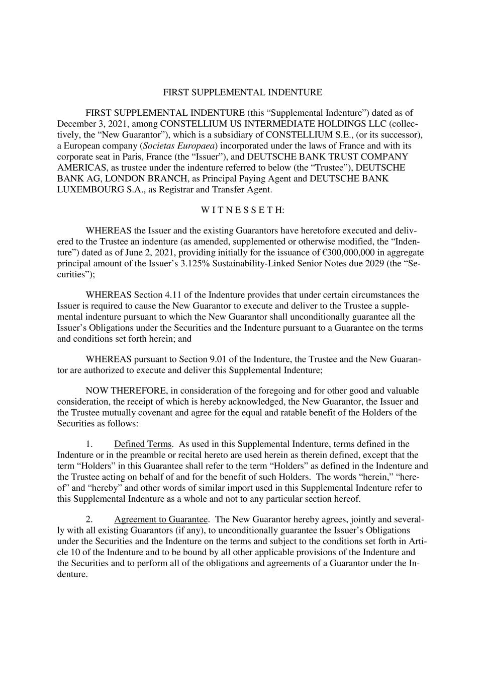 FIRST SUPPLEMENTAL INDENTURE FIRST SUPPLEMENTAL INDENTURE (this “Supplemental Indenture”) dated as of December 3, 2021, among CONSTELLIUM US INTERMEDIATE HOLDINGS LLC (collec- tively, the “New Guarantor”), which is a subsidiary of CONSTELLIUM S.E., (or its successor), a European company (Societas Europaea) incorporated under the laws of France and with its corporate seat in Paris, France (the “Issuer”), and DEUTSCHE BANK TRUST COMPANY AMERICAS, as trustee under the indenture referred to below (the “Trustee”), DEUTSCHE BANK AG, LONDON BRANCH, as Principal Paying Agent and DEUTSCHE BANK LUXEMBOURG S.A., as Registrar and Transfer Agent. W I T N E S S E T H: WHEREAS the Issuer and the existing Guarantors have heretofore executed and deliv- ered to the Trustee an indenture (as amended, supplemented or otherwise modified, the “Inden- ture”) dated as of June 2, 2021, providing initially for the issuance of €300,000,000 in aggregate principal amount of the Issuer’s 3.125% Sustainability-Linked Senior Notes due 2029 (the “Se- curities”); WHEREAS Section 4.11 of the Indenture provides that under certain circumstances the Issuer is required to cause the New Guarantor to execute and deliver to the Trustee a supple- mental indenture pursuant to which the New Guarantor shall unconditionally guarantee all the Issuer’s Obligations under the Securities and the Indenture pursuant to a Guarantee on the terms and conditions set forth herein; and WHEREAS pursuant to Section 9.01 of the Indenture, the Trustee and the New Guaran- tor are authorized to execute and deliver this Supplemental Indenture; NOW THEREFORE, in consideration of the foregoing and for other good and valuable consideration, the receipt of which is hereby acknowledged, the New Guarantor, the Issuer and the Trustee mutually covenant and agree for the equal and ratable benefit of the Holders of the Securities as follows: 1. Defined Terms. As used in this Supplemental Indenture, terms defined in the Indenture or in the preamble or recital hereto are used herein as therein defined, except that the term “Holders” in this Guarantee shall refer to the term “Holders” as defined in the Indenture and the Trustee acting on behalf of and for the benefit of such Holders. The words “herein,” “here- of” and “hereby” and other words of similar import used in this Supplemental Indenture refer to this Supplemental Indenture as a whole and not to any particular section hereof. 2. Agreement to Guarantee. The New Guarantor hereby agrees, jointly and several- ly with all existing Guarantors (if any), to unconditionally guarantee the Issuer’s Obligations under the Securities and the Indenture on the terms and subject to the conditions set forth in Arti- cle 10 of the Indenture and to be bound by all other applicable provisions of the Indenture and the Securities and to perform all of the obligations and agreements of a Guarantor under the In- denture.