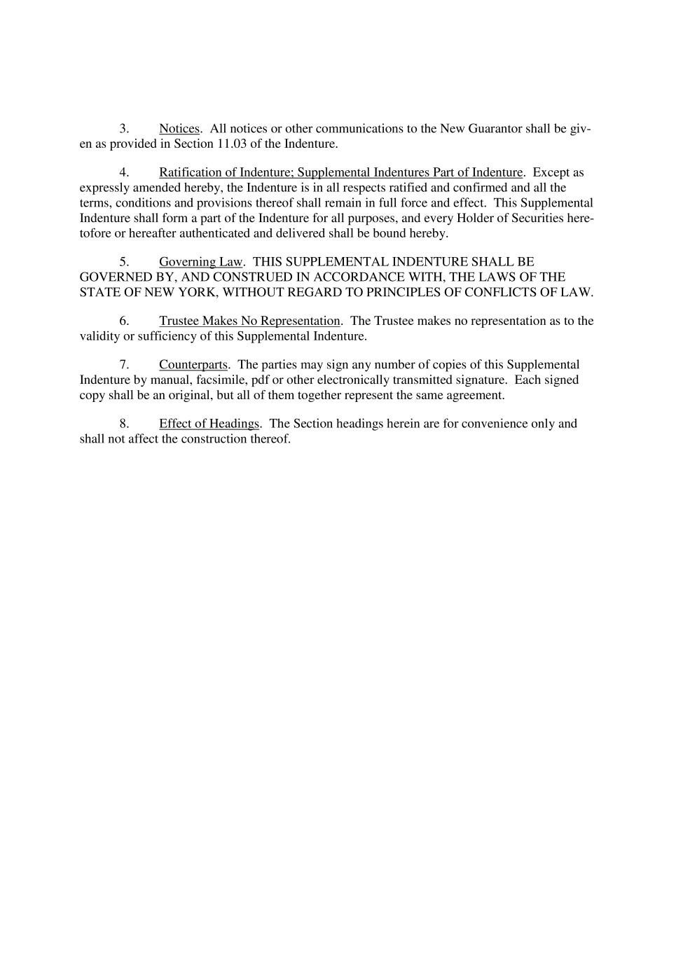 3. Notices. All notices or other communications to the New Guarantor shall be giv- en as provided in Section 11.03 of the Indenture. 4. Ratification of Indenture; Supplemental Indentures Part of Indenture. Except as expressly amended hereby, the Indenture is in all respects ratified and confirmed and all the terms, conditions and provisions thereof shall remain in full force and effect. This Supplemental Indenture shall form a part of the Indenture for all purposes, and every Holder of Securities here- tofore or hereafter authenticated and delivered shall be bound hereby. 5. Governing Law. THIS SUPPLEMENTAL INDENTURE SHALL BE GOVERNED BY, AND CONSTRUED IN ACCORDANCE WITH, THE LAWS OF THE STATE OF NEW YORK, WITHOUT REGARD TO PRINCIPLES OF CONFLICTS OF LAW. 6. Trustee Makes No Representation. The Trustee makes no representation as to the validity or sufficiency of this Supplemental Indenture. 7. Counterparts. The parties may sign any number of copies of this Supplemental Indenture by manual, facsimile, pdf or other electronically transmitted signature. Each signed copy shall be an original, but all of them together represent the same agreement. 8. Effect of Headings. The Section headings herein are for convenience only and shall not affect the construction thereof.
