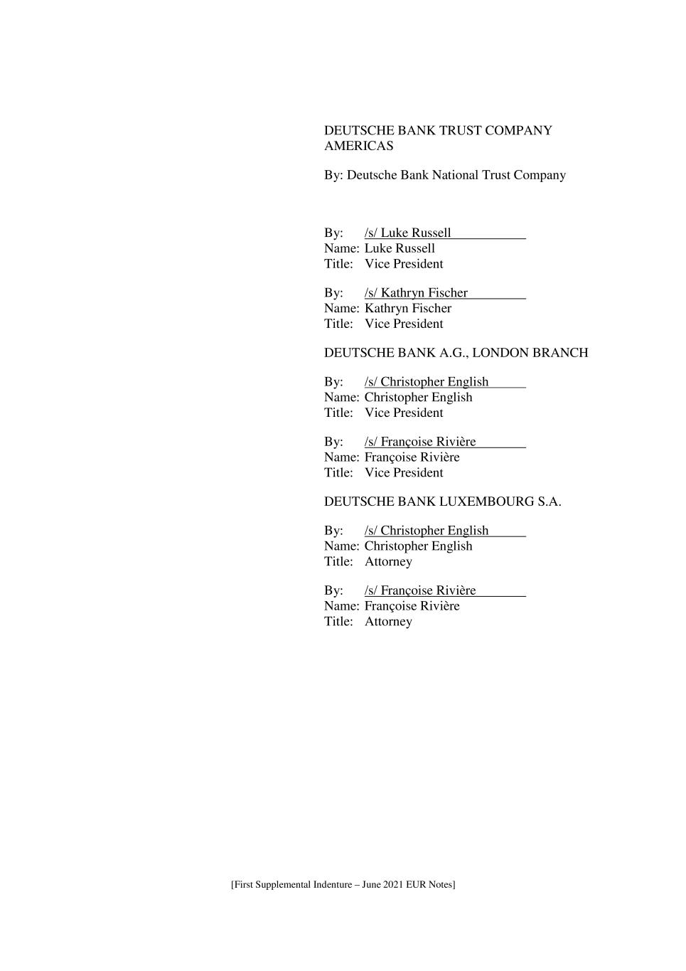 [First Supplemental Indenture – June 2021 EUR Notes] DEUTSCHE BANK TRUST COMPANY AMERICAS By: Deutsche Bank National Trust Company By: /s/ Luke Russell Name: Luke Russell Title: Vice President By: /s/ Kathryn Fischer Name: Kathryn Fischer Title: Vice President DEUTSCHE BANK A.G., LONDON BRANCH By: /s/ Christopher English Name: Christopher English Title: Vice President By: /s/ Françoise Rivière Name: Françoise Rivière Title: Vice President DEUTSCHE BANK LUXEMBOURG S.A. By: /s/ Christopher English Name: Christopher English Title: Attorney By: /s/ Françoise Rivière Name: Françoise Rivière Title: Attorney