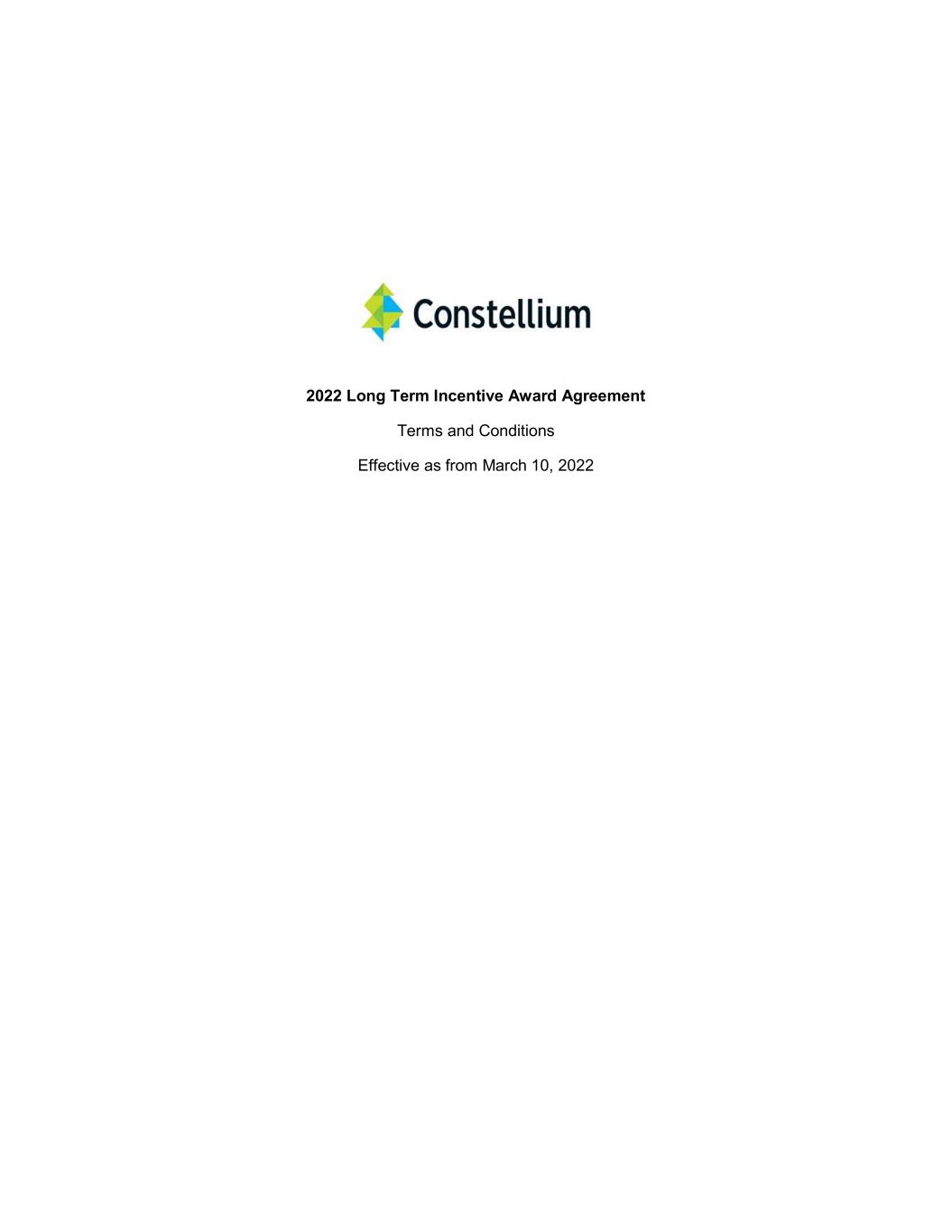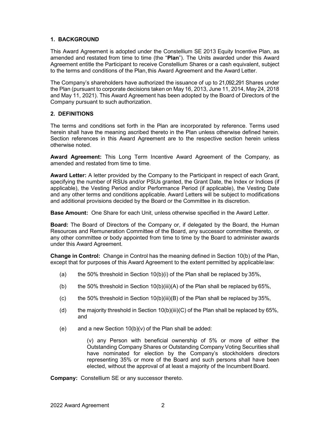 2022 Award Agreement 2 1. BACKGROUND This Award Agreement is adopted under the Constellium SE 2013 Equity Incentive Plan, as amended and restated from time to time (the “Plan”). The Units awarded under this Award Agreement entitle the Participant to receive Constellium Shares or a cash equivalent, subject to the terms and conditions of the Plan, this Award Agreement and the Award Letter. The Company’s shareholders have authorized the issuance of up to 21,092,291 Shares under the Plan (pursuant to corporate decisions taken on May 16, 2013, June 11, 2014, May 24, 2018 and May 11, 2021). This Award Agreement has been adopted by the Board of Directors of the Company pursuant to such authorization. 2. DEFINITIONS The terms and conditions set forth in the Plan are incorporated by reference. Terms used herein shall have the meaning ascribed thereto in the Plan unless otherwise defined herein. Section references in this Award Agreement are to the respective section herein unless otherwise noted. Award Agreement: This Long Term Incentive Award Agreement of the Company, as amended and restated from time to time. Award Letter: A letter provided by the Company to the Participant in respect of each Grant, specifying the number of RSUs and/or PSUs granted, the Grant Date, the Index or Indices (if applicable), the Vesting Period and/or Performance Period (if applicable), the Vesting Date and any other terms and conditions applicable. Award Letters will be subject to modifications and additional provisions decided by the Board or the Committee in its discretion. Base Amount: One Share for each Unit, unless otherwise specified in the Award Letter. Board: The Board of Directors of the Company or, if delegated by the Board, the Human Resources and Remuneration Committee of the Board, any successor committee thereto, or any other committee or body appointed from time to time by the Board to administer awards under this Award Agreement. Change in Control: Change in Control has the meaning defined in Section 10(b) of the Plan, except that for purposes of this Award Agreement to the extent permitted by applicable law: (a) the 50% threshold in Section 10(b)(i) of the Plan shall be replaced by 35%, (b) the 50% threshold in Section 10(b)(iii)(A) of the Plan shall be replaced by 65%, (c) the 50% threshold in Section 10(b)(iii)(B) of the Plan shall be replaced by 35%, (d) the majority threshold in Section 10(b)(iii)(C) of the Plan shall be replaced by 65%, and (e) and a new Section 10(b)(v) of the Plan shall be added: (v) any Person with beneficial ownership of 5% or more of either the Outstanding Company Shares or Outstanding Company Voting Securities shall have nominated for election by the Company’s stockholders directors representing 35% or more of the Board and such persons shall have been elected, without the approval of at least a majority of the Incumbent Board. Company: Constellium SE or any successor thereto.