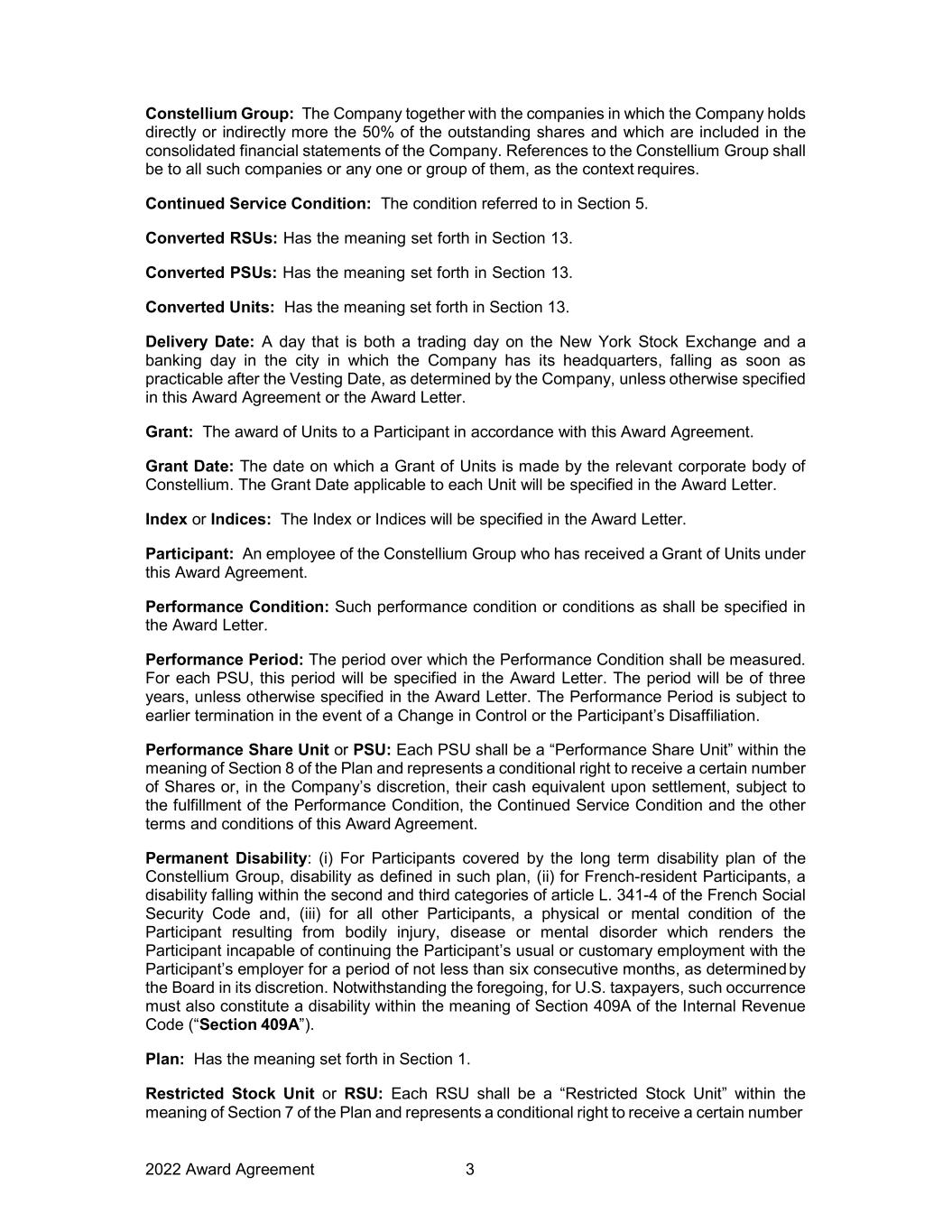 2022 Award Agreement 3 Constellium Group: The Company together with the companies in which the Company holds directly or indirectly more the 50% of the outstanding shares and which are included in the consolidated financial statements of the Company. References to the Constellium Group shall be to all such companies or any one or group of them, as the context requires. Continued Service Condition: The condition referred to in Section 5. Converted RSUs: Has the meaning set forth in Section 13. Converted PSUs: Has the meaning set forth in Section 13. Converted Units: Has the meaning set forth in Section 13. Delivery Date: A day that is both a trading day on the New York Stock Exchange and a banking day in the city in which the Company has its headquarters, falling as soon as practicable after the Vesting Date, as determined by the Company, unless otherwise specified in this Award Agreement or the Award Letter. Grant: The award of Units to a Participant in accordance with this Award Agreement. Grant Date: The date on which a Grant of Units is made by the relevant corporate body of Constellium. The Grant Date applicable to each Unit will be specified in the Award Letter. Index or Indices: The Index or Indices will be specified in the Award Letter. Participant: An employee of the Constellium Group who has received a Grant of Units under this Award Agreement. Performance Condition: Such performance condition or conditions as shall be specified in the Award Letter. Performance Period: The period over which the Performance Condition shall be measured. For each PSU, this period will be specified in the Award Letter. The period will be of three years, unless otherwise specified in the Award Letter. The Performance Period is subject to earlier termination in the event of a Change in Control or the Participant’s Disaffiliation. Performance Share Unit or PSU: Each PSU shall be a “Performance Share Unit” within the meaning of Section 8 of the Plan and represents a conditional right to receive a certain number of Shares or, in the Company’s discretion, their cash equivalent upon settlement, subject to the fulfillment of the Performance Condition, the Continued Service Condition and the other terms and conditions of this Award Agreement. Permanent Disability: (i) For Participants covered by the long term disability plan of the Constellium Group, disability as defined in such plan, (ii) for French-resident Participants, a disability falling within the second and third categories of article L. 341-4 of the French Social Security Code and, (iii) for all other Participants, a physical or mental condition of the Participant resulting from bodily injury, disease or mental disorder which renders the Participant incapable of continuing the Participant’s usual or customary employment with the Participant’s employer for a period of not less than six consecutive months, as determined by the Board in its discretion. Notwithstanding the foregoing, for U.S. taxpayers, such occurrence must also constitute a disability within the meaning of Section 409A of the Internal Revenue Code (“Section 409A”). Plan: Has the meaning set forth in Section 1. Restricted Stock Unit or RSU: Each RSU shall be a “Restricted Stock Unit” within the meaning of Section 7 of the Plan and represents a conditional right to receive a certain number