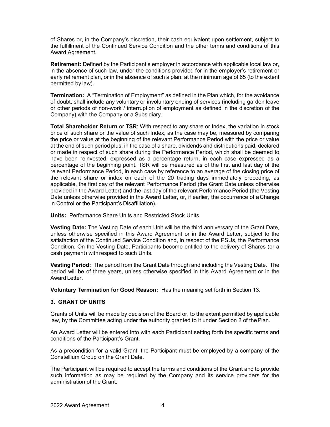 2022 Award Agreement 4 of Shares or, in the Company’s discretion, their cash equivalent upon settlement, subject to the fulfillment of the Continued Service Condition and the other terms and conditions of this Award Agreement. Retirement: Defined by the Participant’s employer in accordance with applicable local law or, in the absence of such law, under the conditions provided for in the employer’s retirement or early retirement plan, or in the absence of such a plan, at the minimum age of 65 (to the extent permitted by law). Termination: A “Termination of Employment” as defined in the Plan which, for the avoidance of doubt, shall include any voluntary or involuntary ending of services (including garden leave or other periods of non-work / interruption of employment as defined in the discretion of the Company) with the Company or a Subsidiary. Total Shareholder Return or TSR: With respect to any share or Index, the variation in stock price of such share or the value of such Index, as the case may be, measured by comparing the price or value at the beginning of the relevant Performance Period with the price or value at the end of such period plus, in the case of a share, dividends and distributions paid, declared or made in respect of such share during the Performance Period, which shall be deemed to have been reinvested, expressed as a percentage return, in each case expressed as a percentage of the beginning point. TSR will be measured as of the first and last day of the relevant Performance Period, in each case by reference to an average of the closing price of the relevant share or index on each of the 20 trading days immediately preceding, as applicable, the first day of the relevant Performance Period (the Grant Date unless otherwise provided in the Award Letter) and the last day of the relevant Performance Period (the Vesting Date unless otherwise provided in the Award Letter, or, if earlier, the occurrence of a Change in Control or the Participant’s Disaffiliation). Units: Performance Share Units and Restricted Stock Units. Vesting Date: The Vesting Date of each Unit will be the third anniversary of the Grant Date, unless otherwise specified in this Award Agreement or in the Award Letter, subject to the satisfaction of the Continued Service Condition and, in respect of the PSUs, the Performance Condition. On the Vesting Date, Participants become entitled to the delivery of Shares (or a cash payment) with respect to such Units. Vesting Period: The period from the Grant Date through and including the Vesting Date. The period will be of three years, unless otherwise specified in this Award Agreement or in the Award Letter. Voluntary Termination for Good Reason: Has the meaning set forth in Section 13. 3. GRANT OF UNITS Grants of Units will be made by decision of the Board or, to the extent permitted by applicable law, by the Committee acting under the authority granted to it under Section 2 of the Plan. An Award Letter will be entered into with each Participant setting forth the specific terms and conditions of the Participant’s Grant. As a precondition for a valid Grant, the Participant must be employed by a company of the Constellium Group on the Grant Date. The Participant will be required to accept the terms and conditions of the Grant and to provide such information as may be required by the Company and its service providers for the administration of the Grant.