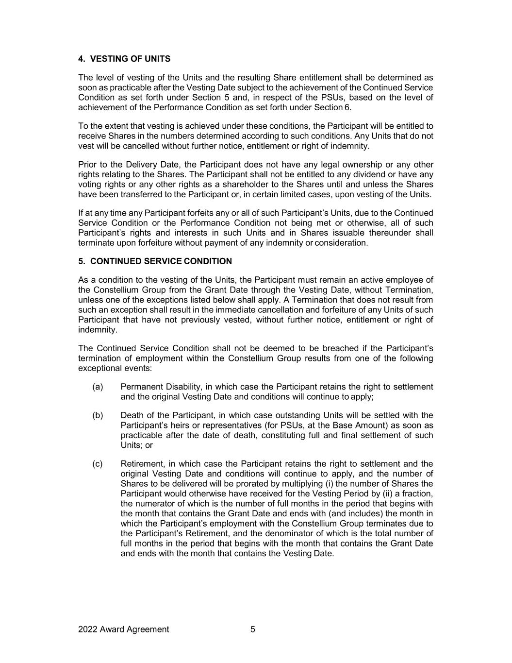 2022 Award Agreement 5 4. VESTING OF UNITS The level of vesting of the Units and the resulting Share entitlement shall be determined as soon as practicable after the Vesting Date subject to the achievement of the Continued Service Condition as set forth under Section 5 and, in respect of the PSUs, based on the level of achievement of the Performance Condition as set forth under Section 6. To the extent that vesting is achieved under these conditions, the Participant will be entitled to receive Shares in the numbers determined according to such conditions. Any Units that do not vest will be cancelled without further notice, entitlement or right of indemnity. Prior to the Delivery Date, the Participant does not have any legal ownership or any other rights relating to the Shares. The Participant shall not be entitled to any dividend or have any voting rights or any other rights as a shareholder to the Shares until and unless the Shares have been transferred to the Participant or, in certain limited cases, upon vesting of the Units. If at any time any Participant forfeits any or all of such Participant’s Units, due to the Continued Service Condition or the Performance Condition not being met or otherwise, all of such Participant’s rights and interests in such Units and in Shares issuable thereunder shall terminate upon forfeiture without payment of any indemnity or consideration. 5. CONTINUED SERVICE CONDITION As a condition to the vesting of the Units, the Participant must remain an active employee of the Constellium Group from the Grant Date through the Vesting Date, without Termination, unless one of the exceptions listed below shall apply. A Termination that does not result from such an exception shall result in the immediate cancellation and forfeiture of any Units of such Participant that have not previously vested, without further notice, entitlement or right of indemnity. The Continued Service Condition shall not be deemed to be breached if the Participant’s termination of employment within the Constellium Group results from one of the following exceptional events: (a) Permanent Disability, in which case the Participant retains the right to settlement and the original Vesting Date and conditions will continue to apply; (b) Death of the Participant, in which case outstanding Units will be settled with the Participant’s heirs or representatives (for PSUs, at the Base Amount) as soon as practicable after the date of death, constituting full and final settlement of such Units; or (c) Retirement, in which case the Participant retains the right to settlement and the original Vesting Date and conditions will continue to apply, and the number of Shares to be delivered will be prorated by multiplying (i) the number of Shares the Participant would otherwise have received for the Vesting Period by (ii) a fraction, the numerator of which is the number of full months in the period that begins with the month that contains the Grant Date and ends with (and includes) the month in which the Participant’s employment with the Constellium Group terminates due to the Participant’s Retirement, and the denominator of which is the total number of full months in the period that begins with the month that contains the Grant Date and ends with the month that contains the Vesting Date.