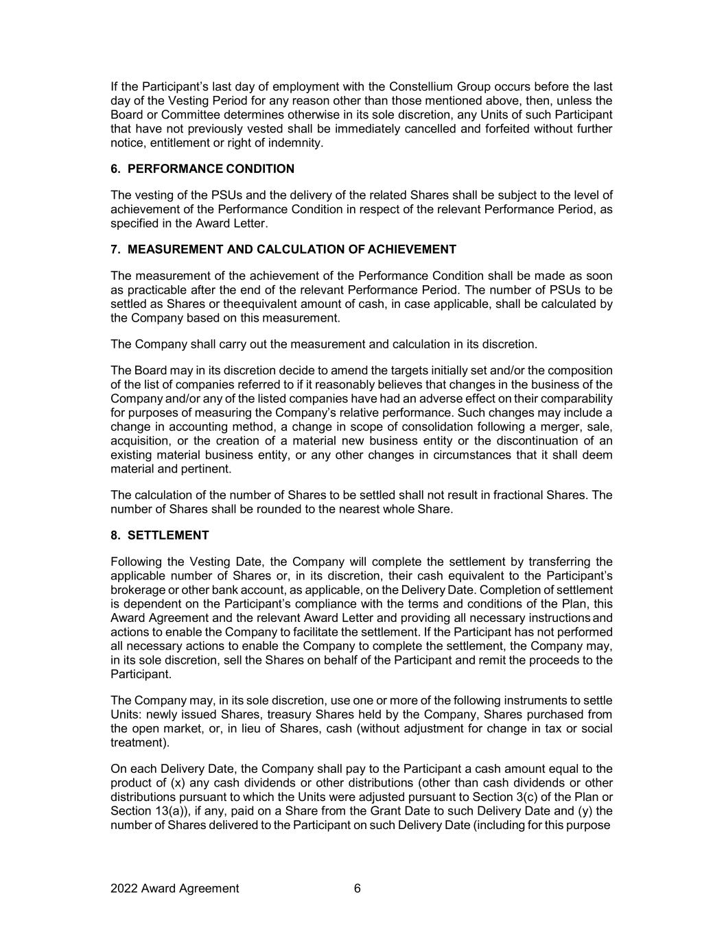 2022 Award Agreement 6 If the Participant’s last day of employment with the Constellium Group occurs before the last day of the Vesting Period for any reason other than those mentioned above, then, unless the Board or Committee determines otherwise in its sole discretion, any Units of such Participant that have not previously vested shall be immediately cancelled and forfeited without further notice, entitlement or right of indemnity. 6. PERFORMANCE CONDITION The vesting of the PSUs and the delivery of the related Shares shall be subject to the level of achievement of the Performance Condition in respect of the relevant Performance Period, as specified in the Award Letter. 7. MEASUREMENT AND CALCULATION OF ACHIEVEMENT The measurement of the achievement of the Performance Condition shall be made as soon as practicable after the end of the relevant Performance Period. The number of PSUs to be settled as Shares or the equivalent amount of cash, in case applicable, shall be calculated by the Company based on this measurement. The Company shall carry out the measurement and calculation in its discretion. The Board may in its discretion decide to amend the targets initially set and/or the composition of the list of companies referred to if it reasonably believes that changes in the business of the Company and/or any of the listed companies have had an adverse effect on their comparability for purposes of measuring the Company’s relative performance. Such changes may include a change in accounting method, a change in scope of consolidation following a merger, sale, acquisition, or the creation of a material new business entity or the discontinuation of an existing material business entity, or any other changes in circumstances that it shall deem material and pertinent. The calculation of the number of Shares to be settled shall not result in fractional Shares. The number of Shares shall be rounded to the nearest whole Share. 8. SETTLEMENT Following the Vesting Date, the Company will complete the settlement by transferring the applicable number of Shares or, in its discretion, their cash equivalent to the Participant’s brokerage or other bank account, as applicable, on the Delivery Date. Completion of settlement is dependent on the Participant’s compliance with the terms and conditions of the Plan, this Award Agreement and the relevant Award Letter and providing all necessary instructions and actions to enable the Company to facilitate the settlement. If the Participant has not performed all necessary actions to enable the Company to complete the settlement, the Company may, in its sole discretion, sell the Shares on behalf of the Participant and remit the proceeds to the Participant. The Company may, in its sole discretion, use one or more of the following instruments to settle Units: newly issued Shares, treasury Shares held by the Company, Shares purchased from the open market, or, in lieu of Shares, cash (without adjustment for change in tax or social treatment). On each Delivery Date, the Company shall pay to the Participant a cash amount equal to the product of (x) any cash dividends or other distributions (other than cash dividends or other distributions pursuant to which the Units were adjusted pursuant to Section 3(c) of the Plan or Section 13(a)), if any, paid on a Share from the Grant Date to such Delivery Date and (y) the number of Shares delivered to the Participant on such Delivery Date (including for this purpose