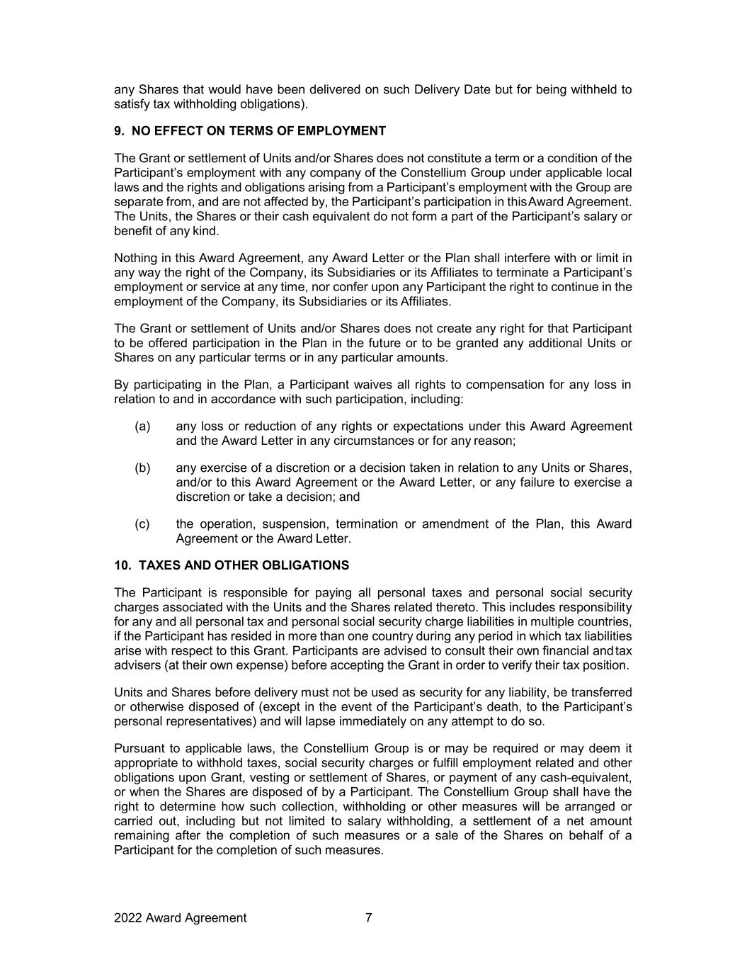 2022 Award Agreement 7 any Shares that would have been delivered on such Delivery Date but for being withheld to satisfy tax withholding obligations). 9. NO EFFECT ON TERMS OF EMPLOYMENT The Grant or settlement of Units and/or Shares does not constitute a term or a condition of the Participant’s employment with any company of the Constellium Group under applicable local laws and the rights and obligations arising from a Participant’s employment with the Group are separate from, and are not affected by, the Participant’s participation in this Award Agreement. The Units, the Shares or their cash equivalent do not form a part of the Participant’s salary or benefit of any kind. Nothing in this Award Agreement, any Award Letter or the Plan shall interfere with or limit in any way the right of the Company, its Subsidiaries or its Affiliates to terminate a Participant’s employment or service at any time, nor confer upon any Participant the right to continue in the employment of the Company, its Subsidiaries or its Affiliates. The Grant or settlement of Units and/or Shares does not create any right for that Participant to be offered participation in the Plan in the future or to be granted any additional Units or Shares on any particular terms or in any particular amounts. By participating in the Plan, a Participant waives all rights to compensation for any loss in relation to and in accordance with such participation, including: (a) any loss or reduction of any rights or expectations under this Award Agreement and the Award Letter in any circumstances or for any reason; (b) any exercise of a discretion or a decision taken in relation to any Units or Shares, and/or to this Award Agreement or the Award Letter, or any failure to exercise a discretion or take a decision; and (c) the operation, suspension, termination or amendment of the Plan, this Award Agreement or the Award Letter. 10. TAXES AND OTHER OBLIGATIONS The Participant is responsible for paying all personal taxes and personal social security charges associated with the Units and the Shares related thereto. This includes responsibility for any and all personal tax and personal social security charge liabilities in multiple countries, if the Participant has resided in more than one country during any period in which tax liabilities arise with respect to this Grant. Participants are advised to consult their own financial and tax advisers (at their own expense) before accepting the Grant in order to verify their tax position. Units and Shares before delivery must not be used as security for any liability, be transferred or otherwise disposed of (except in the event of the Participant’s death, to the Participant’s personal representatives) and will lapse immediately on any attempt to do so. Pursuant to applicable laws, the Constellium Group is or may be required or may deem it appropriate to withhold taxes, social security charges or fulfill employment related and other obligations upon Grant, vesting or settlement of Shares, or payment of any cash-equivalent, or when the Shares are disposed of by a Participant. The Constellium Group shall have the right to determine how such collection, withholding or other measures will be arranged or carried out, including but not limited to salary withholding, a settlement of a net amount remaining after the completion of such measures or a sale of the Shares on behalf of a Participant for the completion of such measures.