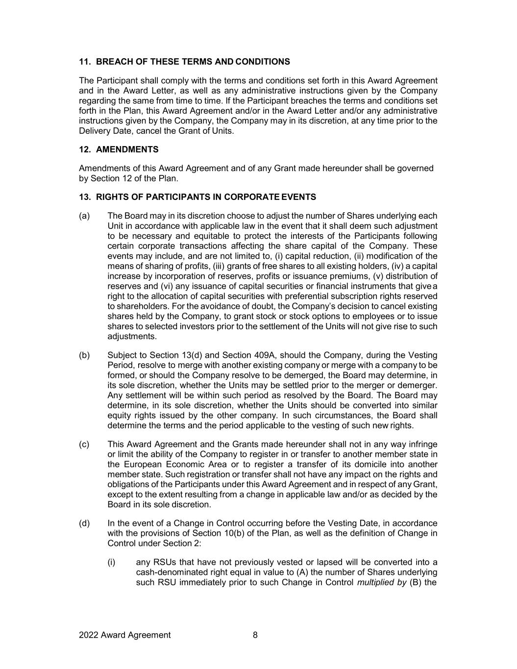2022 Award Agreement 8 11. BREACH OF THESE TERMS AND CONDITIONS The Participant shall comply with the terms and conditions set forth in this Award Agreement and in the Award Letter, as well as any administrative instructions given by the Company regarding the same from time to time. If the Participant breaches the terms and conditions set forth in the Plan, this Award Agreement and/or in the Award Letter and/or any administrative instructions given by the Company, the Company may in its discretion, at any time prior to the Delivery Date, cancel the Grant of Units. 12. AMENDMENTS Amendments of this Award Agreement and of any Grant made hereunder shall be governed by Section 12 of the Plan. 13. RIGHTS OF PARTICIPANTS IN CORPORATE EVENTS (a) The Board may in its discretion choose to adjust the number of Shares underlying each Unit in accordance with applicable law in the event that it shall deem such adjustment to be necessary and equitable to protect the interests of the Participants following certain corporate transactions affecting the share capital of the Company. These events may include, and are not limited to, (i) capital reduction, (ii) modification of the means of sharing of profits, (iii) grants of free shares to all existing holders, (iv) a capital increase by incorporation of reserves, profits or issuance premiums, (v) distribution of reserves and (vi) any issuance of capital securities or financial instruments that give a right to the allocation of capital securities with preferential subscription rights reserved to shareholders. For the avoidance of doubt, the Company’s decision to cancel existing shares held by the Company, to grant stock or stock options to employees or to issue shares to selected investors prior to the settlement of the Units will not give rise to such adjustments. (b) Subject to Section 13(d) and Section 409A, should the Company, during the Vesting Period, resolve to merge with another existing company or merge with a company to be formed, or should the Company resolve to be demerged, the Board may determine, in its sole discretion, whether the Units may be settled prior to the merger or demerger. Any settlement will be within such period as resolved by the Board. The Board may determine, in its sole discretion, whether the Units should be converted into similar equity rights issued by the other company. In such circumstances, the Board shall determine the terms and the period applicable to the vesting of such new rights. (c) This Award Agreement and the Grants made hereunder shall not in any way infringe or limit the ability of the Company to register in or transfer to another member state in the European Economic Area or to register a transfer of its domicile into another member state. Such registration or transfer shall not have any impact on the rights and obligations of the Participants under this Award Agreement and in respect of any Grant, except to the extent resulting from a change in applicable law and/or as decided by the Board in its sole discretion. (d) In the event of a Change in Control occurring before the Vesting Date, in accordance with the provisions of Section 10(b) of the Plan, as well as the definition of Change in Control under Section 2: (i) any RSUs that have not previously vested or lapsed will be converted into a cash-denominated right equal in value to (A) the number of Shares underlying such RSU immediately prior to such Change in Control multiplied by (B) the
