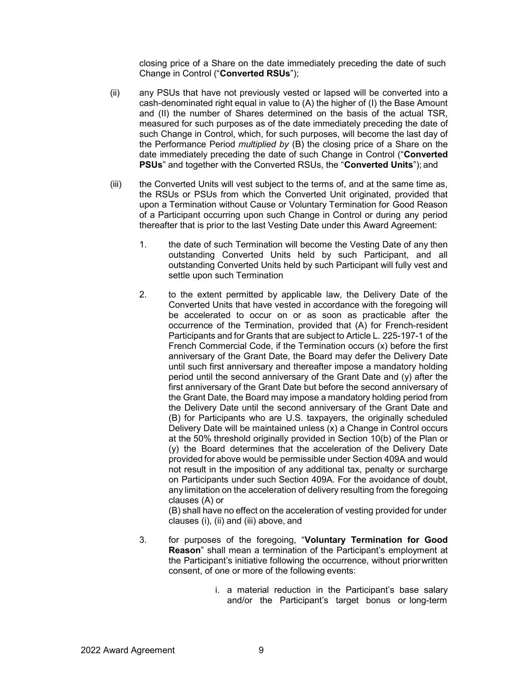 2022 Award Agreement 9 closing price of a Share on the date immediately preceding the date of such Change in Control (“Converted RSUs”); (ii) any PSUs that have not previously vested or lapsed will be converted into a cash-denominated right equal in value to (A) the higher of (I) the Base Amount and (II) the number of Shares determined on the basis of the actual TSR, measured for such purposes as of the date immediately preceding the date of such Change in Control, which, for such purposes, will become the last day of the Performance Period multiplied by (B) the closing price of a Share on the date immediately preceding the date of such Change in Control (“Converted PSUs” and together with the Converted RSUs, the “Converted Units”); and (iii) the Converted Units will vest subject to the terms of, and at the same time as, the RSUs or PSUs from which the Converted Unit originated, provided that upon a Termination without Cause or Voluntary Termination for Good Reason of a Participant occurring upon such Change in Control or during any period thereafter that is prior to the last Vesting Date under this Award Agreement: 1. the date of such Termination will become the Vesting Date of any then outstanding Converted Units held by such Participant, and all outstanding Converted Units held by such Participant will fully vest and settle upon such Termination 2. to the extent permitted by applicable law, the Delivery Date of the Converted Units that have vested in accordance with the foregoing will be accelerated to occur on or as soon as practicable after the occurrence of the Termination, provided that (A) for French-resident Participants and for Grants that are subject to Article L. 225-197-1 of the French Commercial Code, if the Termination occurs (x) before the first anniversary of the Grant Date, the Board may defer the Delivery Date until such first anniversary and thereafter impose a mandatory holding period until the second anniversary of the Grant Date and (y) after the first anniversary of the Grant Date but before the second anniversary of the Grant Date, the Board may impose a mandatory holding period from the Delivery Date until the second anniversary of the Grant Date and (B) for Participants who are U.S. taxpayers, the originally scheduled Delivery Date will be maintained unless (x) a Change in Control occurs at the 50% threshold originally provided in Section 10(b) of the Plan or (y) the Board determines that the acceleration of the Delivery Date provided for above would be permissible under Section 409A and would not result in the imposition of any additional tax, penalty or surcharge on Participants under such Section 409A. For the avoidance of doubt, any limitation on the acceleration of delivery resulting from the foregoing clauses (A) or (B) shall have no effect on the acceleration of vesting provided for under clauses (i), (ii) and (iii) above, and 3. for purposes of the foregoing, “Voluntary Termination for Good Reason” shall mean a termination of the Participant’s employment at the Participant’s initiative following the occurrence, without prior written consent, of one or more of the following events: i. a material reduction in the Participant’s base salary and/or the Participant’s target bonus or long-term
