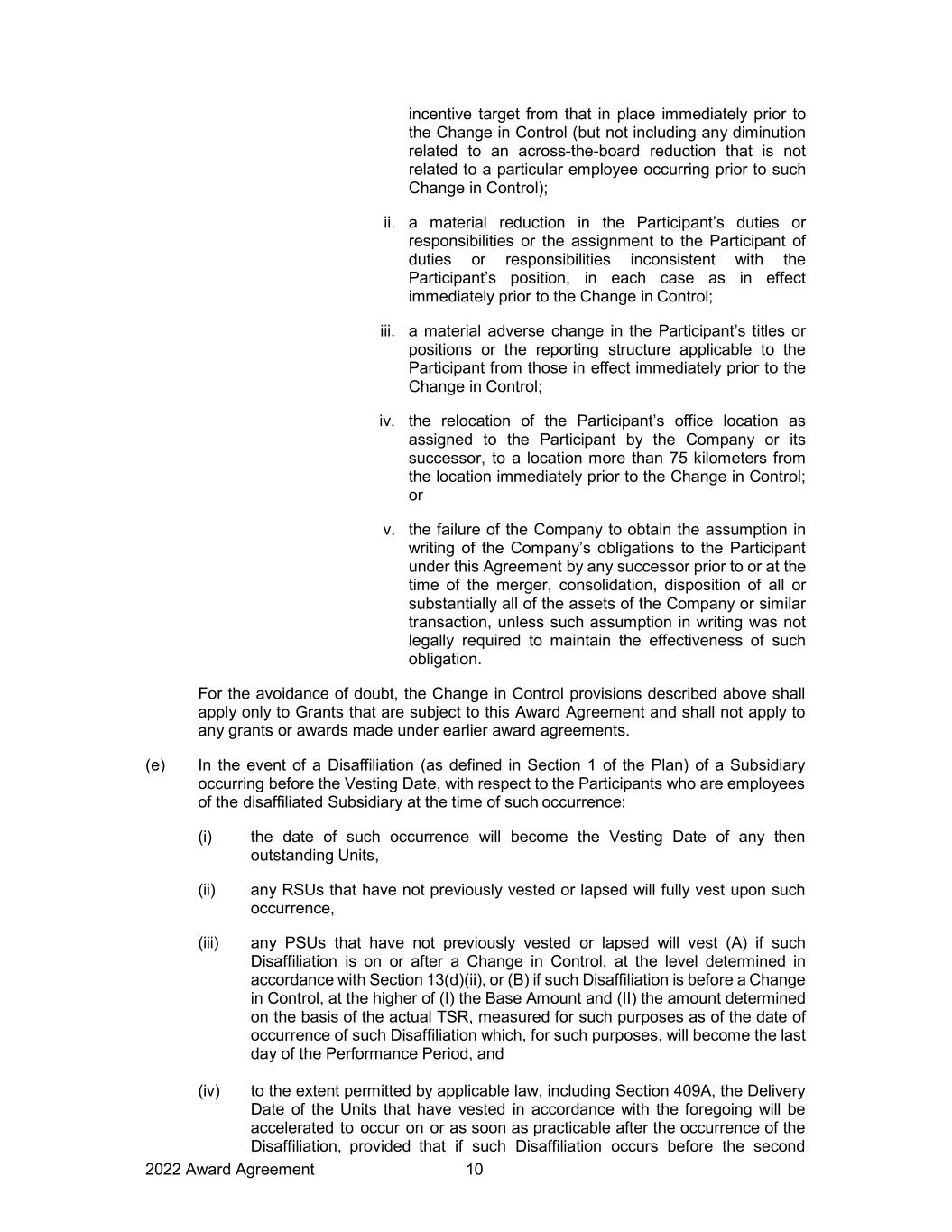 2022 Award Agreement 10 incentive target from that in place immediately prior to the Change in Control (but not including any diminution related to an across-the-board reduction that is not related to a particular employee occurring prior to such Change in Control); ii. a material reduction in the Participant’s duties or responsibilities or the assignment to the Participant of duties or responsibilities inconsistent with the Participant’s position, in each case as in effect immediately prior to the Change in Control; iii. a material adverse change in the Participant’s titles or positions or the reporting structure applicable to the Participant from those in effect immediately prior to the Change in Control; iv. the relocation of the Participant’s office location as assigned to the Participant by the Company or its successor, to a location more than 75 kilometers from the location immediately prior to the Change in Control; or v. the failure of the Company to obtain the assumption in writing of the Company’s obligations to the Participant under this Agreement by any successor prior to or at the time of the merger, consolidation, disposition of all or substantially all of the assets of the Company or similar transaction, unless such assumption in writing was not legally required to maintain the effectiveness of such obligation. For the avoidance of doubt, the Change in Control provisions described above shall apply only to Grants that are subject to this Award Agreement and shall not apply to any grants or awards made under earlier award agreements. (e) In the event of a Disaffiliation (as defined in Section 1 of the Plan) of a Subsidiary occurring before the Vesting Date, with respect to the Participants who are employees of the disaffiliated Subsidiary at the time of such occurrence: (i) the date of such occurrence will become the Vesting Date of any then outstanding Units, (ii) any RSUs that have not previously vested or lapsed will fully vest upon such occurrence, (iii) any PSUs that have not previously vested or lapsed will vest (A) if such Disaffiliation is on or after a Change in Control, at the level determined in accordance with Section 13(d)(ii), or (B) if such Disaffiliation is before a Change in Control, at the higher of (I) the Base Amount and (II) the amount determined on the basis of the actual TSR, measured for such purposes as of the date of occurrence of such Disaffiliation which, for such purposes, will become the last day of the Performance Period, and (iv) to the extent permitted by applicable law, including Section 409A, the Delivery Date of the Units that have vested in accordance with the foregoing will be accelerated to occur on or as soon as practicable after the occurrence of the Disaffiliation, provided that if such Disaffiliation occurs before the second