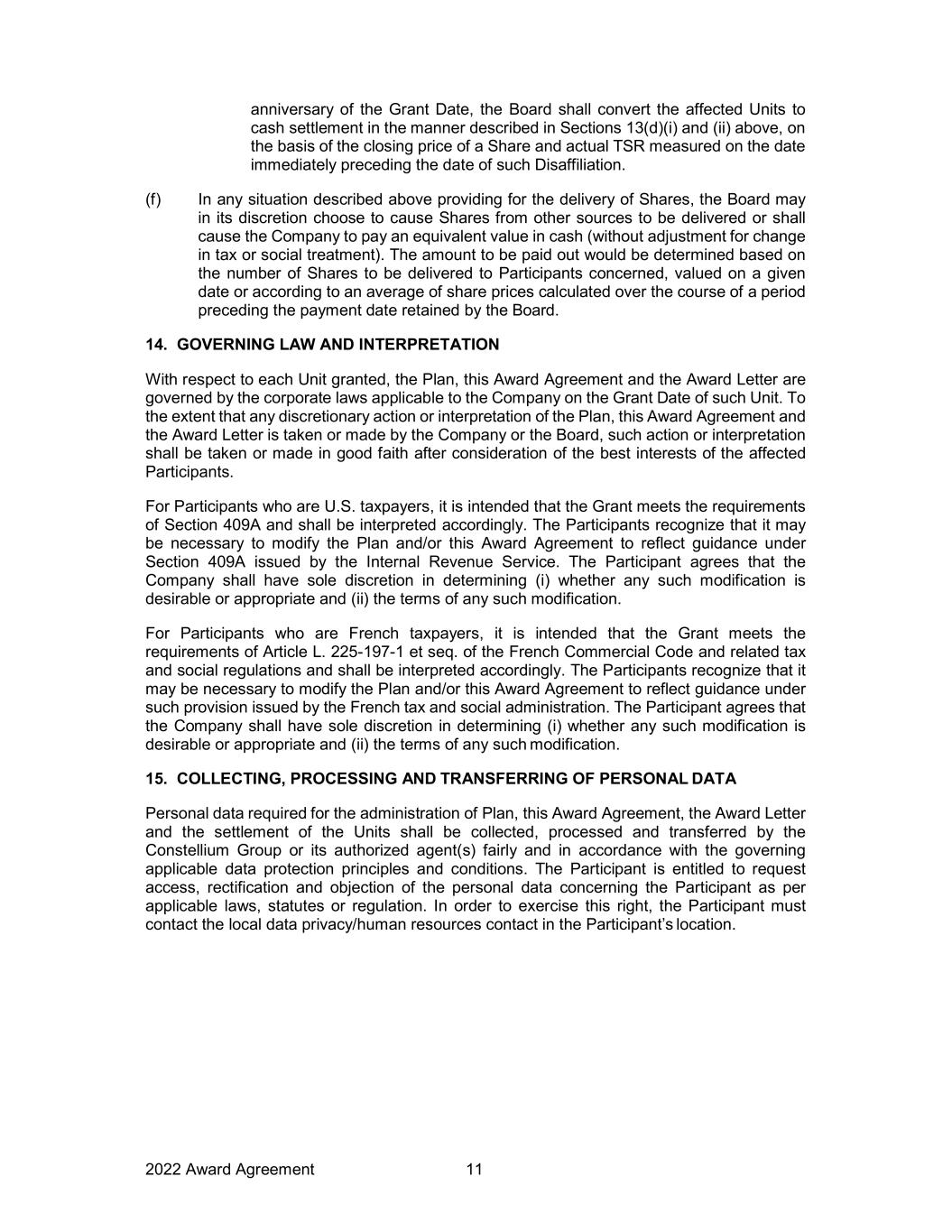 2022 Award Agreement 11 anniversary of the Grant Date, the Board shall convert the affected Units to cash settlement in the manner described in Sections 13(d)(i) and (ii) above, on the basis of the closing price of a Share and actual TSR measured on the date immediately preceding the date of such Disaffiliation. (f) In any situation described above providing for the delivery of Shares, the Board may in its discretion choose to cause Shares from other sources to be delivered or shall cause the Company to pay an equivalent value in cash (without adjustment for change in tax or social treatment). The amount to be paid out would be determined based on the number of Shares to be delivered to Participants concerned, valued on a given date or according to an average of share prices calculated over the course of a period preceding the payment date retained by the Board. 14. GOVERNING LAW AND INTERPRETATION With respect to each Unit granted, the Plan, this Award Agreement and the Award Letter are governed by the corporate laws applicable to the Company on the Grant Date of such Unit. To the extent that any discretionary action or interpretation of the Plan, this Award Agreement and the Award Letter is taken or made by the Company or the Board, such action or interpretation shall be taken or made in good faith after consideration of the best interests of the affected Participants. For Participants who are U.S. taxpayers, it is intended that the Grant meets the requirements of Section 409A and shall be interpreted accordingly. The Participants recognize that it may be necessary to modify the Plan and/or this Award Agreement to reflect guidance under Section 409A issued by the Internal Revenue Service. The Participant agrees that the Company shall have sole discretion in determining (i) whether any such modification is desirable or appropriate and (ii) the terms of any such modification. For Participants who are French taxpayers, it is intended that the Grant meets the requirements of Article L. 225-197-1 et seq. of the French Commercial Code and related tax and social regulations and shall be interpreted accordingly. The Participants recognize that it may be necessary to modify the Plan and/or this Award Agreement to reflect guidance under such provision issued by the French tax and social administration. The Participant agrees that the Company shall have sole discretion in determining (i) whether any such modification is desirable or appropriate and (ii) the terms of any such modification. 15. COLLECTING, PROCESSING AND TRANSFERRING OF PERSONAL DATA Personal data required for the administration of Plan, this Award Agreement, the Award Letter and the settlement of the Units shall be collected, processed and transferred by the Constellium Group or its authorized agent(s) fairly and in accordance with the governing applicable data protection principles and conditions. The Participant is entitled to request access, rectification and objection of the personal data concerning the Participant as per applicable laws, statutes or regulation. In order to exercise this right, the Participant must contact the local data privacy/human resources contact in the Participant’s location.