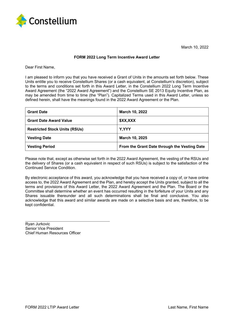 FORM 2022 LTIP Award Letter Last Name, First Name March 10, 2022 FORM 2022 Long Term Incentive Award Letter Dear First Name, I am pleased to inform you that you have received a Grant of Units in the amounts set forth below. These Units entitle you to receive Constellium Shares (or a cash equivalent, at Constellium’s discretion), subject to the terms and conditions set forth in this Award Letter, in the Constellium 2022 Long Term Incentive Award Agreement (the “2022 Award Agreement”) and the Constellium SE 2013 Equity Incentive Plan, as may be amended from time to time (the “Plan”). Capitalized Terms used in this Award Letter, unless so defined herein, shall have the meanings found in the 2022 Award Agreement or the Plan. Grant Date March 10, 2022 Grant Date Award Value $XX,XXX Restricted Stock Units (RSUs) Y,YYY Vesting Date March 10, 2025 Vesting Period From the Grant Date through the Vesting Date Please note that, except as otherwise set forth in the 2022 Award Agreement, the vesting of the RSUs and the delivery of Shares (or a cash equivalent in respect of such RSUs) is subject to the satisfaction of the Continued Service Condition. By electronic acceptance of this award, you acknowledge that you have received a copy of, or have online access to, the 2022 Award Agreement and the Plan, and hereby accept the Units granted, subject to all the terms and provisions of this Award Letter, the 2022 Award Agreement and the Plan. The Board or the Committee shall determine whether an event has occurred resulting in the forfeiture of your Units and any Shares issuable thereunder and all such determinations shall be final and conclusive. You also acknowledge that this award and similar awards are made on a selective basis and are, therefore, to be kept confidential. Ryan Jurkovic Senior Vice President Chief Human Resources Officer