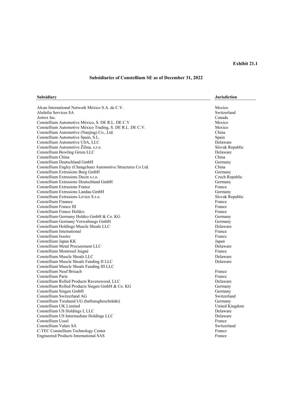 Exhibit 21.1 Subsidiaries of Constellium SE as of December 31, 2022 Subsidiary Jurisdiction Alcan International Network México S.A. de C.V. Mexico AluInfra Services SA Switzerland Astrex Inc. Canada Constellium Automotive México, S. DE R.L. DE C.V Mexico Constellium Automotive México Trading, S. DE R.L. DE C.V. Mexico Constellium Automotive (Nanjing) Co., Ltd. China Constellium Automotive Spain, S.L. Spain Constellium Automotive USA, LLC Delaware Constellium Automotive Žilina, s.r.o. Slovak Republic Constellium Bowling Green LLC Delaware Constellium China China Constellium Deutschland GmbH Germany Constellium Engley (Changchun) Automotive Structures Co Ltd. China Constellium Extrusions Burg GmbH Germany Constellium Extrusions Decin s.r.o. Czech Republic Constellium Extrusions Deutschland GmbH Germany Constellium Extrusions France France Constellium Extrusions Landau GmbH Germany Constellium Extrusions Levice S.r.o. Slovak Republic Constellium Finance France Constellium France III France Constellium France Holdco France Constellium Germany Holdco GmbH & Co. KG Germany Constellium Germany Verwaltungs GmbH Germany Constellium Holdings Muscle Shoals LLC Delaware Constellium International France Constellium Issoire France Constellium Japan KK Japan Constellium Metal Procurement LLC Constellium Montreuil Juigné Delaware France Constellium Muscle Shoals LLC Delaware Constellium Muscle Shoals Funding II LLC Delaware Constellium Muscle Shoals Funding III LLC Constellium Neuf Brisach France Constellium Paris France Constellium Rolled Products Ravenswood, LLC Delaware Constellium Rolled Products Singen GmbH & Co. KG Germany Constellium Singen GmbH Germany Constellium Switzerland AG Switzerland Constellium Treuhand UG (haftunsgbeschränkt) Germany Constellium UK Limited United Kingdom Constellium US Holdings I, LLC Delaware Constellium US Intermediate Holdings LLC Delaware Constellium Ussel France Constellium Valais SA Switzerland C-TEC Constellium Technology Center France Engineered Products International SAS France