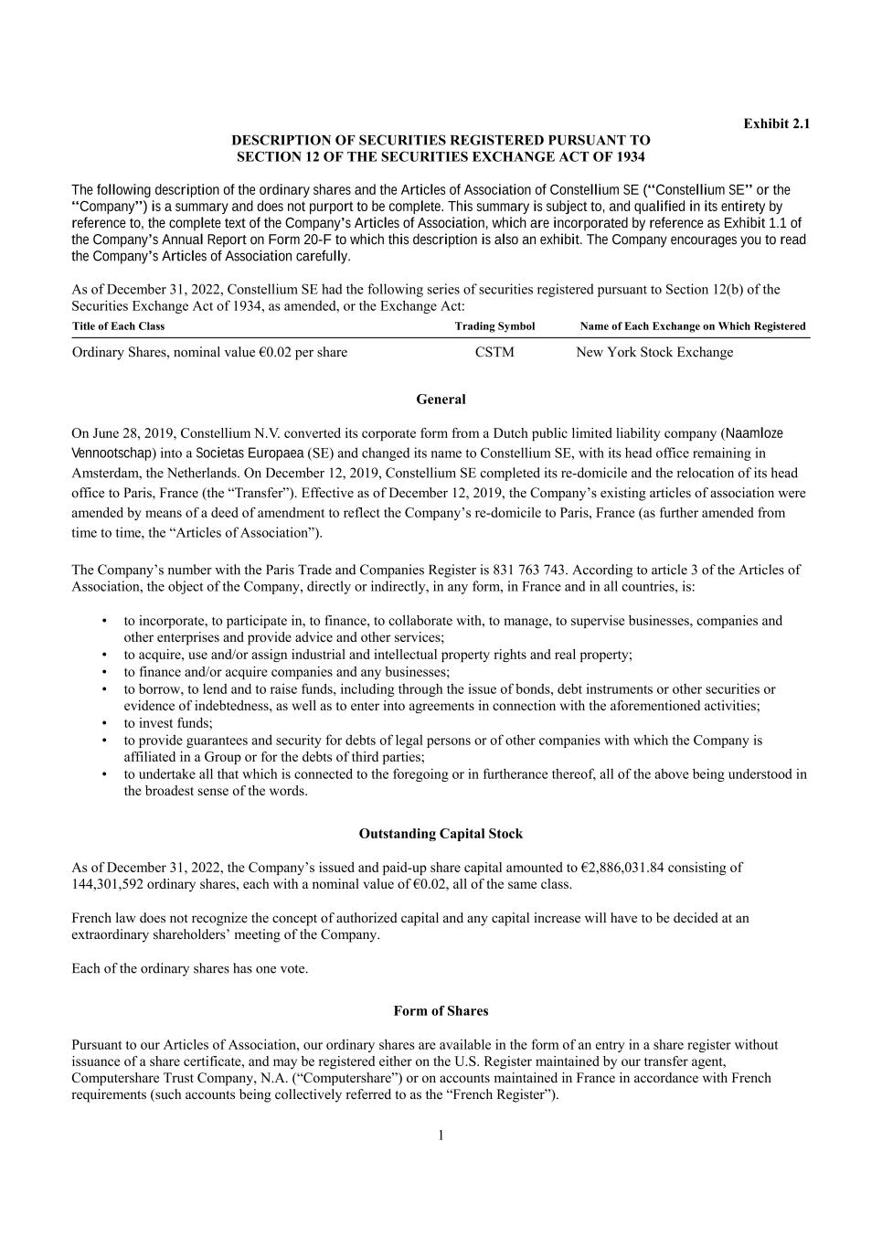 1 Exhibit 2.1 DESCRIPTION OF SECURITIES REGISTERED PURSUANT TO SECTION 12 OF THE SECURITIES EXCHANGE ACT OF 1934 The following description of the ordinary shares and the Articles of Association of Constellium SE (“Constellium SE” or the “Company”) is a summary and does not purport to be complete. This summary is subject to, and qualified in its entirety by reference to, the complete text of the Company’s Articles of Association, which are incorporated by reference as Exhibit 1.1 of the Company’s Annual Report on Form 20-F to which this description is also an exhibit. The Company encourages you to read the Company’s Articles of Association carefully. As of December 31, 2022, Constellium SE had the following series of securities registered pursuant to Section 12(b) of the Securities Exchange Act of 1934, as amended, or the Exchange Act: Title of Each Class Trading Symbol Name of Each Exchange on Which Registered Ordinary Shares, nominal value €0.02 per share CSTM New York Stock Exchange General On June 28, 2019, Constellium N.V. converted its corporate form from a Dutch public limited liability company (Naamloze Vennootschap) into a Societas Europaea (SE) and changed its name to Constellium SE, with its head office remaining in Amsterdam, the Netherlands. On December 12, 2019, Constellium SE completed its re-domicile and the relocation of its head office to Paris, France (the “Transfer”). Effective as of December 12, 2019, the Company’s existing articles of association were amended by means of a deed of amendment to reflect the Company’s re-domicile to Paris, France (as further amended from time to time, the “Articles of Association”). The Company’s number with the Paris Trade and Companies Register is 831 763 743. According to article 3 of the Articles of Association, the object of the Company, directly or indirectly, in any form, in France and in all countries, is: • to incorporate, to participate in, to finance, to collaborate with, to manage, to supervise businesses, companies and other enterprises and provide advice and other services; • to acquire, use and/or assign industrial and intellectual property rights and real property; • to finance and/or acquire companies and any businesses; • to borrow, to lend and to raise funds, including through the issue of bonds, debt instruments or other securities or evidence of indebtedness, as well as to enter into agreements in connection with the aforementioned activities; • to invest funds; • to provide guarantees and security for debts of legal persons or of other companies with which the Company is affiliated in a Group or for the debts of third parties; • to undertake all that which is connected to the foregoing or in furtherance thereof, all of the above being understood in the broadest sense of the words. Outstanding Capital Stock As of December 31, 2022, the Company’s issued and paid-up share capital amounted to €2,886,031.84 consisting of 144,301,592 ordinary shares, each with a nominal value of €0.02, all of the same class. French law does not recognize the concept of authorized capital and any capital increase will have to be decided at an extraordinary shareholders’ meeting of the Company. Each of the ordinary shares has one vote. Form of Shares Pursuant to our Articles of Association, our ordinary shares are available in the form of an entry in a share register without issuance of a share certificate, and may be registered either on the U.S. Register maintained by our transfer agent, Computershare Trust Company, N.A. (“Computershare”) or on accounts maintained in France in accordance with French requirements (such accounts being collectively referred to as the “French Register”).