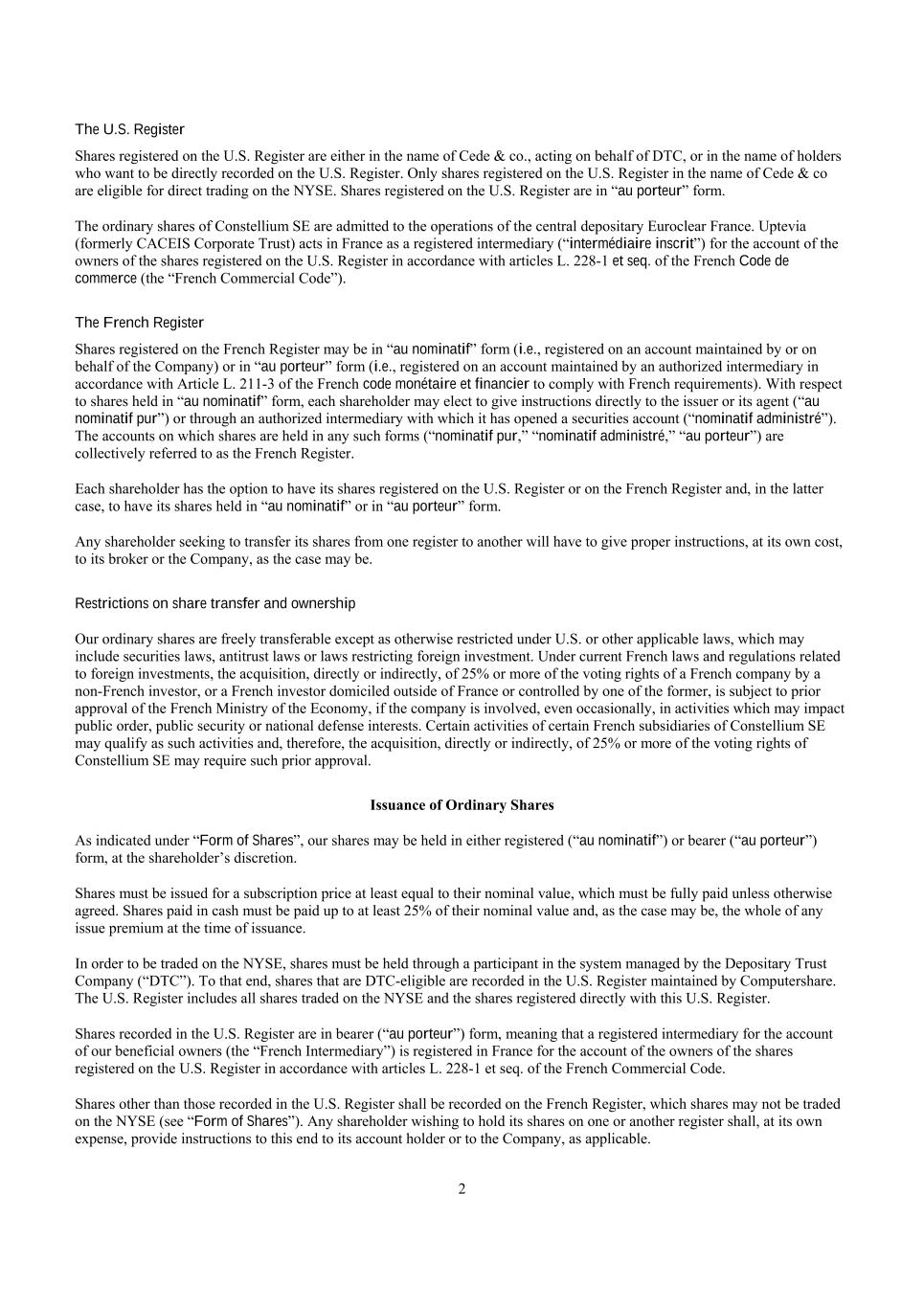 2 The U.S. Register Shares registered on the U.S. Register are either in the name of Cede & co., acting on behalf of DTC, or in the name of holders who want to be directly recorded on the U.S. Register. Only shares registered on the U.S. Register in the name of Cede & co are eligible for direct trading on the NYSE. Shares registered on the U.S. Register are in “au porteur” form. The ordinary shares of Constellium SE are admitted to the operations of the central depositary Euroclear France. Uptevia (formerly CACEIS Corporate Trust) acts in France as a registered intermediary (“intermédiaire inscrit”) for the account of the owners of the shares registered on the U.S. Register in accordance with articles L. 228-1 et seq. of the French Code de commerce (the “French Commercial Code”). The French Register Shares registered on the French Register may be in “au nominatif” form (i.e., registered on an account maintained by or on behalf of the Company) or in “au porteur” form (i.e., registered on an account maintained by an authorized intermediary in accordance with Article L. 211-3 of the French code monétaire et financier to comply with French requirements). With respect to shares held in “au nominatif” form, each shareholder may elect to give instructions directly to the issuer or its agent (“au nominatif pur”) or through an authorized intermediary with which it has opened a securities account (“nominatif administré”). The accounts on which shares are held in any such forms (“nominatif pur,” “nominatif administré,” “au porteur”) are collectively referred to as the French Register. Each shareholder has the option to have its shares registered on the U.S. Register or on the French Register and, in the latter case, to have its shares held in “au nominatif” or in “au porteur” form. Any shareholder seeking to transfer its shares from one register to another will have to give proper instructions, at its own cost, to its broker or the Company, as the case may be. Restrictions on share transfer and ownership Our ordinary shares are freely transferable except as otherwise restricted under U.S. or other applicable laws, which may include securities laws, antitrust laws or laws restricting foreign investment. Under current French laws and regulations related to foreign investments, the acquisition, directly or indirectly, of 25% or more of the voting rights of a French company by a non-French investor, or a French investor domiciled outside of France or controlled by one of the former, is subject to prior approval of the French Ministry of the Economy, if the company is involved, even occasionally, in activities which may impact public order, public security or national defense interests. Certain activities of certain French subsidiaries of Constellium SE may qualify as such activities and, therefore, the acquisition, directly or indirectly, of 25% or more of the voting rights of Constellium SE may require such prior approval. Issuance of Ordinary Shares As indicated under “Form of Shares”, our shares may be held in either registered (“au nominatif”) or bearer (“au porteur”) form, at the shareholder’s discretion. Shares must be issued for a subscription price at least equal to their nominal value, which must be fully paid unless otherwise agreed. Shares paid in cash must be paid up to at least 25% of their nominal value and, as the case may be, the whole of any issue premium at the time of issuance. In order to be traded on the NYSE, shares must be held through a participant in the system managed by the Depositary Trust Company (“DTC”). To that end, shares that are DTC-eligible are recorded in the U.S. Register maintained by Computershare. The U.S. Register includes all shares traded on the NYSE and the shares registered directly with this U.S. Register. Shares recorded in the U.S. Register are in bearer (“au porteur”) form, meaning that a registered intermediary for the account of our beneficial owners (the “French Intermediary”) is registered in France for the account of the owners of the shares registered on the U.S. Register in accordance with articles L. 228-1 et seq. of the French Commercial Code. Shares other than those recorded in the U.S. Register shall be recorded on the French Register, which shares may not be traded on the NYSE (see “Form of Shares”). Any shareholder wishing to hold its shares on one or another register shall, at its own expense, provide instructions to this end to its account holder or to the Company, as applicable.