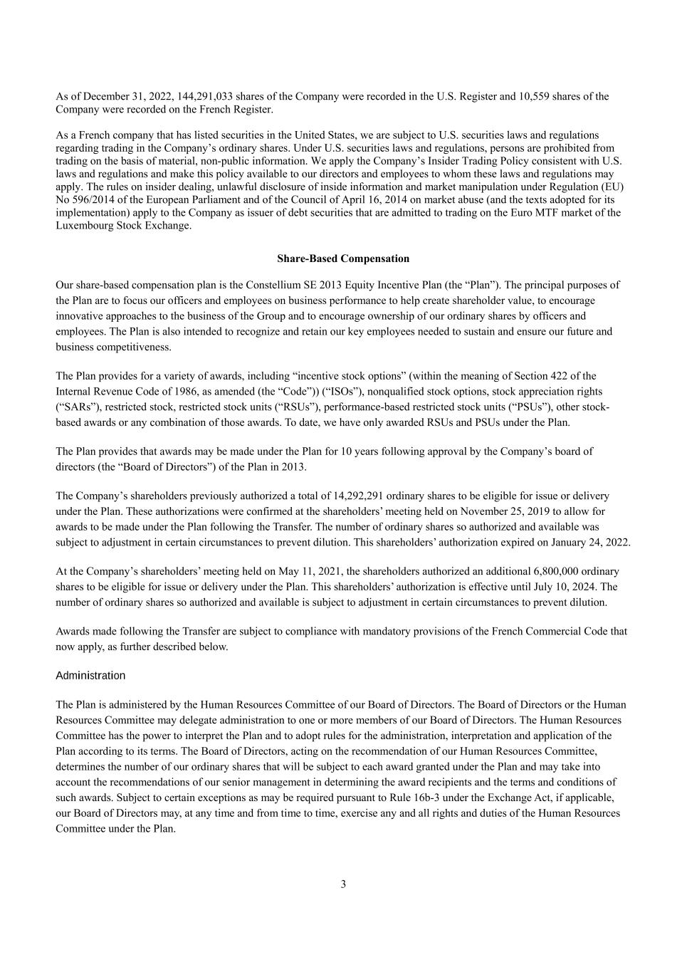 3 As of December 31, 2022, 144,291,033 shares of the Company were recorded in the U.S. Register and 10,559 shares of the Company were recorded on the French Register. As a French company that has listed securities in the United States, we are subject to U.S. securities laws and regulations regarding trading in the Company’s ordinary shares. Under U.S. securities laws and regulations, persons are prohibited from trading on the basis of material, non-public information. We apply the Company’s Insider Trading Policy consistent with U.S. laws and regulations and make this policy available to our directors and employees to whom these laws and regulations may apply. The rules on insider dealing, unlawful disclosure of inside information and market manipulation under Regulation (EU) No 596/2014 of the European Parliament and of the Council of April 16, 2014 on market abuse (and the texts adopted for its implementation) apply to the Company as issuer of debt securities that are admitted to trading on the Euro MTF market of the Luxembourg Stock Exchange. Share-Based Compensation Our share-based compensation plan is the Constellium SE 2013 Equity Incentive Plan (the “Plan”). The principal purposes of the Plan are to focus our officers and employees on business performance to help create shareholder value, to encourage innovative approaches to the business of the Group and to encourage ownership of our ordinary shares by officers and employees. The Plan is also intended to recognize and retain our key employees needed to sustain and ensure our future and business competitiveness. The Plan provides for a variety of awards, including “incentive stock options” (within the meaning of Section 422 of the Internal Revenue Code of 1986, as amended (the “Code”)) (“ISOs”), nonqualified stock options, stock appreciation rights (“SARs”), restricted stock, restricted stock units (“RSUs”), performance-based restricted stock units (“PSUs”), other stock- based awards or any combination of those awards. To date, we have only awarded RSUs and PSUs under the Plan. The Plan provides that awards may be made under the Plan for 10 years following approval by the Company’s board of directors (the “Board of Directors”) of the Plan in 2013. The Company’s shareholders previously authorized a total of 14,292,291 ordinary shares to be eligible for issue or delivery under the Plan. These authorizations were confirmed at the shareholders’ meeting held on November 25, 2019 to allow for awards to be made under the Plan following the Transfer. The number of ordinary shares so authorized and available was subject to adjustment in certain circumstances to prevent dilution. This shareholders’ authorization expired on January 24, 2022. At the Company’s shareholders’ meeting held on May 11, 2021, the shareholders authorized an additional 6,800,000 ordinary shares to be eligible for issue or delivery under the Plan. This shareholders’ authorization is effective until July 10, 2024. The number of ordinary shares so authorized and available is subject to adjustment in certain circumstances to prevent dilution. Awards made following the Transfer are subject to compliance with mandatory provisions of the French Commercial Code that now apply, as further described below. Administration The Plan is administered by the Human Resources Committee of our Board of Directors. The Board of Directors or the Human Resources Committee may delegate administration to one or more members of our Board of Directors. The Human Resources Committee has the power to interpret the Plan and to adopt rules for the administration, interpretation and application of the Plan according to its terms. The Board of Directors, acting on the recommendation of our Human Resources Committee, determines the number of our ordinary shares that will be subject to each award granted under the Plan and may take into account the recommendations of our senior management in determining the award recipients and the terms and conditions of such awards. Subject to certain exceptions as may be required pursuant to Rule 16b-3 under the Exchange Act, if applicable, our Board of Directors may, at any time and from time to time, exercise any and all rights and duties of the Human Resources Committee under the Plan.