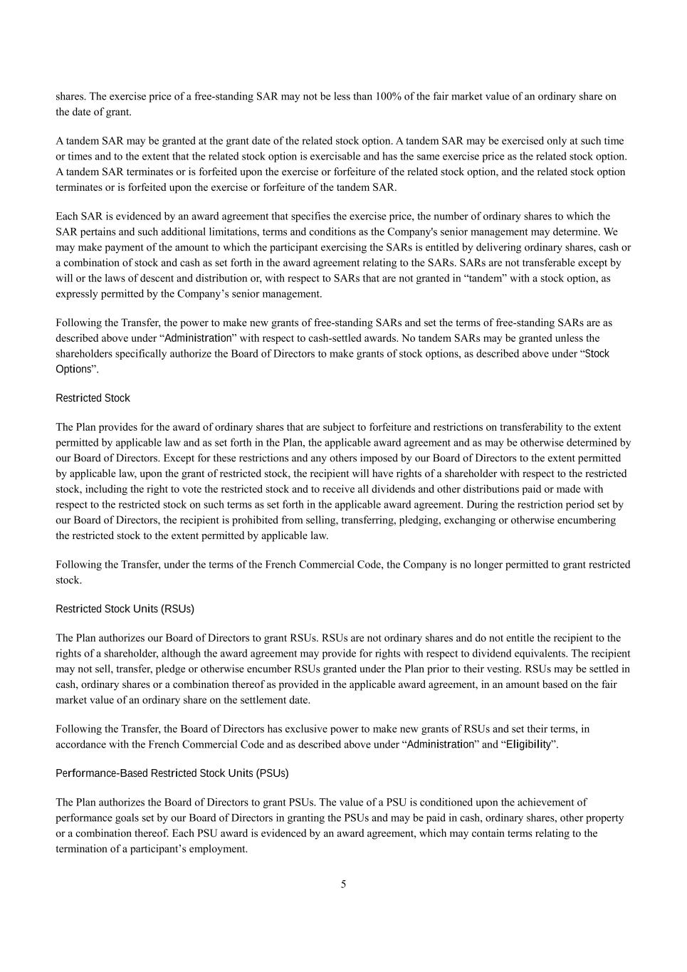 5 shares. The exercise price of a free-standing SAR may not be less than 100% of the fair market value of an ordinary share on the date of grant. A tandem SAR may be granted at the grant date of the related stock option. A tandem SAR may be exercised only at such time or times and to the extent that the related stock option is exercisable and has the same exercise price as the related stock option. A tandem SAR terminates or is forfeited upon the exercise or forfeiture of the related stock option, and the related stock option terminates or is forfeited upon the exercise or forfeiture of the tandem SAR. Each SAR is evidenced by an award agreement that specifies the exercise price, the number of ordinary shares to which the SAR pertains and such additional limitations, terms and conditions as the Company's senior management may determine. We may make payment of the amount to which the participant exercising the SARs is entitled by delivering ordinary shares, cash or a combination of stock and cash as set forth in the award agreement relating to the SARs. SARs are not transferable except by will or the laws of descent and distribution or, with respect to SARs that are not granted in “tandem” with a stock option, as expressly permitted by the Company’s senior management. Following the Transfer, the power to make new grants of free-standing SARs and set the terms of free-standing SARs are as described above under “Administration” with respect to cash-settled awards. No tandem SARs may be granted unless the shareholders specifically authorize the Board of Directors to make grants of stock options, as described above under “Stock Options”. Restricted Stock The Plan provides for the award of ordinary shares that are subject to forfeiture and restrictions on transferability to the extent permitted by applicable law and as set forth in the Plan, the applicable award agreement and as may be otherwise determined by our Board of Directors. Except for these restrictions and any others imposed by our Board of Directors to the extent permitted by applicable law, upon the grant of restricted stock, the recipient will have rights of a shareholder with respect to the restricted stock, including the right to vote the restricted stock and to receive all dividends and other distributions paid or made with respect to the restricted stock on such terms as set forth in the applicable award agreement. During the restriction period set by our Board of Directors, the recipient is prohibited from selling, transferring, pledging, exchanging or otherwise encumbering the restricted stock to the extent permitted by applicable law. Following the Transfer, under the terms of the French Commercial Code, the Company is no longer permitted to grant restricted stock. Restricted Stock Units (RSUs) The Plan authorizes our Board of Directors to grant RSUs. RSUs are not ordinary shares and do not entitle the recipient to the rights of a shareholder, although the award agreement may provide for rights with respect to dividend equivalents. The recipient may not sell, transfer, pledge or otherwise encumber RSUs granted under the Plan prior to their vesting. RSUs may be settled in cash, ordinary shares or a combination thereof as provided in the applicable award agreement, in an amount based on the fair market value of an ordinary share on the settlement date. Following the Transfer, the Board of Directors has exclusive power to make new grants of RSUs and set their terms, in accordance with the French Commercial Code and as described above under “Administration” and “Eligibility”. Performance-Based Restricted Stock Units (PSUs) The Plan authorizes the Board of Directors to grant PSUs. The value of a PSU is conditioned upon the achievement of performance goals set by our Board of Directors in granting the PSUs and may be paid in cash, ordinary shares, other property or a combination thereof. Each PSU award is evidenced by an award agreement, which may contain terms relating to the termination of a participant’s employment.