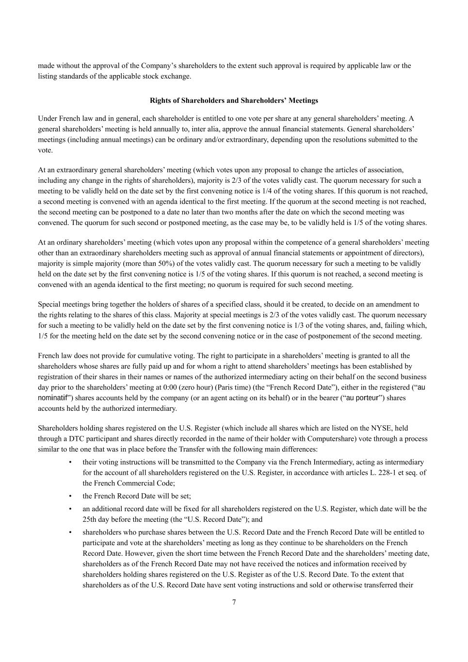 7 made without the approval of the Company’s shareholders to the extent such approval is required by applicable law or the listing standards of the applicable stock exchange. Rights of Shareholders and Shareholders’ Meetings Under French law and in general, each shareholder is entitled to one vote per share at any general shareholders’ meeting. A general shareholders’ meeting is held annually to, inter alia, approve the annual financial statements. General shareholders’ meetings (including annual meetings) can be ordinary and/or extraordinary, depending upon the resolutions submitted to the vote. At an extraordinary general shareholders’ meeting (which votes upon any proposal to change the articles of association, including any change in the rights of shareholders), majority is 2/3 of the votes validly cast. The quorum necessary for such a meeting to be validly held on the date set by the first convening notice is 1/4 of the voting shares. If this quorum is not reached, a second meeting is convened with an agenda identical to the first meeting. If the quorum at the second meeting is not reached, the second meeting can be postponed to a date no later than two months after the date on which the second meeting was convened. The quorum for such second or postponed meeting, as the case may be, to be validly held is 1/5 of the voting shares. At an ordinary shareholders’ meeting (which votes upon any proposal within the competence of a general shareholders’ meeting other than an extraordinary shareholders meeting such as approval of annual financial statements or appointment of directors), majority is simple majority (more than 50%) of the votes validly cast. The quorum necessary for such a meeting to be validly held on the date set by the first convening notice is 1/5 of the voting shares. If this quorum is not reached, a second meeting is convened with an agenda identical to the first meeting; no quorum is required for such second meeting. Special meetings bring together the holders of shares of a specified class, should it be created, to decide on an amendment to the rights relating to the shares of this class. Majority at special meetings is 2/3 of the votes validly cast. The quorum necessary for such a meeting to be validly held on the date set by the first convening notice is 1/3 of the voting shares, and, failing which, 1/5 for the meeting held on the date set by the second convening notice or in the case of postponement of the second meeting. French law does not provide for cumulative voting. The right to participate in a shareholders’ meeting is granted to all the shareholders whose shares are fully paid up and for whom a right to attend shareholders’ meetings has been established by registration of their shares in their names or names of the authorized intermediary acting on their behalf on the second business day prior to the shareholders’ meeting at 0:00 (zero hour) (Paris time) (the “French Record Date”), either in the registered (“au nominatif”) shares accounts held by the company (or an agent acting on its behalf) or in the bearer (“au porteur”) shares accounts held by the authorized intermediary. Shareholders holding shares registered on the U.S. Register (which include all shares which are listed on the NYSE, held through a DTC participant and shares directly recorded in the name of their holder with Computershare) vote through a process similar to the one that was in place before the Transfer with the following main differences: • their voting instructions will be transmitted to the Company via the French Intermediary, acting as intermediary for the account of all shareholders registered on the U.S. Register, in accordance with articles L. 228-1 et seq. of the French Commercial Code; • the French Record Date will be set; • an additional record date will be fixed for all shareholders registered on the U.S. Register, which date will be the 25th day before the meeting (the “U.S. Record Date”); and • shareholders who purchase shares between the U.S. Record Date and the French Record Date will be entitled to participate and vote at the shareholders’ meeting as long as they continue to be shareholders on the French Record Date. However, given the short time between the French Record Date and the shareholders’ meeting date, shareholders as of the French Record Date may not have received the notices and information received by shareholders holding shares registered on the U.S. Register as of the U.S. Record Date. To the extent that shareholders as of the U.S. Record Date have sent voting instructions and sold or otherwise transferred their