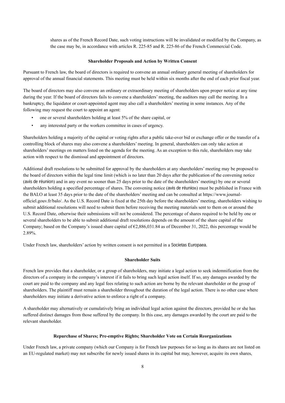 8 shares as of the French Record Date, such voting instructions will be invalidated or modified by the Company, as the case may be, in accordance with articles R. 225-85 and R. 225-86 of the French Commercial Code. Shareholder Proposals and Action by Written Consent Pursuant to French law, the board of directors is required to convene an annual ordinary general meeting of shareholders for approval of the annual financial statements. This meeting must be held within six months after the end of each prior fiscal year. The board of directors may also convene an ordinary or extraordinary meeting of shareholders upon proper notice at any time during the year. If the board of directors fails to convene a shareholders’ meeting, the auditors may call the meeting. In a bankruptcy, the liquidator or court-appointed agent may also call a shareholders’ meeting in some instances. Any of the following may request the court to appoint an agent: • one or several shareholders holding at least 5% of the share capital, or •  any interested party or the workers committee in cases of urgency. Shareholders holding a majority of the capital or voting rights after a public take-over bid or exchange offer or the transfer of a controlling block of shares may also convene a shareholders’ meeting. In general, shareholders can only take action at shareholders’ meetings on matters listed on the agenda for the meeting. As an exception to this rule, shareholders may take action with respect to the dismissal and appointment of directors. Additional draft resolutions to be submitted for approval by the shareholders at any shareholders’ meeting may be proposed to the board of directors within the legal time limit (which is no later than 20 days after the publication of the convening notice (avis de réunion) and in any event no sooner than 25 days prior to the date of the shareholders’ meeting) by one or several shareholders holding a specified percentage of shares. The convening notice (avis de réunion) must be published in France with the BALO at least 35 days prior to the date of the shareholders’ meeting and can be consulted at https://www.journal- officiel.gouv.fr/balo/. As the U.S. Record Date is fixed at the 25th day before the shareholders’ meeting, shareholders wishing to submit additional resolutions will need to submit them before receiving the meeting materials sent to them on or around the U.S. Record Date, otherwise their submissions will not be considered. The percentage of shares required to be held by one or several shareholders to be able to submit additional draft resolutions depends on the amount of the share capital of the Company; based on the Company’s issued share capital of €2,886,031.84 as of December 31, 2022, this percentage would be 2.89%. Under French law, shareholders’ action by written consent is not permitted in a Societas Europaea. Shareholder Suits French law provides that a shareholder, or a group of shareholders, may initiate a legal action to seek indemnification from the directors of a company in the company’s interest if it fails to bring such legal action itself. If so, any damages awarded by the court are paid to the company and any legal fees relating to such action are borne by the relevant shareholder or the group of shareholders. The plaintiff must remain a shareholder throughout the duration of the legal action. There is no other case where shareholders may initiate a derivative action to enforce a right of a company. A shareholder may alternatively or cumulatively bring an individual legal action against the directors, provided he or she has suffered distinct damages from those suffered by the company. In this case, any damages awarded by the court are paid to the relevant shareholder. Repurchase of Shares; Pre-emptive Rights; Shareholder Vote on Certain Reorganizations Under French law, a private company (which our Company is for French law purposes for so long as its shares are not listed on an EU-regulated market) may not subscribe for newly issued shares in its capital but may, however, acquire its own shares,