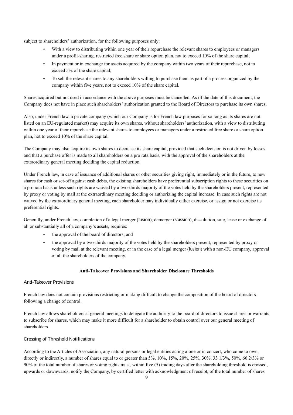 9 subject to shareholders’ authorization, for the following purposes only: • With a view to distributing within one year of their repurchase the relevant shares to employees or managers under a profit-sharing, restricted free share or share option plan, not to exceed 10% of the share capital; • In payment or in exchange for assets acquired by the company within two years of their repurchase, not to exceed 5% of the share capital; • To sell the relevant shares to any shareholders willing to purchase them as part of a process organized by the company within five years, not to exceed 10% of the share capital. Shares acquired but not used in accordance with the above purposes must be cancelled. As of the date of this document, the Company does not have in place such shareholders’ authorization granted to the Board of Directors to purchase its own shares. Also, under French law, a private company (which our Company is for French law purposes for so long as its shares are not listed on an EU-regulated market) may acquire its own shares, without shareholders’ authorization, with a view to distributing within one year of their repurchase the relevant shares to employees or managers under a restricted free share or share option plan, not to exceed 10% of the share capital. The Company may also acquire its own shares to decrease its share capital, provided that such decision is not driven by losses and that a purchase offer is made to all shareholders on a pro rata basis, with the approval of the shareholders at the extraordinary general meeting deciding the capital reduction. Under French law, in case of issuance of additional shares or other securities giving right, immediately or in the future, to new shares for cash or set-off against cash debts, the existing shareholders have preferential subscription rights to these securities on a pro rata basis unless such rights are waived by a two-thirds majority of the votes held by the shareholders present, represented by proxy or voting by mail at the extraordinary meeting deciding or authorizing the capital increase. In case such rights are not waived by the extraordinary general meeting, each shareholder may individually either exercise, or assign or not exercise its preferential rights. Generally, under French law, completion of a legal merger (fusion), demerger (scission), dissolution, sale, lease or exchange of all or substantially all of a company’s assets, requires: •  the approval of the board of directors; and •  the approval by a two-thirds majority of the votes held by the shareholders present, represented by proxy or voting by mail at the relevant meeting, or in the case of a legal merger (fusion) with a non-EU company, approval of all the shareholders of the company. Anti-Takeover Provisions and Shareholder Disclosure Thresholds Anti-Takeover Provisions French law does not contain provisions restricting or making difficult to change the composition of the board of directors following a change of control. French law allows shareholders at general meetings to delegate the authority to the board of directors to issue shares or warrants to subscribe for shares, which may make it more difficult for a shareholder to obtain control over our general meeting of shareholders. Crossing of Threshold Notifications According to the Articles of Association, any natural persons or legal entities acting alone or in concert, who come to own, directly or indirectly, a number of shares equal to or greater than 5%, 10%, 15%, 20%, 25%, 30%, 33 1/3%, 50%, 66 2/3% or 90% of the total number of shares or voting rights must, within five (5) trading days after the shareholding threshold is crossed, upwards or downwards, notify the Company, by certified letter with acknowledgment of receipt, of the total number of shares
