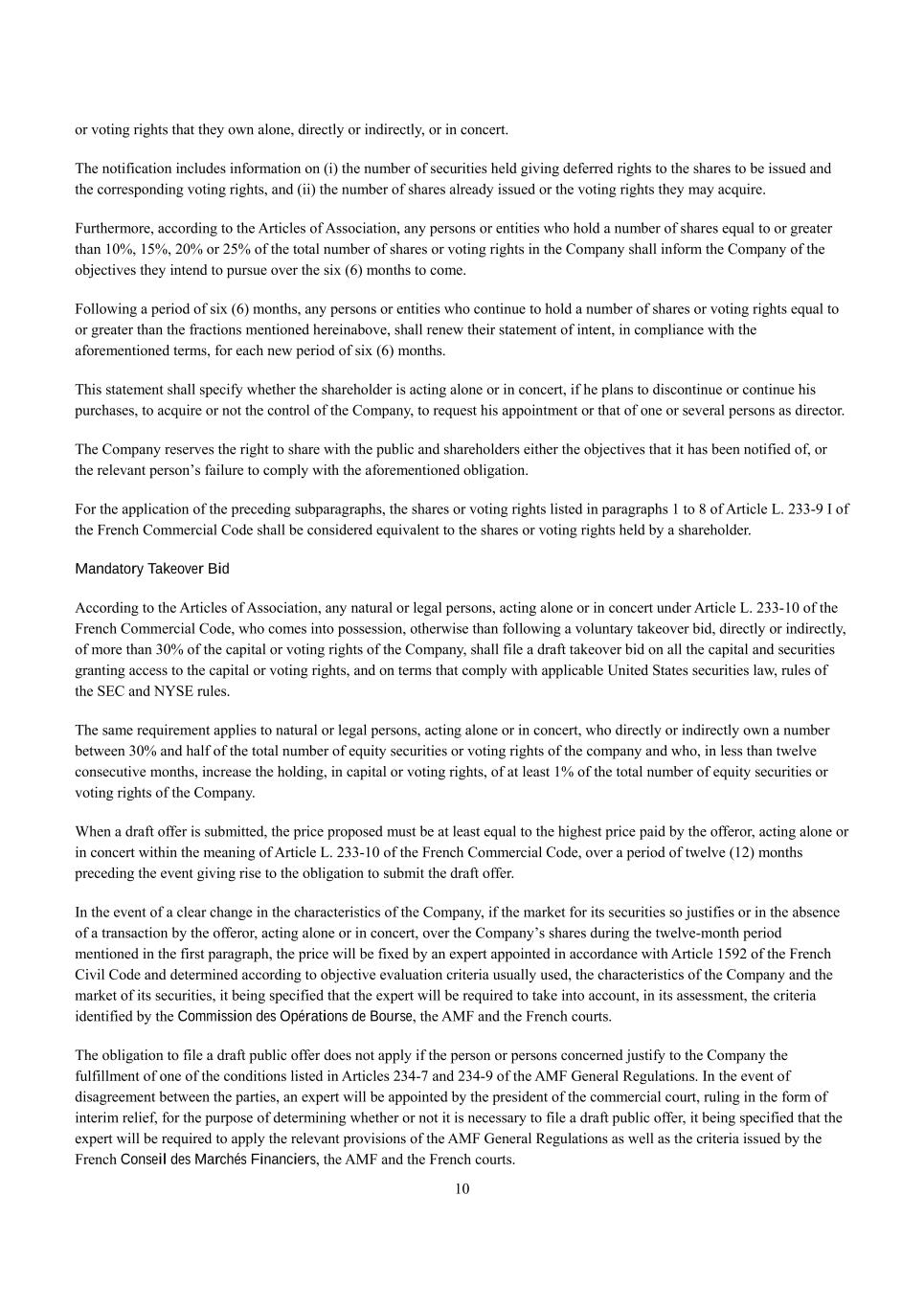10 or voting rights that they own alone, directly or indirectly, or in concert. The notification includes information on (i) the number of securities held giving deferred rights to the shares to be issued and the corresponding voting rights, and (ii) the number of shares already issued or the voting rights they may acquire. Furthermore, according to the Articles of Association, any persons or entities who hold a number of shares equal to or greater than 10%, 15%, 20% or 25% of the total number of shares or voting rights in the Company shall inform the Company of the objectives they intend to pursue over the six (6) months to come. Following a period of six (6) months, any persons or entities who continue to hold a number of shares or voting rights equal to or greater than the fractions mentioned hereinabove, shall renew their statement of intent, in compliance with the aforementioned terms, for each new period of six (6) months. This statement shall specify whether the shareholder is acting alone or in concert, if he plans to discontinue or continue his purchases, to acquire or not the control of the Company, to request his appointment or that of one or several persons as director. The Company reserves the right to share with the public and shareholders either the objectives that it has been notified of, or the relevant person’s failure to comply with the aforementioned obligation. For the application of the preceding subparagraphs, the shares or voting rights listed in paragraphs 1 to 8 of Article L. 233-9 I of the French Commercial Code shall be considered equivalent to the shares or voting rights held by a shareholder. Mandatory Takeover Bid According to the Articles of Association, any natural or legal persons, acting alone or in concert under Article L. 233-10 of the French Commercial Code, who comes into possession, otherwise than following a voluntary takeover bid, directly or indirectly, of more than 30% of the capital or voting rights of the Company, shall file a draft takeover bid on all the capital and securities granting access to the capital or voting rights, and on terms that comply with applicable United States securities law, rules of the SEC and NYSE rules. The same requirement applies to natural or legal persons, acting alone or in concert, who directly or indirectly own a number between 30% and half of the total number of equity securities or voting rights of the company and who, in less than twelve consecutive months, increase the holding, in capital or voting rights, of at least 1% of the total number of equity securities or voting rights of the Company. When a draft offer is submitted, the price proposed must be at least equal to the highest price paid by the offeror, acting alone or in concert within the meaning of Article L. 233-10 of the French Commercial Code, over a period of twelve (12) months preceding the event giving rise to the obligation to submit the draft offer. In the event of a clear change in the characteristics of the Company, if the market for its securities so justifies or in the absence of a transaction by the offeror, acting alone or in concert, over the Company’s shares during the twelve-month period mentioned in the first paragraph, the price will be fixed by an expert appointed in accordance with Article 1592 of the French Civil Code and determined according to objective evaluation criteria usually used, the characteristics of the Company and the market of its securities, it being specified that the expert will be required to take into account, in its assessment, the criteria identified by the Commission des Opérations de Bourse, the AMF and the French courts. The obligation to file a draft public offer does not apply if the person or persons concerned justify to the Company the fulfillment of one of the conditions listed in Articles 234-7 and 234-9 of the AMF General Regulations. In the event of disagreement between the parties, an expert will be appointed by the president of the commercial court, ruling in the form of interim relief, for the purpose of determining whether or not it is necessary to file a draft public offer, it being specified that the expert will be required to apply the relevant provisions of the AMF General Regulations as well as the criteria issued by the French Conseil des Marchés Financiers, the AMF and the French courts.