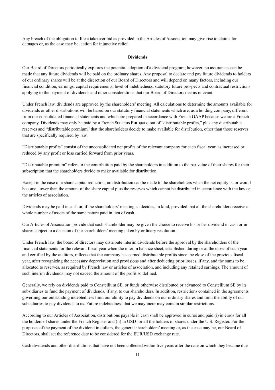 11 Any breach of the obligation to file a takeover bid as provided in the Articles of Association may give rise to claims for damages or, as the case may be, action for injunctive relief. Dividends Our Board of Directors periodically explores the potential adoption of a dividend program; however, no assurances can be made that any future dividends will be paid on the ordinary shares. Any proposal to declare and pay future dividends to holders of our ordinary shares will be at the discretion of our Board of Directors and will depend on many factors, including our financial condition, earnings, capital requirements, level of indebtedness, statutory future prospects and contractual restrictions applying to the payment of dividends and other considerations that our Board of Directors deems relevant. Under French law, dividends are approved by the shareholders’ meeting. All calculations to determine the amounts available for dividends or other distributions will be based on our statutory financial statements which are, as a holding company, different from our consolidated financial statements and which are prepared in accordance with French GAAP because we are a French company. Dividends may only be paid by a French Societas Europaea out of “distributable profits,” plus any distributable reserves and “distributable premium” that the shareholders decide to make available for distribution, other than those reserves that are specifically required by law. “Distributable profits” consist of the unconsolidated net profits of the relevant company for each fiscal year, as increased or reduced by any profit or loss carried forward from prior years. “Distributable premium” refers to the contribution paid by the shareholders in addition to the par value of their shares for their subscription that the shareholders decide to make available for distribution. Except in the case of a share capital reduction, no distribution can be made to the shareholders when the net equity is, or would become, lower than the amount of the share capital plus the reserves which cannot be distributed in accordance with the law or the articles of association. Dividends may be paid in cash or, if the shareholders’ meeting so decides, in kind, provided that all the shareholders receive a whole number of assets of the same nature paid in lieu of cash. Our Articles of Association provide that each shareholder may be given the choice to receive his or her dividend in cash or in shares subject to a decision of the shareholders’ meeting taken by ordinary resolution. Under French law, the board of directors may distribute interim dividends before the approval by the shareholders of the financial statements for the relevant fiscal year when the interim balance sheet, established during or at the close of such year and certified by the auditors, reflects that the company has earned distributable profits since the close of the previous fiscal year, after recognizing the necessary depreciation and provisions and after deducting prior losses, if any, and the sums to be allocated to reserves, as required by French law or articles of association, and including any retained earnings. The amount of such interim dividends may not exceed the amount of the profit so defined. Generally, we rely on dividends paid to Constellium SE, or funds otherwise distributed or advanced to Constellium SE by its subsidiaries to fund the payment of dividends, if any, to our shareholders. In addition, restrictions contained in the agreements governing our outstanding indebtedness limit our ability to pay dividends on our ordinary shares and limit the ability of our subsidiaries to pay dividends to us. Future indebtedness that we may incur may contain similar restrictions. According to our Articles of Association, distributions payable in cash shall be approved in euros and paid (i) in euros for all the holders of shares under the French Register and (ii) in USD for all the holders of shares under the U.S. Register. For the purposes of the payment of the dividend in dollars, the general shareholders’ meeting or, as the case may be, our Board of Directors, shall set the reference date to be considered for the EUR/USD exchange rate. Cash dividends and other distributions that have not been collected within five years after the date on which they became due