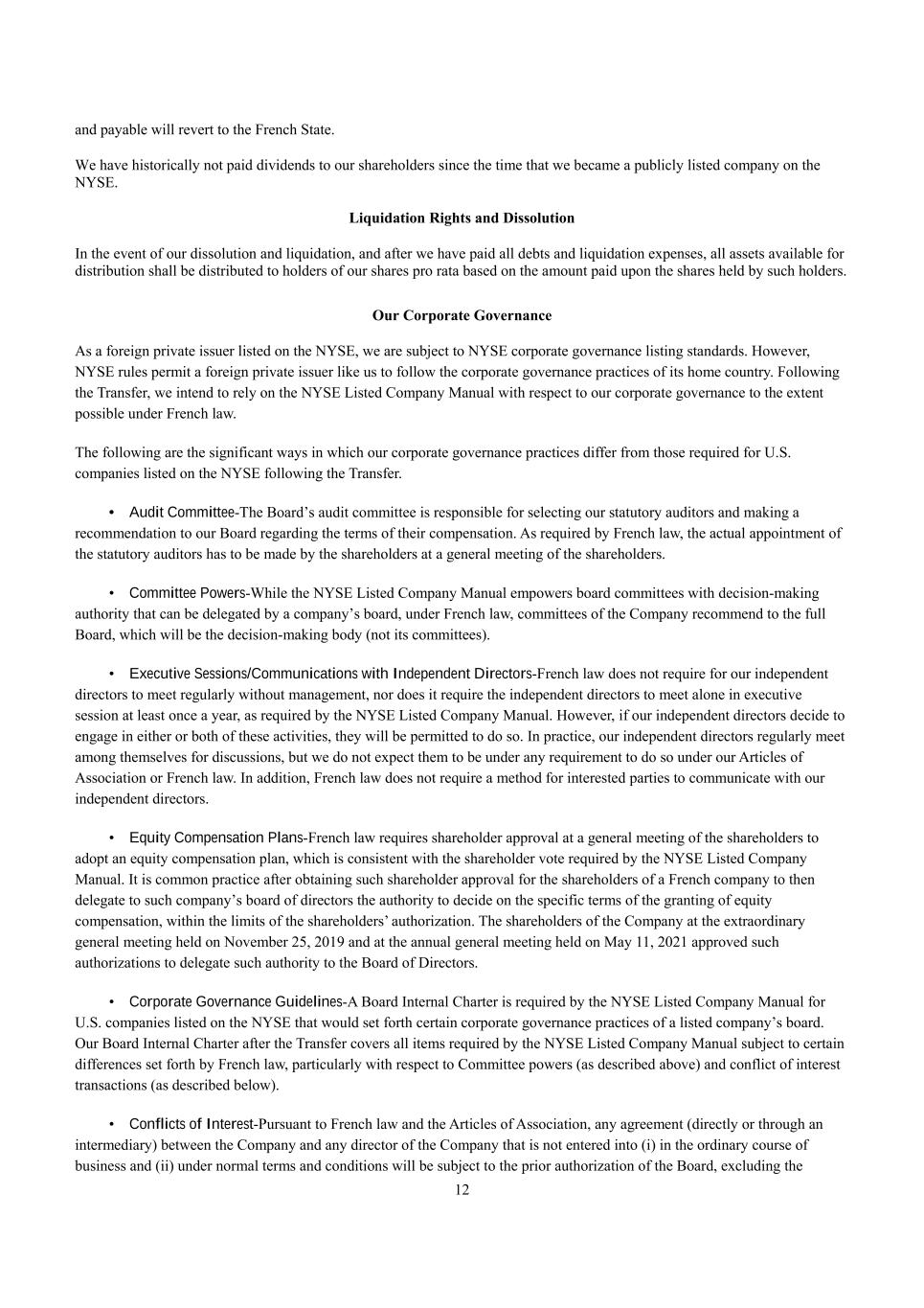 12 and payable will revert to the French State. We have historically not paid dividends to our shareholders since the time that we became a publicly listed company on the NYSE. Liquidation Rights and Dissolution In the event of our dissolution and liquidation, and after we have paid all debts and liquidation expenses, all assets available for distribution shall be distributed to holders of our shares pro rata based on the amount paid upon the shares held by such holders. Our Corporate Governance As a foreign private issuer listed on the NYSE, we are subject to NYSE corporate governance listing standards. However, NYSE rules permit a foreign private issuer like us to follow the corporate governance practices of its home country. Following the Transfer, we intend to rely on the NYSE Listed Company Manual with respect to our corporate governance to the extent possible under French law. The following are the significant ways in which our corporate governance practices differ from those required for U.S. companies listed on the NYSE following the Transfer. • Audit Committee-The Board’s audit committee is responsible for selecting our statutory auditors and making a recommendation to our Board regarding the terms of their compensation. As required by French law, the actual appointment of the statutory auditors has to be made by the shareholders at a general meeting of the shareholders. • Committee Powers-While the NYSE Listed Company Manual empowers board committees with decision-making authority that can be delegated by a company’s board, under French law, committees of the Company recommend to the full Board, which will be the decision-making body (not its committees). • Executive Sessions/Communications with Independent Directors-French law does not require for our independent directors to meet regularly without management, nor does it require the independent directors to meet alone in executive session at least once a year, as required by the NYSE Listed Company Manual. However, if our independent directors decide to engage in either or both of these activities, they will be permitted to do so. In practice, our independent directors regularly meet among themselves for discussions, but we do not expect them to be under any requirement to do so under our Articles of Association or French law. In addition, French law does not require a method for interested parties to communicate with our independent directors. • Equity Compensation Plans-French law requires shareholder approval at a general meeting of the shareholders to adopt an equity compensation plan, which is consistent with the shareholder vote required by the NYSE Listed Company Manual. It is common practice after obtaining such shareholder approval for the shareholders of a French company to then delegate to such company’s board of directors the authority to decide on the specific terms of the granting of equity compensation, within the limits of the shareholders’ authorization. The shareholders of the Company at the extraordinary general meeting held on November 25, 2019 and at the annual general meeting held on May 11, 2021 approved such authorizations to delegate such authority to the Board of Directors. • Corporate Governance Guidelines-A Board Internal Charter is required by the NYSE Listed Company Manual for U.S. companies listed on the NYSE that would set forth certain corporate governance practices of a listed company’s board. Our Board Internal Charter after the Transfer covers all items required by the NYSE Listed Company Manual subject to certain differences set forth by French law, particularly with respect to Committee powers (as described above) and conflict of interest transactions (as described below). • Conflicts of Interest-Pursuant to French law and the Articles of Association, any agreement (directly or through an intermediary) between the Company and any director of the Company that is not entered into (i) in the ordinary course of business and (ii) under normal terms and conditions will be subject to the prior authorization of the Board, excluding the