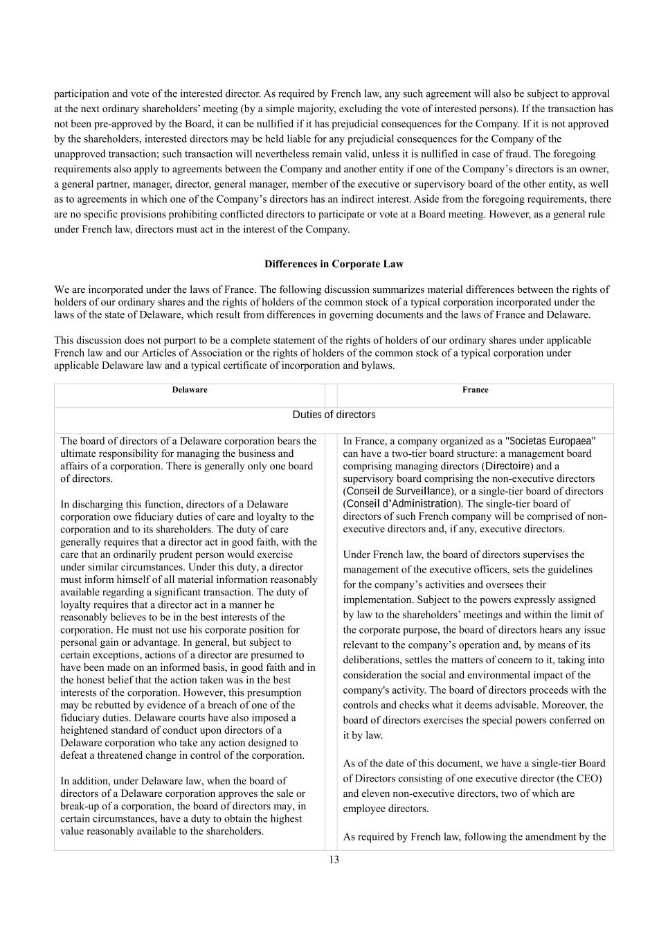 13 participation and vote of the interested director. As required by French law, any such agreement will also be subject to approval at the next ordinary shareholders’ meeting (by a simple majority, excluding the vote of interested persons). If the transaction has not been pre-approved by the Board, it can be nullified if it has prejudicial consequences for the Company. If it is not approved by the shareholders, interested directors may be held liable for any prejudicial consequences for the Company of the unapproved transaction; such transaction will nevertheless remain valid, unless it is nullified in case of fraud. The foregoing requirements also apply to agreements between the Company and another entity if one of the Company’s directors is an owner, a general partner, manager, director, general manager, member of the executive or supervisory board of the other entity, as well as to agreements in which one of the Company’s directors has an indirect interest. Aside from the foregoing requirements, there are no specific provisions prohibiting conflicted directors to participate or vote at a Board meeting. However, as a general rule under French law, directors must act in the interest of the Company. Differences in Corporate Law We are incorporated under the laws of France. The following discussion summarizes material differences between the rights of holders of our ordinary shares and the rights of holders of the common stock of a typical corporation incorporated under the laws of the state of Delaware, which result from differences in governing documents and the laws of France and Delaware. This discussion does not purport to be a complete statement of the rights of holders of our ordinary shares under applicable French law and our Articles of Association or the rights of holders of the common stock of a typical corporation under applicable Delaware law and a typical certificate of incorporation and bylaws. Delaware France Duties of directors The board of directors of a Delaware corporation bears the ultimate responsibility for managing the business and affairs of a corporation. There is generally only one board of directors. In discharging this function, directors of a Delaware corporation owe fiduciary duties of care and loyalty to the corporation and to its shareholders. The duty of care generally requires that a director act in good faith, with the care that an ordinarily prudent person would exercise under similar circumstances. Under this duty, a director must inform himself of all material information reasonably available regarding a significant transaction. The duty of loyalty requires that a director act in a manner he reasonably believes to be in the best interests of the corporation. He must not use his corporate position for personal gain or advantage. In general, but subject to certain exceptions, actions of a director are presumed to have been made on an informed basis, in good faith and in the honest belief that the action taken was in the best interests of the corporation. However, this presumption may be rebutted by evidence of a breach of one of the fiduciary duties. Delaware courts have also imposed a heightened standard of conduct upon directors of a Delaware corporation who take any action designed to defeat a threatened change in control of the corporation. In addition, under Delaware law, when the board of directors of a Delaware corporation approves the sale or break-up of a corporation, the board of directors may, in certain circumstances, have a duty to obtain the highest value reasonably available to the shareholders. In France, a company organized as a "Societas Europaea" can have a two-tier board structure: a management board comprising managing directors (Directoire) and a supervisory board comprising the non-executive directors (Conseil de Surveillance), or a single-tier board of directors (Conseil d’Administration). The single-tier board of directors of such French company will be comprised of non- executive directors and, if any, executive directors. Under French law, the board of directors supervises the management of the executive officers, sets the guidelines for the company’s activities and oversees their implementation. Subject to the powers expressly assigned by law to the shareholders’ meetings and within the limit of the corporate purpose, the board of directors hears any issue relevant to the company’s operation and, by means of its deliberations, settles the matters of concern to it, taking into consideration the social and environmental impact of the company's activity. The board of directors proceeds with the controls and checks what it deems advisable. Moreover, the board of directors exercises the special powers conferred on it by law. As of the date of this document, we have a single-tier Board of Directors consisting of one executive director (the CEO) and eleven non-executive directors, two of which are employee directors. As required by French law, following the amendment by the