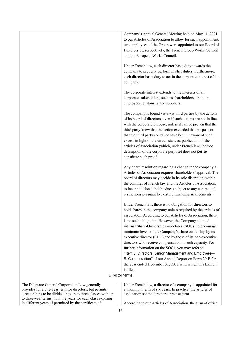 14 Company’s Annual General Meeting held on May 11, 2021 to our Articles of Association to allow for such appointment, two employees of the Group were appointed to our Board of Directors by, respectively, the French Group Works Council and the European Works Council. Under French law, each director has a duty towards the company to properly perform his/her duties. Furthermore, each director has a duty to act in the corporate interest of the company. The corporate interest extends to the interests of all corporate stakeholders, such as shareholders, creditors, employees, customers and suppliers. The company is bound vis-à-vis third parties by the actions of its board of directors, even if such actions are not in line with the corporate purpose, unless it can be proven that the third party knew that the action exceeded that purpose or that the third party could not have been unaware of such excess in light of the circumstances; publication of the articles of association (which, under French law, include description of the corporate purpose) does not per se constitute such proof. Any board resolution regarding a change in the company’s Articles of Association requires shareholders’ approval. The board of directors may decide in its sole discretion, within the confines of French law and the Articles of Association, to incur additional indebtedness subject to any contractual restrictions pursuant to existing financing arrangements. Under French law, there is no obligation for directors to hold shares in the company unless required by the articles of association. According to our Articles of Association, there is no such obligation. However, the Company adopted internal Share-Ownership Guidelines (SOGs) to encourage minimum levels of the Company’s share ownership by its executive director (CEO) and by those of its non-executive directors who receive compensation in such capacity. For further information on the SOGs, you may refer to “Item 6. Directors, Senior Management and Employees— B. Compensation” of our Annual Report on Form 20-F for the year ended December 31, 2022 with which this Exhibit is filed. Director terms The Delaware General Corporation Law generally provides for a one-year term for directors, but permits directorships to be divided into up to three classes with up to three-year terms, with the years for each class expiring in different years, if permitted by the certificate of Under French law, a director of a company is appointed for a maximum term of six years. In practice, the articles of association set the directors’ precise term. According to our Articles of Association, the term of office