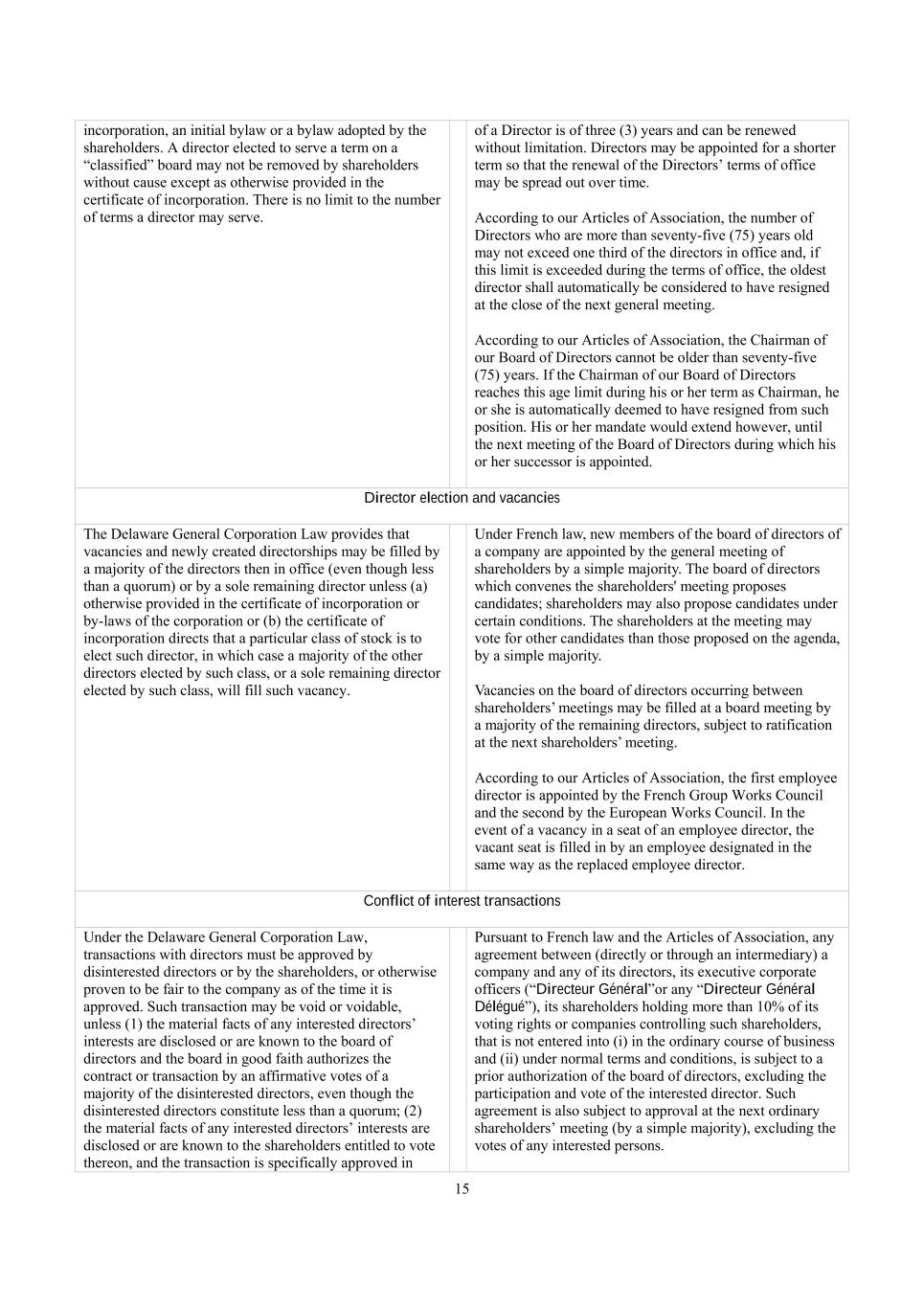 15 incorporation, an initial bylaw or a bylaw adopted by the shareholders. A director elected to serve a term on a “classified” board may not be removed by shareholders without cause except as otherwise provided in the certificate of incorporation. There is no limit to the number of terms a director may serve. of a Director is of three (3) years and can be renewed without limitation. Directors may be appointed for a shorter term so that the renewal of the Directors’ terms of office may be spread out over time. According to our Articles of Association, the number of Directors who are more than seventy-five (75) years old may not exceed one third of the directors in office and, if this limit is exceeded during the terms of office, the oldest director shall automatically be considered to have resigned at the close of the next general meeting. According to our Articles of Association, the Chairman of our Board of Directors cannot be older than seventy-five (75) years. If the Chairman of our Board of Directors reaches this age limit during his or her term as Chairman, he or she is automatically deemed to have resigned from such position. His or her mandate would extend however, until the next meeting of the Board of Directors during which his or her successor is appointed. Director election and vacancies The Delaware General Corporation Law provides that vacancies and newly created directorships may be filled by a majority of the directors then in office (even though less than a quorum) or by a sole remaining director unless (a) otherwise provided in the certificate of incorporation or by-laws of the corporation or (b) the certificate of incorporation directs that a particular class of stock is to elect such director, in which case a majority of the other directors elected by such class, or a sole remaining director elected by such class, will fill such vacancy. Under French law, new members of the board of directors of a company are appointed by the general meeting of shareholders by a simple majority. The board of directors which convenes the shareholders' meeting proposes candidates; shareholders may also propose candidates under certain conditions. The shareholders at the meeting may vote for other candidates than those proposed on the agenda, by a simple majority. Vacancies on the board of directors occurring between shareholders’ meetings may be filled at a board meeting by a majority of the remaining directors, subject to ratification at the next shareholders’ meeting. According to our Articles of Association, the first employee director is appointed by the French Group Works Council and the second by the European Works Council. In the event of a vacancy in a seat of an employee director, the vacant seat is filled in by an employee designated in the same way as the replaced employee director. Conflict of interest transactions Under the Delaware General Corporation Law, transactions with directors must be approved by disinterested directors or by the shareholders, or otherwise proven to be fair to the company as of the time it is approved. Such transaction may be void or voidable, unless (1) the material facts of any interested directors’ interests are disclosed or are known to the board of directors and the board in good faith authorizes the contract or transaction by an affirmative votes of a majority of the disinterested directors, even though the disinterested directors constitute less than a quorum; (2) the material facts of any interested directors’ interests are disclosed or are known to the shareholders entitled to vote thereon, and the transaction is specifically approved in Pursuant to French law and the Articles of Association, any agreement between (directly or through an intermediary) a company and any of its directors, its executive corporate officers (“Directeur Général”or any “Directeur Général Délégué”), its shareholders holding more than 10% of its voting rights or companies controlling such shareholders, that is not entered into (i) in the ordinary course of business and (ii) under normal terms and conditions, is subject to a prior authorization of the board of directors, excluding the participation and vote of the interested director. Such agreement is also subject to approval at the next ordinary shareholders’ meeting (by a simple majority), excluding the votes of any interested persons.