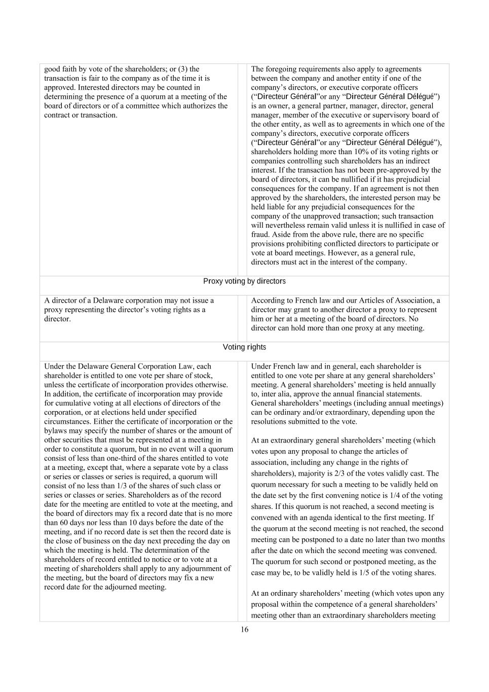 16 good faith by vote of the shareholders; or (3) the transaction is fair to the company as of the time it is approved. Interested directors may be counted in determining the presence of a quorum at a meeting of the board of directors or of a committee which authorizes the contract or transaction. The foregoing requirements also apply to agreements between the company and another entity if one of the company’s directors, or executive corporate officers (“Directeur Général”or any “Directeur Général Délégué”) is an owner, a general partner, manager, director, general manager, member of the executive or supervisory board of the other entity, as well as to agreements in which one of the company’s directors, executive corporate officers (“Directeur Général”or any “Directeur Général Délégué”), shareholders holding more than 10% of its voting rights or companies controlling such shareholders has an indirect interest. If the transaction has not been pre-approved by the board of directors, it can be nullified if it has prejudicial consequences for the company. If an agreement is not then approved by the shareholders, the interested person may be held liable for any prejudicial consequences for the company of the unapproved transaction; such transaction will nevertheless remain valid unless it is nullified in case of fraud. Aside from the above rule, there are no specific provisions prohibiting conflicted directors to participate or vote at board meetings. However, as a general rule, directors must act in the interest of the company. Proxy voting by directors A director of a Delaware corporation may not issue a proxy representing the director’s voting rights as a director. According to French law and our Articles of Association, a director may grant to another director a proxy to represent him or her at a meeting of the board of directors. No director can hold more than one proxy at any meeting. Voting rights Under the Delaware General Corporation Law, each shareholder is entitled to one vote per share of stock, unless the certificate of incorporation provides otherwise. In addition, the certificate of incorporation may provide for cumulative voting at all elections of directors of the corporation, or at elections held under specified circumstances. Either the certificate of incorporation or the bylaws may specify the number of shares or the amount of other securities that must be represented at a meeting in order to constitute a quorum, but in no event will a quorum consist of less than one-third of the shares entitled to vote at a meeting, except that, where a separate vote by a class or series or classes or series is required, a quorum will consist of no less than 1/3 of the shares of such class or series or classes or series. Shareholders as of the record date for the meeting are entitled to vote at the meeting, and the board of directors may fix a record date that is no more than 60 days nor less than 10 days before the date of the meeting, and if no record date is set then the record date is the close of business on the day next preceding the day on which the meeting is held. The determination of the shareholders of record entitled to notice or to vote at a meeting of shareholders shall apply to any adjournment of the meeting, but the board of directors may fix a new record date for the adjourned meeting. Under French law and in general, each shareholder is entitled to one vote per share at any general shareholders’ meeting. A general shareholders’ meeting is held annually to, inter alia, approve the annual financial statements. General shareholders’ meetings (including annual meetings) can be ordinary and/or extraordinary, depending upon the resolutions submitted to the vote. At an extraordinary general shareholders’ meeting (which votes upon any proposal to change the articles of association, including any change in the rights of shareholders), majority is 2/3 of the votes validly cast. The quorum necessary for such a meeting to be validly held on the date set by the first convening notice is 1/4 of the voting shares. If this quorum is not reached, a second meeting is convened with an agenda identical to the first meeting. If the quorum at the second meeting is not reached, the second meeting can be postponed to a date no later than two months after the date on which the second meeting was convened. The quorum for such second or postponed meeting, as the case may be, to be validly held is 1/5 of the voting shares. At an ordinary shareholders’ meeting (which votes upon any proposal within the competence of a general shareholders’ meeting other than an extraordinary shareholders meeting