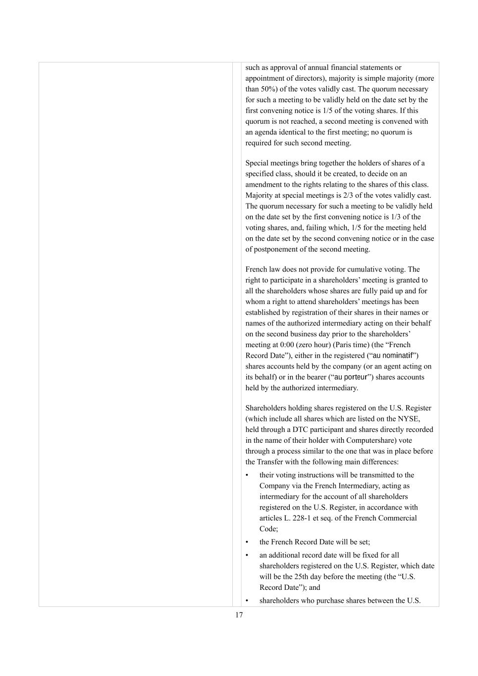17 such as approval of annual financial statements or appointment of directors), majority is simple majority (more than 50%) of the votes validly cast. The quorum necessary for such a meeting to be validly held on the date set by the first convening notice is 1/5 of the voting shares. If this quorum is not reached, a second meeting is convened with an agenda identical to the first meeting; no quorum is required for such second meeting. Special meetings bring together the holders of shares of a specified class, should it be created, to decide on an amendment to the rights relating to the shares of this class. Majority at special meetings is 2/3 of the votes validly cast. The quorum necessary for such a meeting to be validly held on the date set by the first convening notice is 1/3 of the voting shares, and, failing which, 1/5 for the meeting held on the date set by the second convening notice or in the case of postponement of the second meeting. French law does not provide for cumulative voting. The right to participate in a shareholders’ meeting is granted to all the shareholders whose shares are fully paid up and for whom a right to attend shareholders’ meetings has been established by registration of their shares in their names or names of the authorized intermediary acting on their behalf on the second business day prior to the shareholders’ meeting at 0:00 (zero hour) (Paris time) (the “French Record Date”), either in the registered (“au nominatif”) shares accounts held by the company (or an agent acting on its behalf) or in the bearer (“au porteur”) shares accounts held by the authorized intermediary. Shareholders holding shares registered on the U.S. Register (which include all shares which are listed on the NYSE, held through a DTC participant and shares directly recorded in the name of their holder with Computershare) vote through a process similar to the one that was in place before the Transfer with the following main differences: • their voting instructions will be transmitted to the Company via the French Intermediary, acting as intermediary for the account of all shareholders registered on the U.S. Register, in accordance with articles L. 228-1 et seq. of the French Commercial Code; • the French Record Date will be set; • an additional record date will be fixed for all shareholders registered on the U.S. Register, which date will be the 25th day before the meeting (the “U.S. Record Date”); and • shareholders who purchase shares between the U.S.