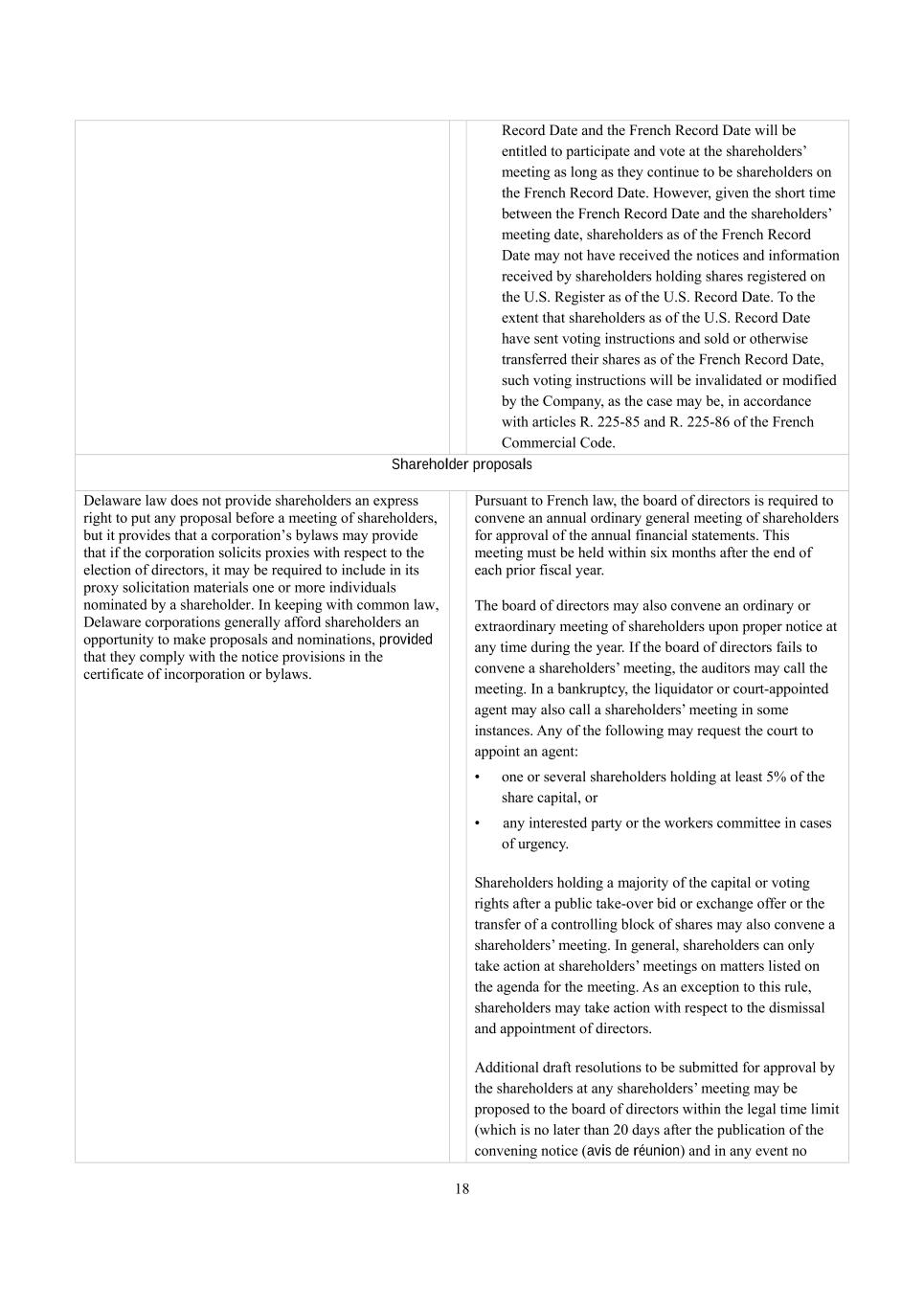 18 Record Date and the French Record Date will be entitled to participate and vote at the shareholders’ meeting as long as they continue to be shareholders on the French Record Date. However, given the short time between the French Record Date and the shareholders’ meeting date, shareholders as of the French Record Date may not have received the notices and information received by shareholders holding shares registered on the U.S. Register as of the U.S. Record Date. To the extent that shareholders as of the U.S. Record Date have sent voting instructions and sold or otherwise transferred their shares as of the French Record Date, such voting instructions will be invalidated or modified by the Company, as the case may be, in accordance with articles R. 225-85 and R. 225-86 of the French Commercial Code. Shareholder proposals Delaware law does not provide shareholders an express right to put any proposal before a meeting of shareholders, but it provides that a corporation’s bylaws may provide that if the corporation solicits proxies with respect to the election of directors, it may be required to include in its proxy solicitation materials one or more individuals nominated by a shareholder. In keeping with common law, Delaware corporations generally afford shareholders an opportunity to make proposals and nominations, provided that they comply with the notice provisions in the certificate of incorporation or bylaws. Pursuant to French law, the board of directors is required to convene an annual ordinary general meeting of shareholders for approval of the annual financial statements. This meeting must be held within six months after the end of each prior fiscal year. The board of directors may also convene an ordinary or extraordinary meeting of shareholders upon proper notice at any time during the year. If the board of directors fails to convene a shareholders’ meeting, the auditors may call the meeting. In a bankruptcy, the liquidator or court-appointed agent may also call a shareholders’ meeting in some instances. Any of the following may request the court to appoint an agent: • one or several shareholders holding at least 5% of the share capital, or •  any interested party or the workers committee in cases of urgency. Shareholders holding a majority of the capital or voting rights after a public take-over bid or exchange offer or the transfer of a controlling block of shares may also convene a shareholders’ meeting. In general, shareholders can only take action at shareholders’ meetings on matters listed on the agenda for the meeting. As an exception to this rule, shareholders may take action with respect to the dismissal and appointment of directors. Additional draft resolutions to be submitted for approval by the shareholders at any shareholders’ meeting may be proposed to the board of directors within the legal time limit (which is no later than 20 days after the publication of the convening notice (avis de réunion) and in any event no
