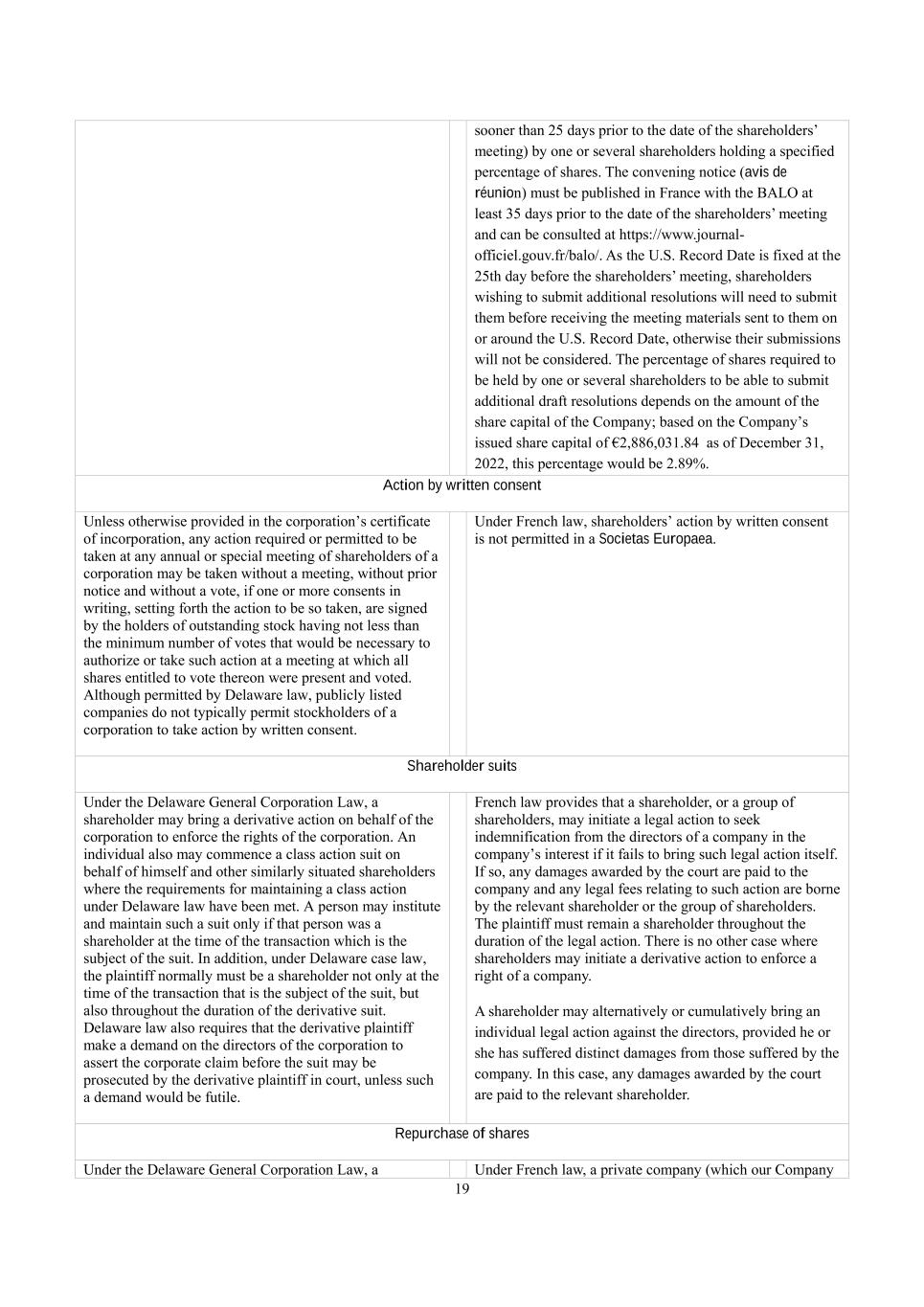 19 sooner than 25 days prior to the date of the shareholders’ meeting) by one or several shareholders holding a specified percentage of shares. The convening notice (avis de réunion) must be published in France with the BALO at least 35 days prior to the date of the shareholders’ meeting and can be consulted at https://www.journal- officiel.gouv.fr/balo/. As the U.S. Record Date is fixed at the 25th day before the shareholders’ meeting, shareholders wishing to submit additional resolutions will need to submit them before receiving the meeting materials sent to them on or around the U.S. Record Date, otherwise their submissions will not be considered. The percentage of shares required to be held by one or several shareholders to be able to submit additional draft resolutions depends on the amount of the share capital of the Company; based on the Company’s issued share capital of €2,886,031.84 as of December 31, 2022, this percentage would be 2.89%. Action by written consent Unless otherwise provided in the corporation’s certificate of incorporation, any action required or permitted to be taken at any annual or special meeting of shareholders of a corporation may be taken without a meeting, without prior notice and without a vote, if one or more consents in writing, setting forth the action to be so taken, are signed by the holders of outstanding stock having not less than the minimum number of votes that would be necessary to authorize or take such action at a meeting at which all shares entitled to vote thereon were present and voted. Although permitted by Delaware law, publicly listed companies do not typically permit stockholders of a corporation to take action by written consent. Under French law, shareholders’ action by written consent is not permitted in a Societas Europaea. Shareholder suits Under the Delaware General Corporation Law, a shareholder may bring a derivative action on behalf of the corporation to enforce the rights of the corporation. An individual also may commence a class action suit on behalf of himself and other similarly situated shareholders where the requirements for maintaining a class action under Delaware law have been met. A person may institute and maintain such a suit only if that person was a shareholder at the time of the transaction which is the subject of the suit. In addition, under Delaware case law, the plaintiff normally must be a shareholder not only at the time of the transaction that is the subject of the suit, but also throughout the duration of the derivative suit. Delaware law also requires that the derivative plaintiff make a demand on the directors of the corporation to assert the corporate claim before the suit may be prosecuted by the derivative plaintiff in court, unless such a demand would be futile. French law provides that a shareholder, or a group of shareholders, may initiate a legal action to seek indemnification from the directors of a company in the company’s interest if it fails to bring such legal action itself. If so, any damages awarded by the court are paid to the company and any legal fees relating to such action are borne by the relevant shareholder or the group of shareholders. The plaintiff must remain a shareholder throughout the duration of the legal action. There is no other case where shareholders may initiate a derivative action to enforce a right of a company. A shareholder may alternatively or cumulatively bring an individual legal action against the directors, provided he or she has suffered distinct damages from those suffered by the company. In this case, any damages awarded by the court are paid to the relevant shareholder. Repurchase of shares Under the Delaware General Corporation Law, a Under French law, a private company (which our Company