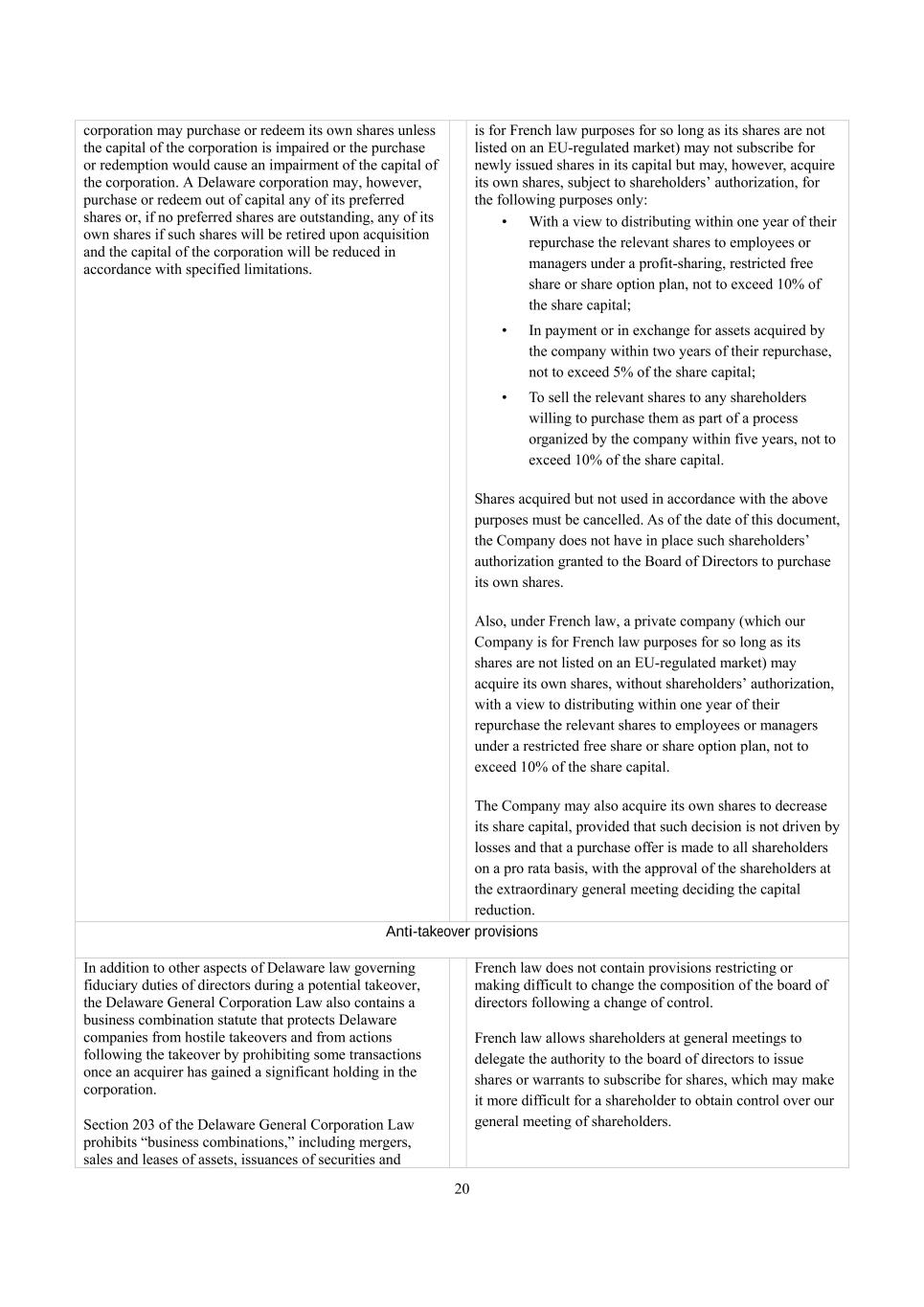 20 corporation may purchase or redeem its own shares unless the capital of the corporation is impaired or the purchase or redemption would cause an impairment of the capital of the corporation. A Delaware corporation may, however, purchase or redeem out of capital any of its preferred shares or, if no preferred shares are outstanding, any of its own shares if such shares will be retired upon acquisition and the capital of the corporation will be reduced in accordance with specified limitations. is for French law purposes for so long as its shares are not listed on an EU-regulated market) may not subscribe for newly issued shares in its capital but may, however, acquire its own shares, subject to shareholders’ authorization, for the following purposes only: • With a view to distributing within one year of their repurchase the relevant shares to employees or managers under a profit-sharing, restricted free share or share option plan, not to exceed 10% of the share capital; • In payment or in exchange for assets acquired by the company within two years of their repurchase, not to exceed 5% of the share capital; • To sell the relevant shares to any shareholders willing to purchase them as part of a process organized by the company within five years, not to exceed 10% of the share capital. Shares acquired but not used in accordance with the above purposes must be cancelled. As of the date of this document, the Company does not have in place such shareholders’ authorization granted to the Board of Directors to purchase its own shares. Also, under French law, a private company (which our Company is for French law purposes for so long as its shares are not listed on an EU-regulated market) may acquire its own shares, without shareholders’ authorization, with a view to distributing within one year of their repurchase the relevant shares to employees or managers under a restricted free share or share option plan, not to exceed 10% of the share capital. The Company may also acquire its own shares to decrease its share capital, provided that such decision is not driven by losses and that a purchase offer is made to all shareholders on a pro rata basis, with the approval of the shareholders at the extraordinary general meeting deciding the capital reduction. Anti-takeover provisions In addition to other aspects of Delaware law governing fiduciary duties of directors during a potential takeover, the Delaware General Corporation Law also contains a business combination statute that protects Delaware companies from hostile takeovers and from actions following the takeover by prohibiting some transactions once an acquirer has gained a significant holding in the corporation. Section 203 of the Delaware General Corporation Law prohibits “business combinations,” including mergers, sales and leases of assets, issuances of securities and French law does not contain provisions restricting or making difficult to change the composition of the board of directors following a change of control. French law allows shareholders at general meetings to delegate the authority to the board of directors to issue shares or warrants to subscribe for shares, which may make it more difficult for a shareholder to obtain control over our general meeting of shareholders.
