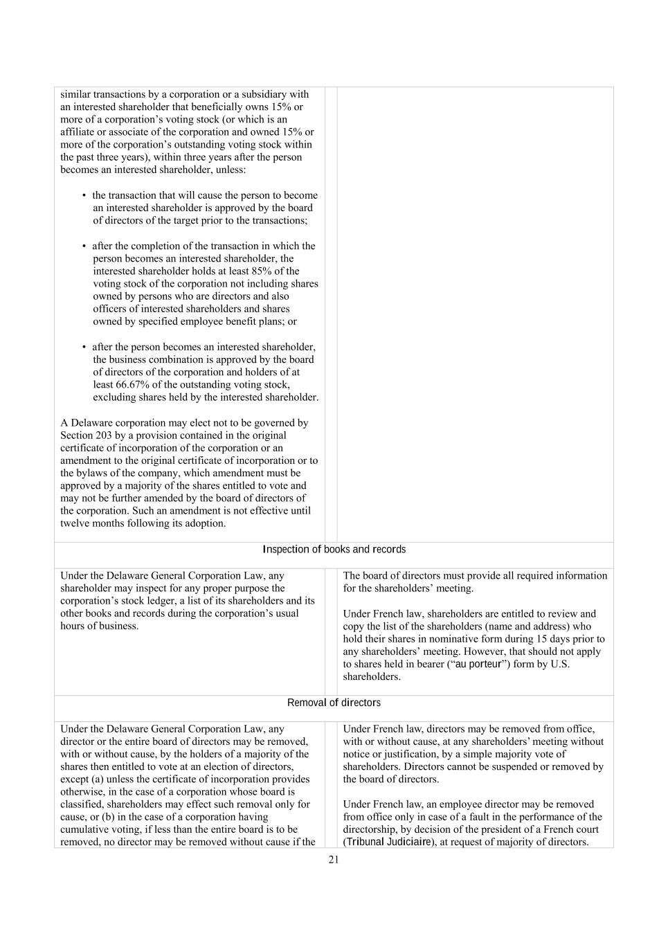 21 similar transactions by a corporation or a subsidiary with an interested shareholder that beneficially owns 15% or more of a corporation’s voting stock (or which is an affiliate or associate of the corporation and owned 15% or more of the corporation’s outstanding voting stock within the past three years), within three years after the person becomes an interested shareholder, unless: •  the transaction that will cause the person to become an interested shareholder is approved by the board of directors of the target prior to the transactions; •  after the completion of the transaction in which the person becomes an interested shareholder, the interested shareholder holds at least 85% of the voting stock of the corporation not including shares owned by persons who are directors and also officers of interested shareholders and shares owned by specified employee benefit plans; or •  after the person becomes an interested shareholder, the business combination is approved by the board of directors of the corporation and holders of at least 66.67% of the outstanding voting stock, excluding shares held by the interested shareholder. A Delaware corporation may elect not to be governed by Section 203 by a provision contained in the original certificate of incorporation of the corporation or an amendment to the original certificate of incorporation or to the bylaws of the company, which amendment must be approved by a majority of the shares entitled to vote and may not be further amended by the board of directors of the corporation. Such an amendment is not effective until twelve months following its adoption. Inspection of books and records Under the Delaware General Corporation Law, any shareholder may inspect for any proper purpose the corporation’s stock ledger, a list of its shareholders and its other books and records during the corporation’s usual hours of business. The board of directors must provide all required information for the shareholders’ meeting. Under French law, shareholders are entitled to review and copy the list of the shareholders (name and address) who hold their shares in nominative form during 15 days prior to any shareholders’ meeting. However, that should not apply to shares held in bearer (“au porteur”) form by U.S. shareholders. Removal of directors Under the Delaware General Corporation Law, any director or the entire board of directors may be removed, with or without cause, by the holders of a majority of the shares then entitled to vote at an election of directors, except (a) unless the certificate of incorporation provides otherwise, in the case of a corporation whose board is classified, shareholders may effect such removal only for cause, or (b) in the case of a corporation having cumulative voting, if less than the entire board is to be removed, no director may be removed without cause if the Under French law, directors may be removed from office, with or without cause, at any shareholders’ meeting without notice or justification, by a simple majority vote of shareholders. Directors cannot be suspended or removed by the board of directors. Under French law, an employee director may be removed from office only in case of a fault in the performance of the directorship, by decision of the president of a French court (Tribunal Judiciaire), at request of majority of directors.